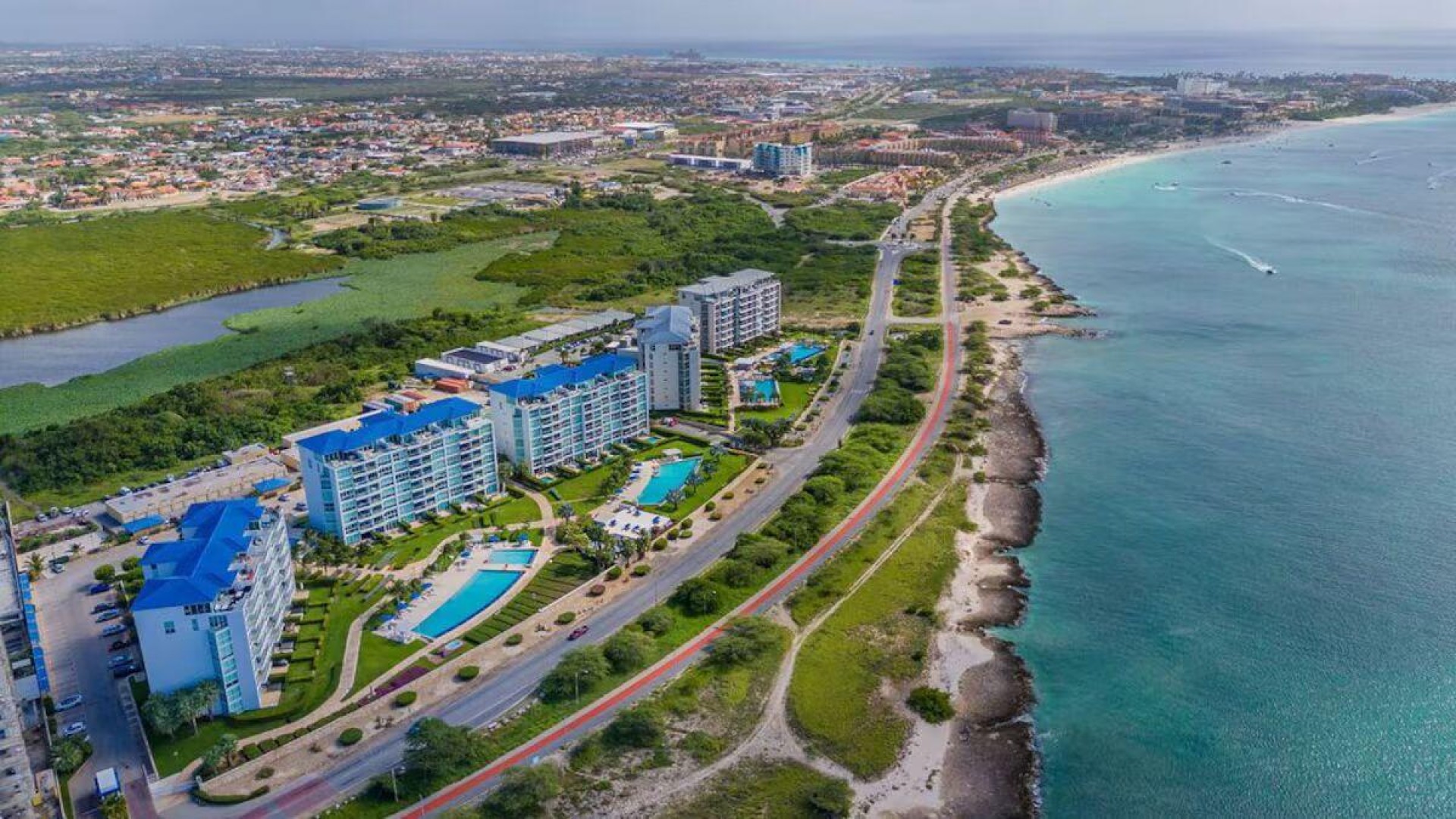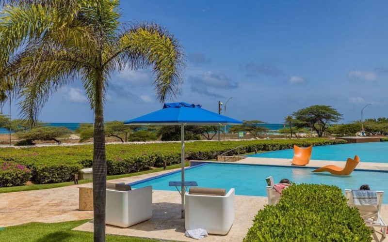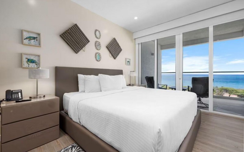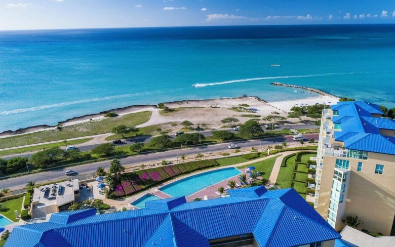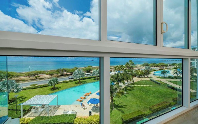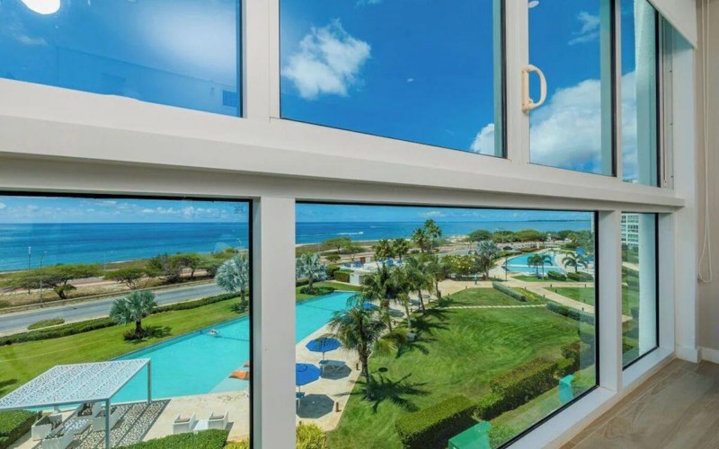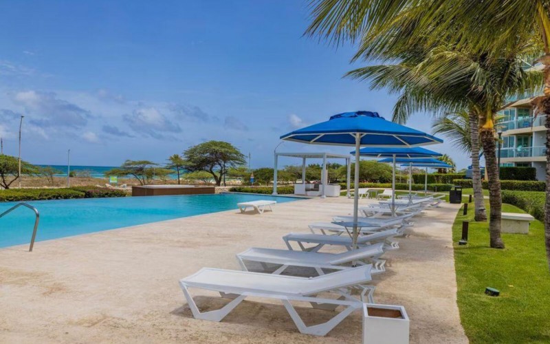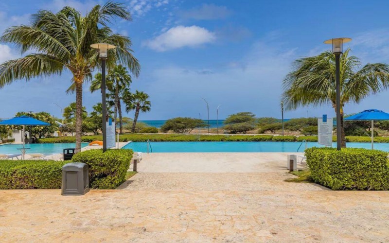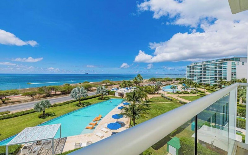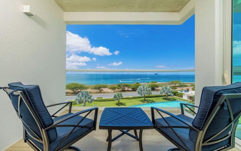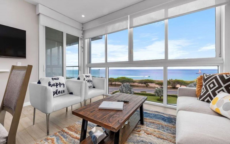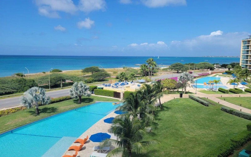 Enjoy the luxury of swimming in a pool with a stunning ocean view or taking a peaceful stroll along the beach. Stay in style in this bright and spacious condo, just a short walk from Eagle Beach and Palm Beach. From this 4th-floor location, you’ll be treated to breathtaking panoramic sea views, a private balcony, and resort-like amenities including a fitness center, hot tub, two swimming pools, 24-hour security, and concierge services. For those on a workcation, there’s a dedicated workstation and high-speed Wi-Fi perfect for remote work. Centrally located between Eagle Beach and Palm Beach, this condo offers easy access to a variety of restaurants and bars within walking distance. Scooters and bikes are available at the entrance, making getting around quick and convenient. You’ll also have four beach chairs, a cooler with wheels, toys, and floats to make your beach days even more enjoyable. This 2-bedroom unit comfortably sleeps 6 with one king bed and two double beds. The fully equipped kitchen provides everything you need to prepare meals, which you can enjoy on the balcony while taking in the perfect sunset view. The condo also features a brand-new full-size washer and dryer, an iron, and ironing board. With plenty of closet and drawer space, you'll have room to unpack and settle in. The two bathrooms come with bath and beach towels, washcloths, hairdryers, and ample under-sink storage. Air conditioning, hot water, and excellent water pressure are also included for your comfort. After a day in the sun or exploring the island, come back to relax with games or streaming movies on the smart TVs. The spacious living room is perfect for family time, with books, games, cards, and coloring books available for everyone to enjoy. You can access the balcony from either the primary bedroom or living room to watch the sunset or sip a glass of wine while taking in the stunning landscape. This condo has been part of a rental program with Blue Realty since 2021 and already has 15 bookings secured for 2025. For more information or to schedule a viewing, please reach out via: Call/WhatsApp: +297 592-7256 Email: