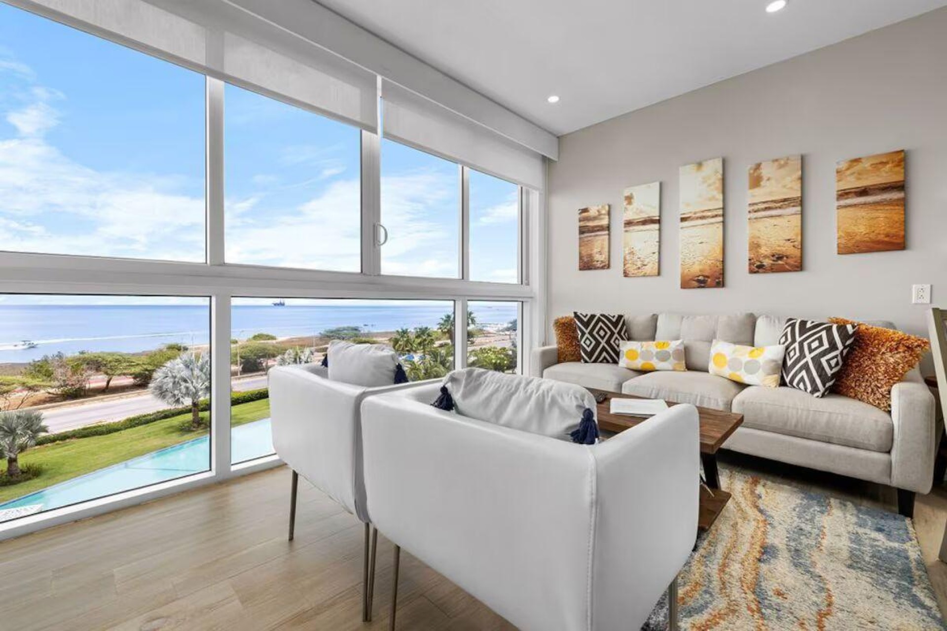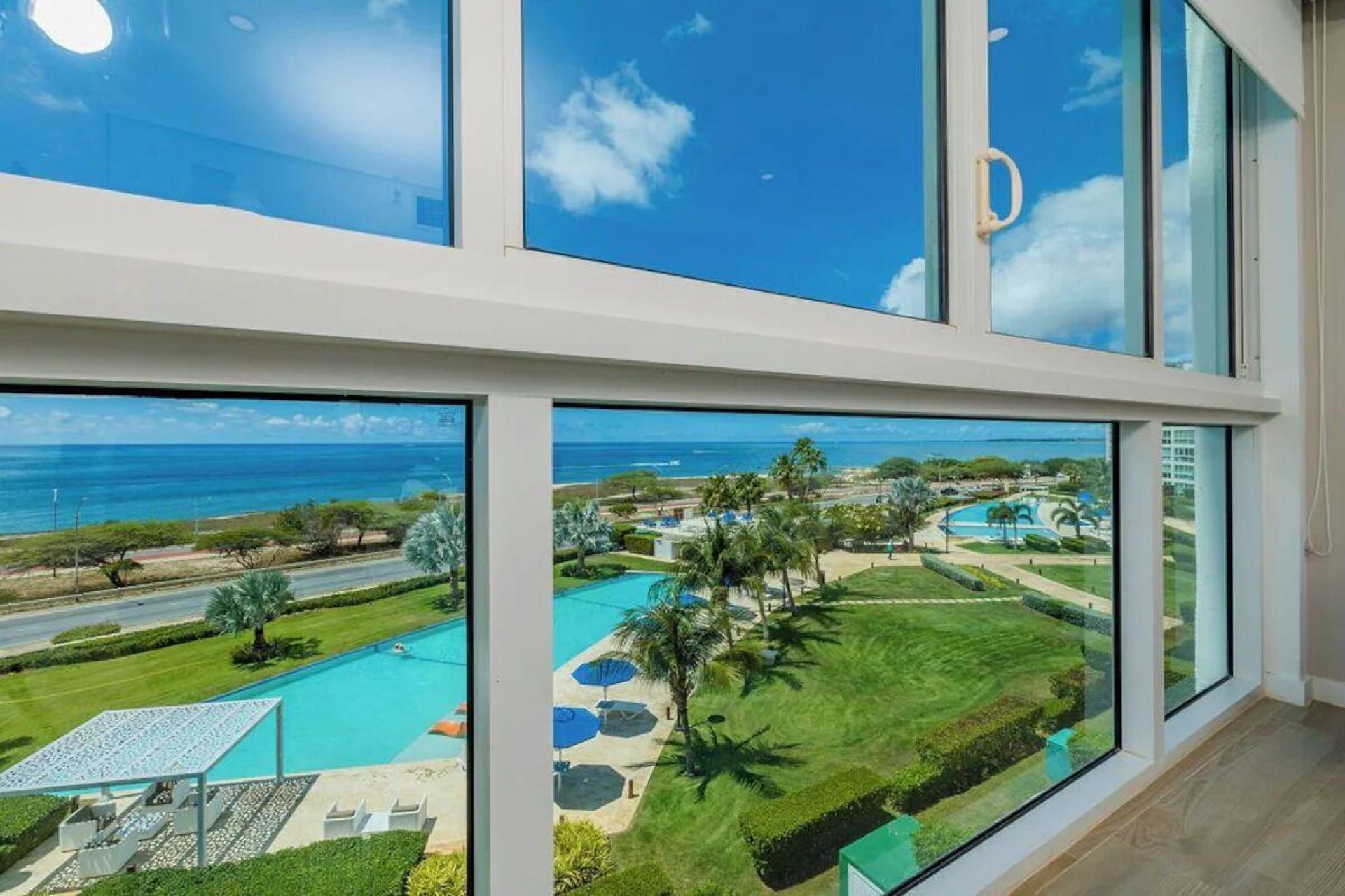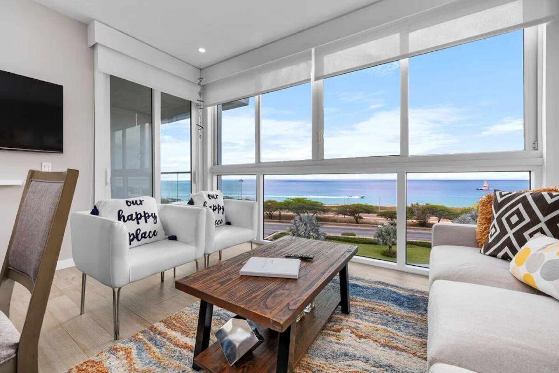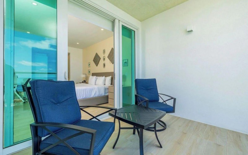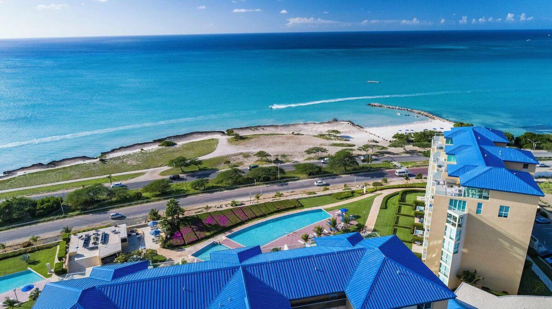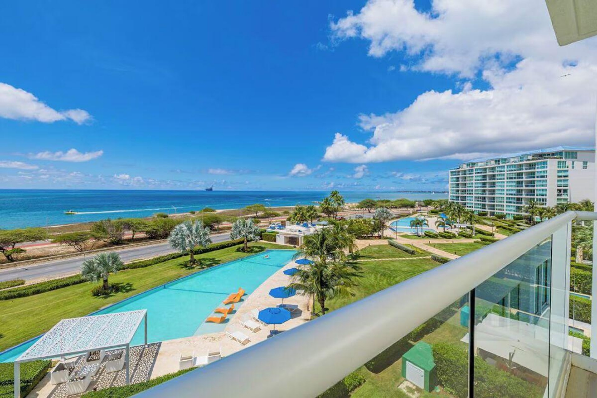 Enjoy the luxury of swimming in a pool with a stunning ocean view or taking a peaceful stroll along the beach. Stay in style in this bright and spacious condo, just a short walk from Eagle Beach and Palm Beach. From this 4th-floor location, you’ll be treated to breathtaking panoramic sea views, a private balcony, and resort-like amenities including a fitness center, hot tub, two swimming pools, 24-hour security, and concierge services. For those on a workcation, there’s a dedicated workstation and high-speed Wi-Fi perfect for remote work. Centrally located between Eagle Beach and Palm Beach, this condo offers easy access to a variety of restaurants and bars within walking distance. Scooters and bikes are available at the entrance, making getting around quick and convenient. You’ll also have four beach chairs, a cooler with wheels, toys, and floats to make your beach days even more enjoyable. This 2-bedroom unit comfortably sleeps 6 with one king bed and two double beds. The fully equipped kitchen provides everything you need to prepare meals, which you can enjoy on the balcony while taking in the perfect sunset view. The condo also features a brand-new full-size washer and dryer, an iron, and ironing board. With plenty of closet and drawer space, you'll have room to unpack and settle in. The two bathrooms come with bath and beach towels, washcloths, hairdryers, and ample under-sink storage. Air conditioning, hot water, and excellent water pressure are also included for your comfort. After a day in the sun or exploring the island, come back to relax with games or streaming movies on the smart TVs. The spacious living room is perfect for family time, with books, games, cards, and coloring books available for everyone to enjoy. You can access the balcony from either the primary bedroom or living room to watch the sunset or sip a glass of wine while taking in the stunning landscape. This condo has been part of a rental program with Blue Realty since 2021 and already has 15 bookings secured for 2025. For more information or to schedule a viewing, please reach out via: Call/WhatsApp: +297 592-7256 Email: