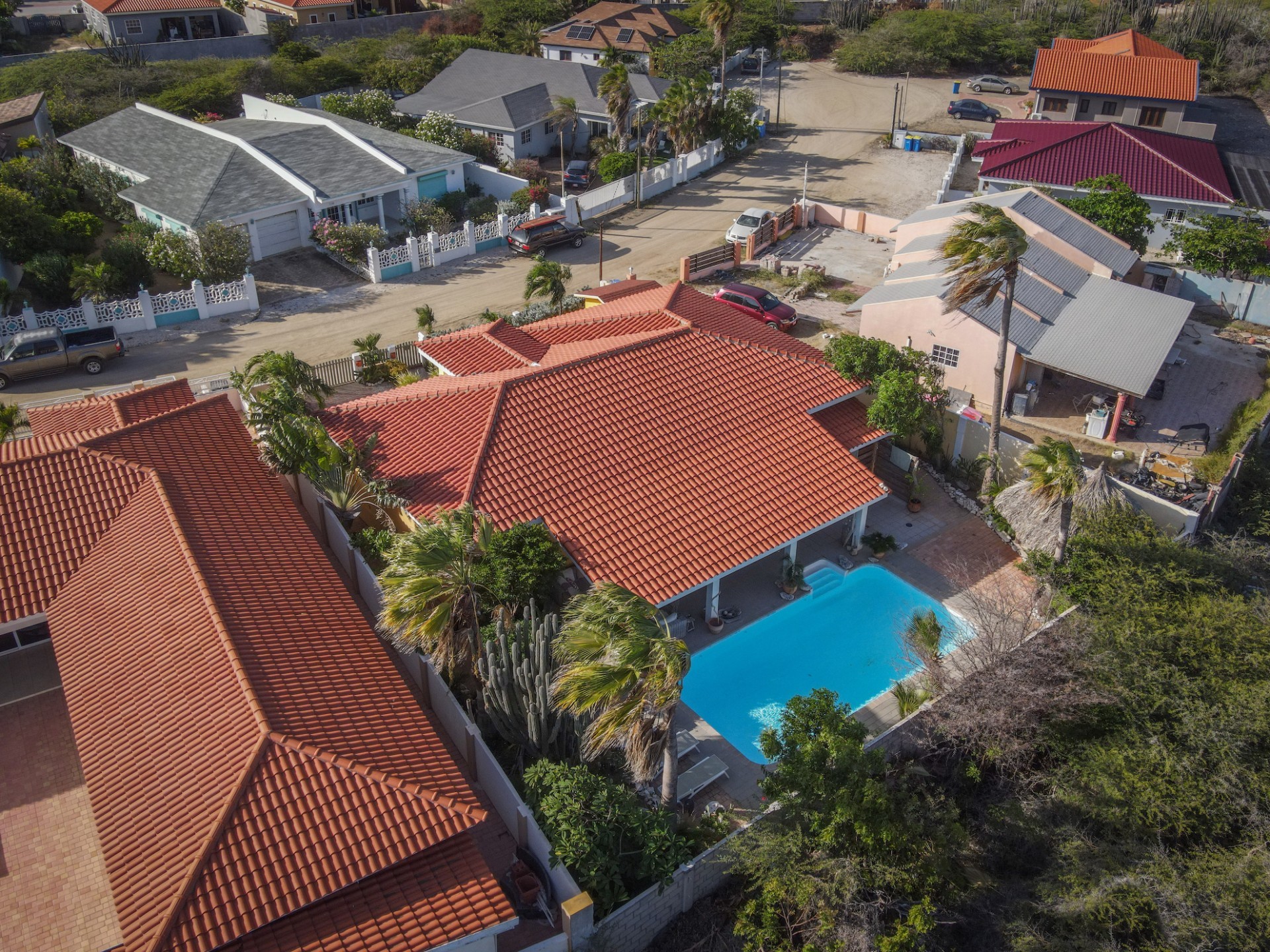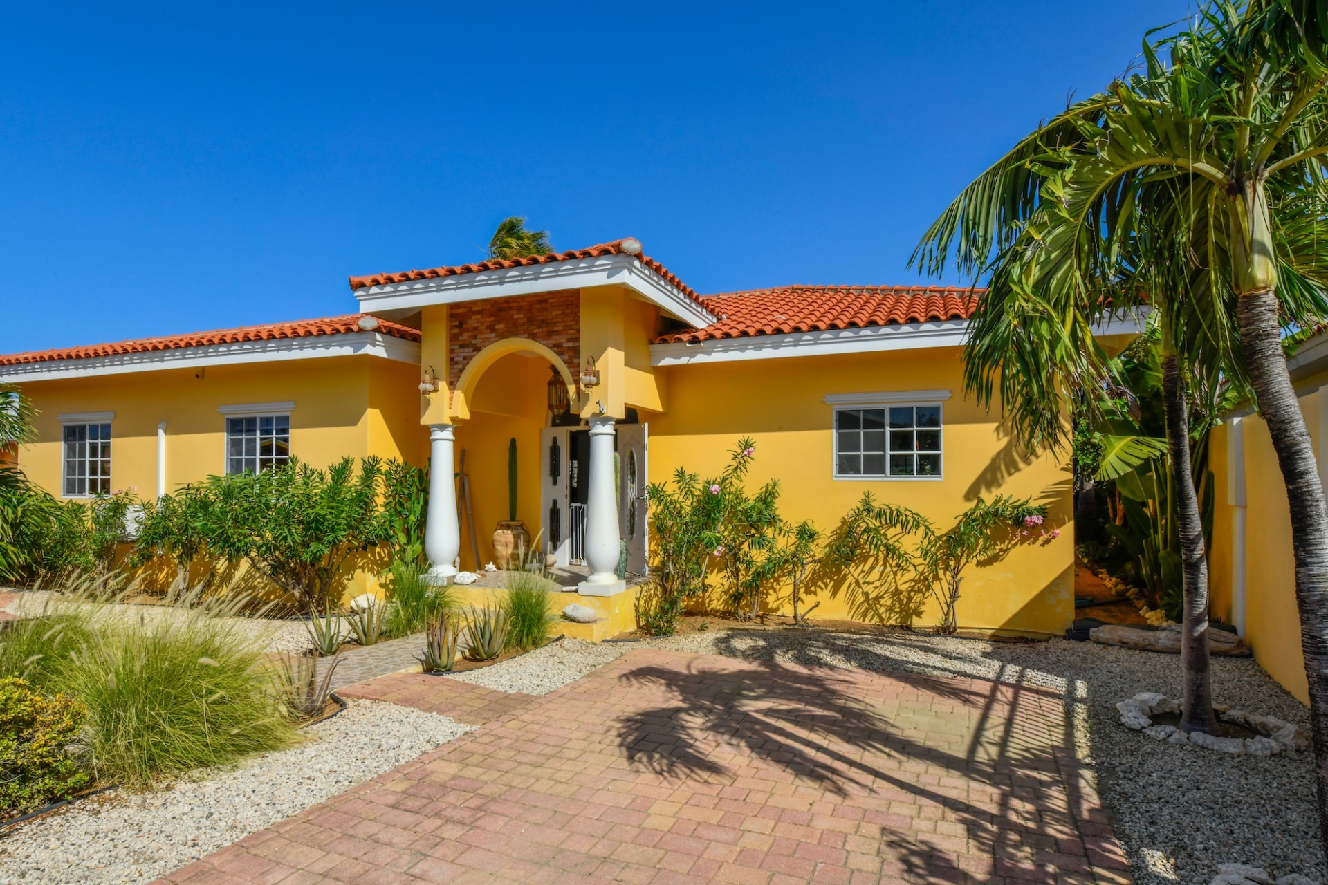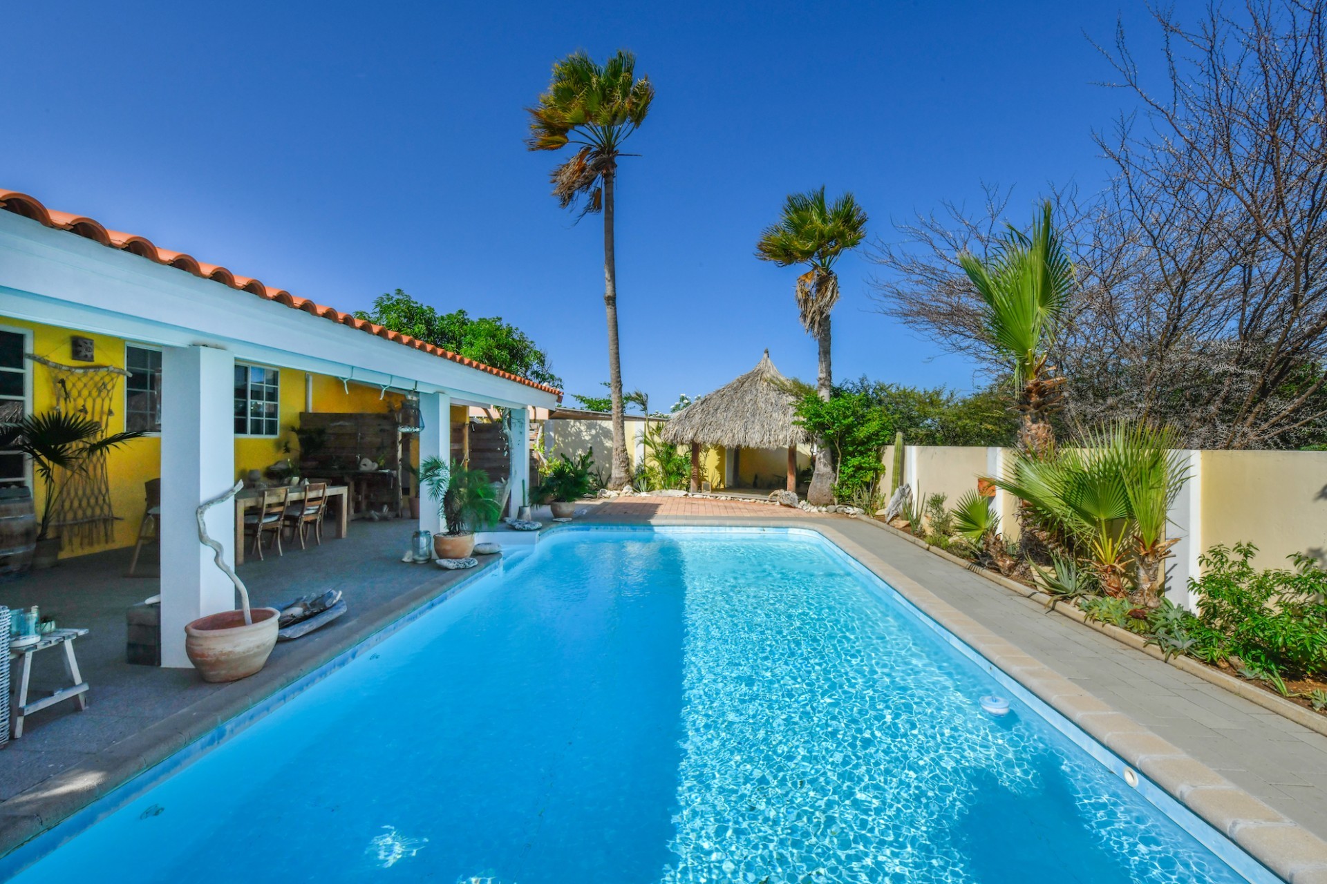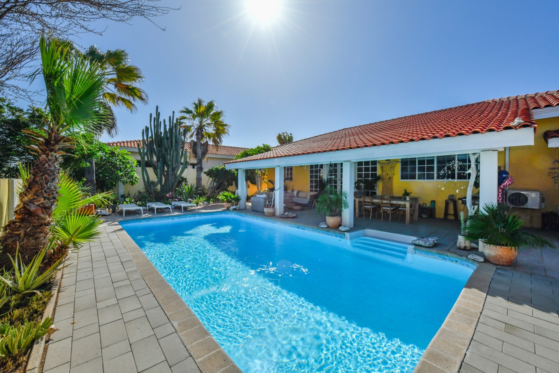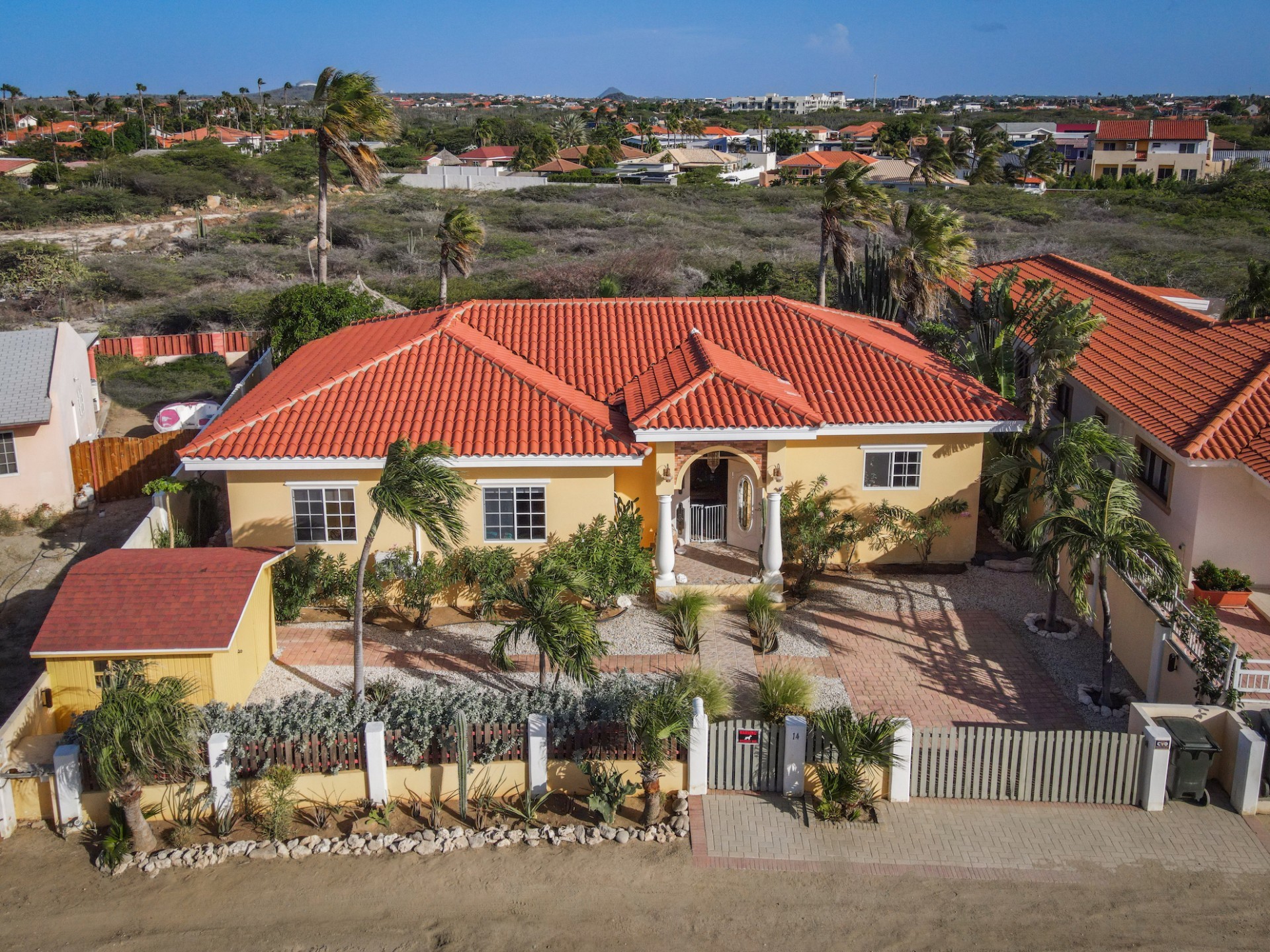 Introducing a modern gem in the prestigious Esmeralda, one of the most desirable neighborhoods on Aruba. This exquisite 3-bedroom, 2-bathroom home offers the perfect blend of luxury and comfort, ideal for those seeking a high-end living experience. Step inside to discover a sleek, modern interior, fully ready to welcome you. The open-plan layout effortlessly connects the living room, dining area, and kitchen, creating a spacious environment perfect for both entertaining and relaxation. The kitchen is a modern masterpiece, equipped with top-of-the-line appliances and ample counter space, making it a dream for any home chef. The master bedroom is a true retreat, featuring a walk-in closet and appointed en-suite bathroom. Two additional bedrooms provide ample space for family or guests, each designed with comfort in mind. The beauty of this home extends beyond its walls. Inside, you'll find an inviting open patio that serves as a serene retreat, seamlessly connected to the outside through large glass doors. These doors lead to a beautiful terrace, perfectly blending indoor and outdoor living. The expansive terrace is ideal for hosting, complete with a palapa for shaded relaxation, a large swimming pool for cooling off, and a delightful garden with automatic plant irrigation to enjoy Aruba’s year-round sunshine. Additionally, there is a shed for extra storage and convenience. Whether you're inside or out, this home offers the perfect setting for relaxation and entertainment. Situated on long lease land of 646 m², this property offers space, privacy, and an excellent investment opportunity. Currently tenanted with a lease until August 1, 2026, this unfurnished property offers immediate rental income. Whether you’re looking for a lucrative investment or a future dream home, this property in Esmeralda 14 has it all. Property highlights: 3 bedrooms | 2 bathrooms Modern interior Walk-in closet in the master bedroom Large terrace and patio with glass doors Spacious pool and palapa Outside laundry area Prime location in Esmeralda Tenant contract until August 2026 For more information, please contact Edwin Hekman: +297 592 2506 or