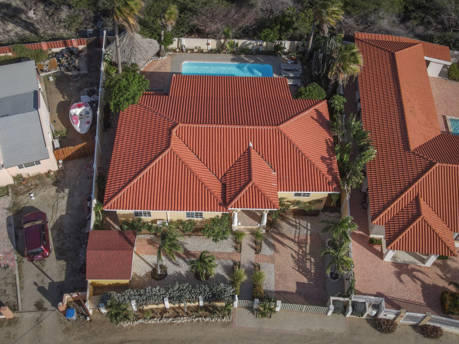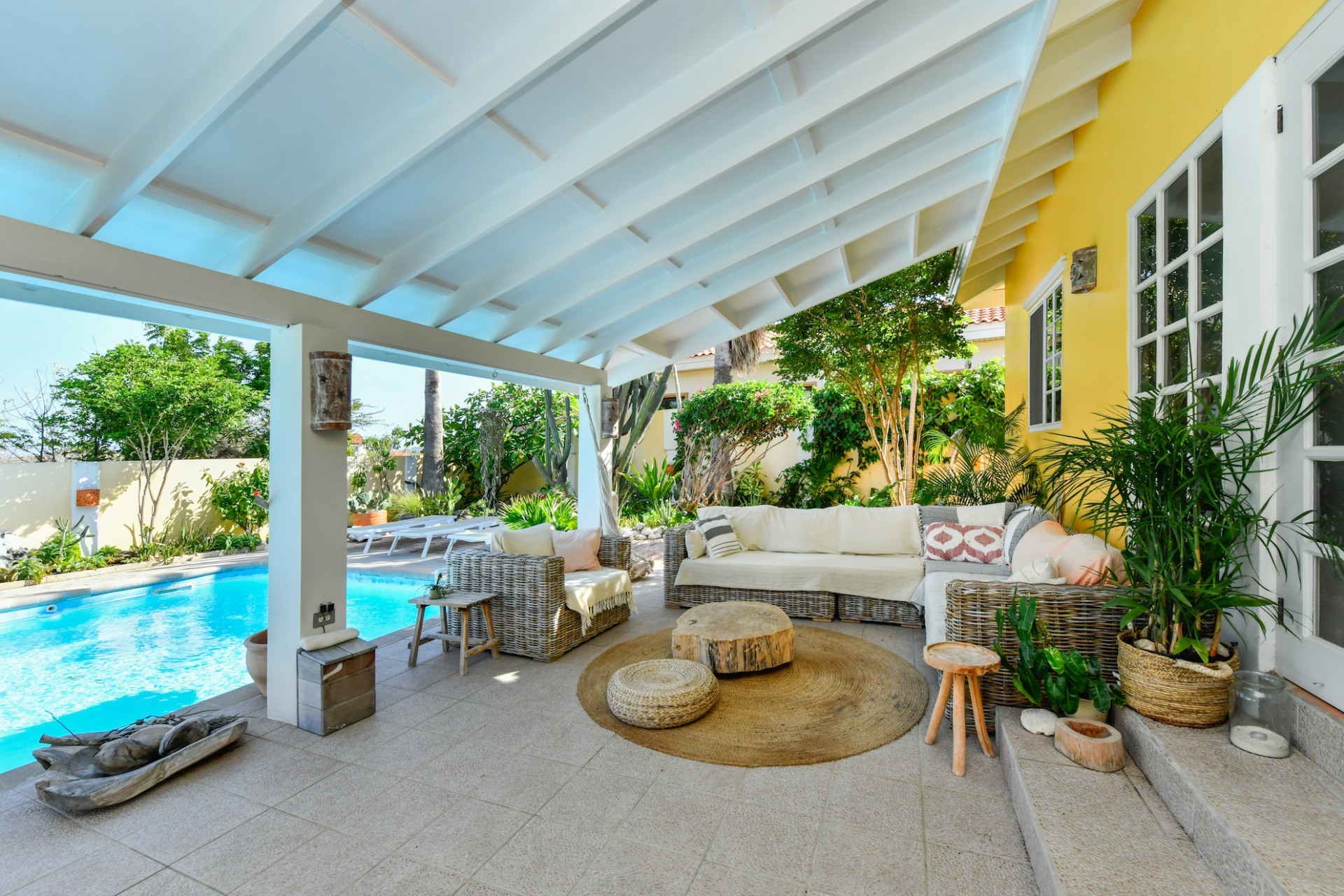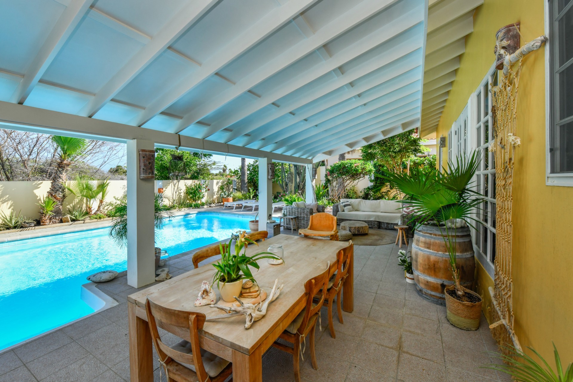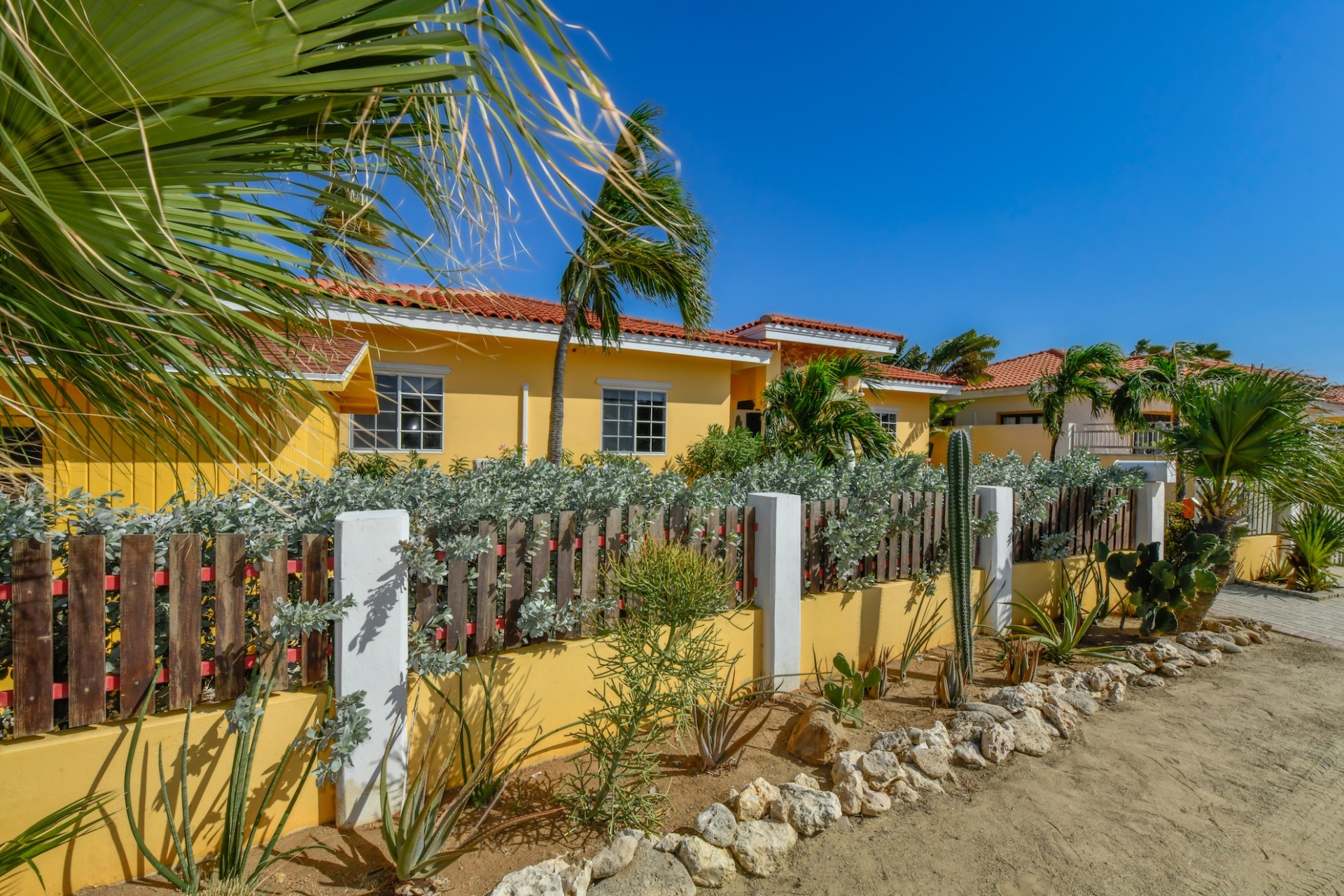 Introducing a modern gem in the prestigious Esmeralda, one of the most desirable neighborhoods on Aruba. This exquisite 3-bedroom, 2-bathroom home offers the perfect blend of luxury and comfort, ideal for those seeking a high-end living experience. Step inside to discover a sleek, modern interior, fully ready to welcome you. The open-plan layout effortlessly connects the living room, dining area, and kitchen, creating a spacious environment perfect for both entertaining and relaxation. The kitchen is a modern masterpiece, equipped with top-of-the-line appliances and ample counter space, making it a dream for any home chef. The master bedroom is a true retreat, featuring a walk-in closet and appointed en-suite bathroom. Two additional bedrooms provide ample space for family or guests, each designed with comfort in mind. The beauty of this home extends beyond its walls. Inside, you'll find an inviting open patio that serves as a serene retreat, seamlessly connected to the outside through large glass doors. These doors lead to a beautiful terrace, perfectly blending indoor and outdoor living. The expansive terrace is ideal for hosting, complete with a palapa for shaded relaxation, a large swimming pool for cooling off, and a delightful garden with automatic plant irrigation to enjoy Aruba’s year-round sunshine. Additionally, there is a shed for extra storage and convenience. Whether you're inside or out, this home offers the perfect setting for relaxation and entertainment. Situated on long lease land of 646 m², this property offers space, privacy, and an excellent investment opportunity. Currently tenanted with a lease until August 1, 2026, this unfurnished property offers immediate rental income. Whether you’re looking for a lucrative investment or a future dream home, this property in Esmeralda 14 has it all. Property highlights: 3 bedrooms | 2 bathrooms Modern interior Walk-in closet in the master bedroom Large terrace and patio with glass doors Spacious pool and palapa Outside laundry area Prime location in Esmeralda Tenant contract until August 2026 For more information, please contact Edwin Hekman: +297 592 2506 or