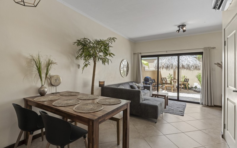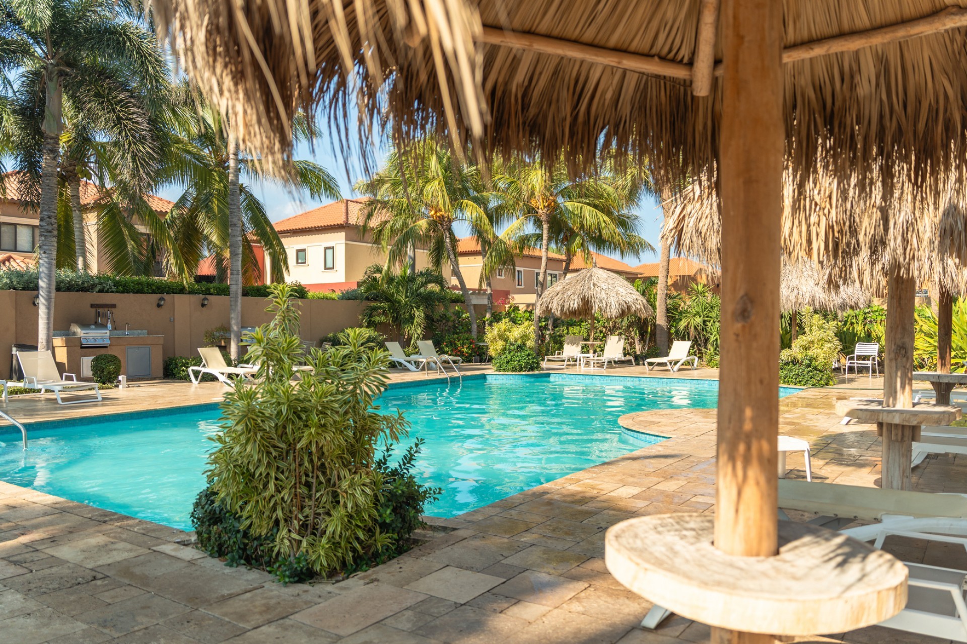 Charming 2-Bedroom Caribbean Townhouse in Gold Coast Aruba – Turnkey & Ready for You Welcome to Diamante 38, a beautifully upgraded 2-bedroom, 2-bathroom townhouse located in the prestigious Gold Coast community of Aruba. Thoughtfully renovated and stylishly furnished, this two-story property is being offered turnkey. Perfect as a full-time residence, vacation getaway, or ready-to-go investment property with proven short-term rental potential. Step inside and you’ll immediately notice the bright open-concept layout, where a modern kitchen flows seamlessly into the living and dining area. The kitchen, recently renovated with a sleek and stylish design, sets the tone for the entire home. Large sliding doors open to your private backyard, extending your living space outdoors and creating that sought-after indoor-outdoor Caribbean lifestyle. The garden has been beautifully landscaped and features a charming palapa—a true island touch—providing the perfect spot to relax, entertain, or dine al fresco in your own tropical retreat. For added convenience, the ground floor also includes a guest bathroom, laundry area, and a dedicated owner’s closet. Upstairs, you’ll find two inviting bedrooms, each with built-in closets, ensuite bathrooms, and private balconies. As part of the gated Gold Coast community, this townhouse offers 24/7 security and access to top-tier amenities including three swimming pools, a clubhouse, restaurant, gym, and tennis courts. Better yet, Aruba’s world-renowned beaches and the vibrant Palm Beach strip are just minutes away. Delivered fully furnished, Diamante 38 is ready for you to move in or start generating rental income from day one. Don’t miss out on this stylish, well-located property—schedule your private (or virtual) tour today! 📞 +297 742 0129 📨