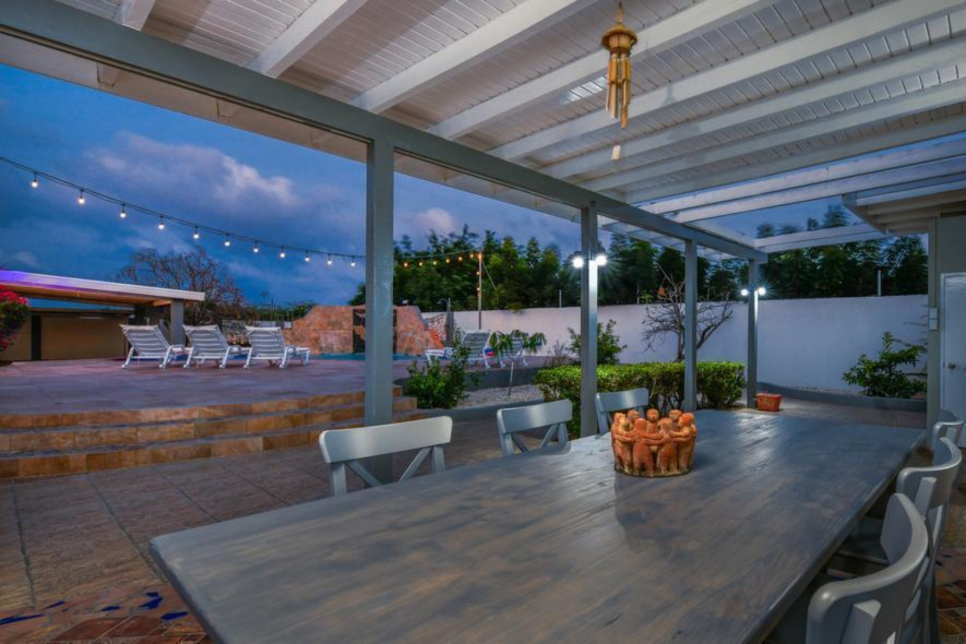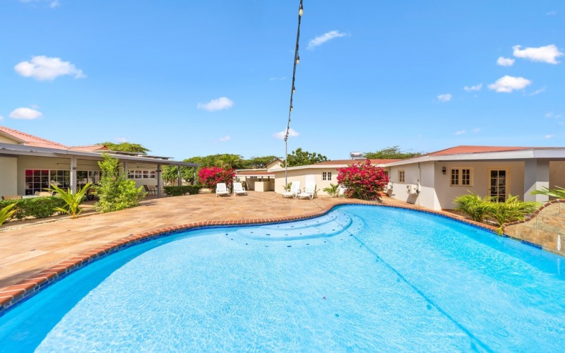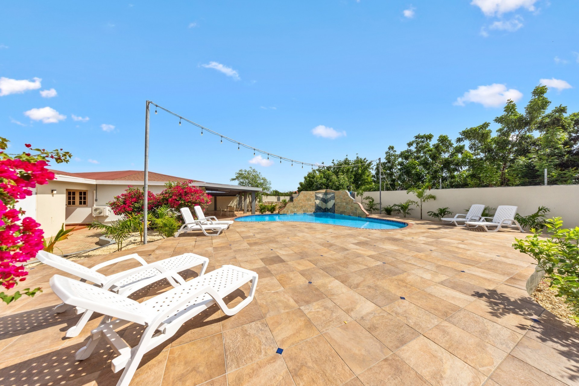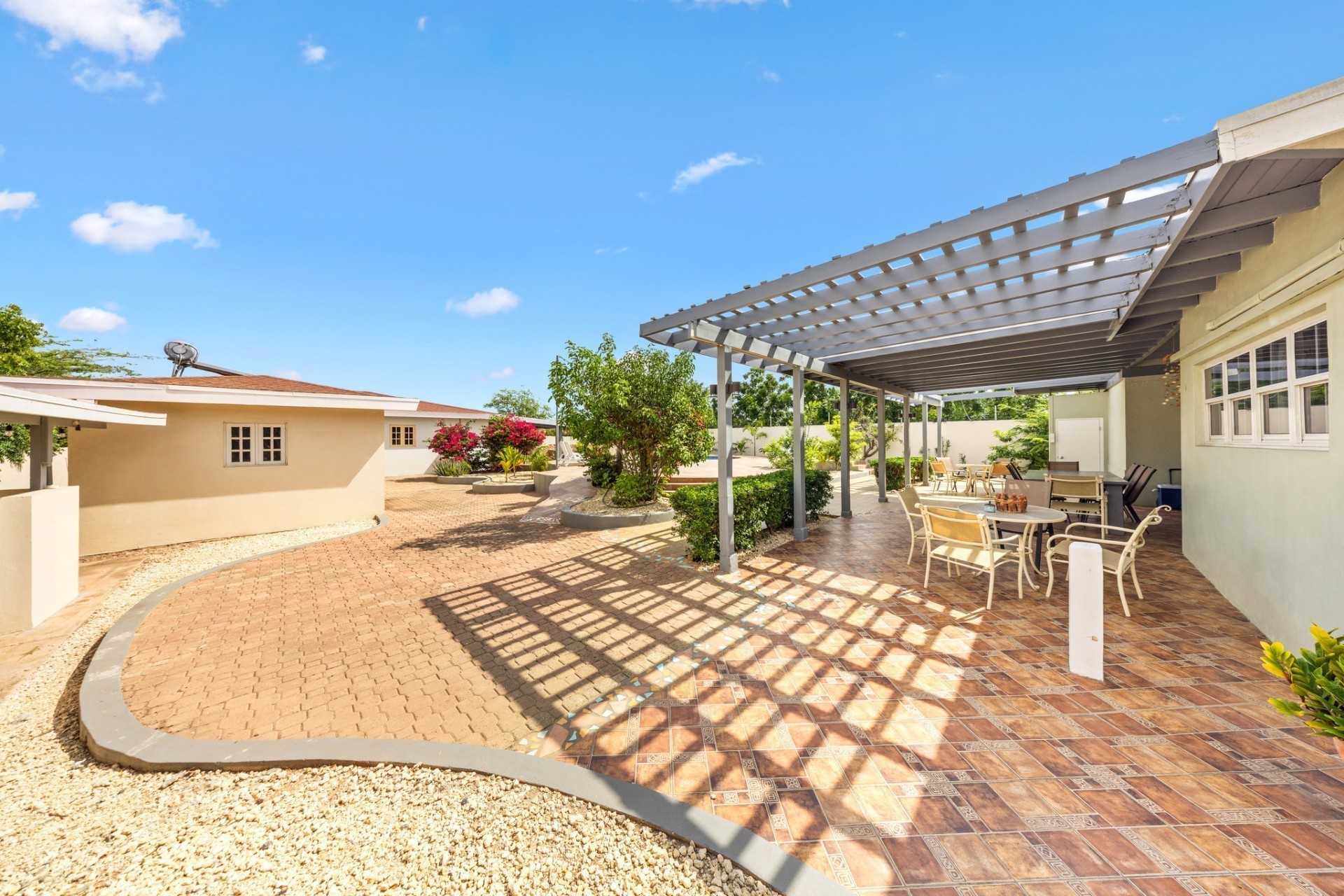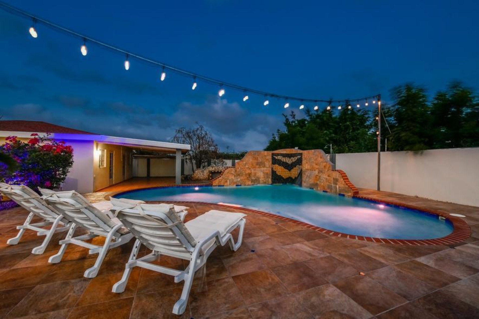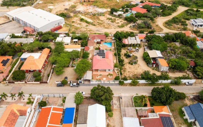 Hidden Oasis in the Heart of Aruba – Expansive Estate with Limitless Potential Welcome to Ierlandstraat 20, a hidden gem perfectly located between Oranjestad and Noord. From the outside, behind the private wall lies a lush and expansive estate sitting on 1,588 m² of full ownership land. Walking distance to the ocean, a major supermarket, and just minutes from Eagle Beach, Palm Beach, and the vibrant downtown area. Despite its central location, this gated property feels like a private retreat. A gated entrance leads to a two-car carport and a lush yard that wraps around the entire home. Inside, you'll find approx. 529 m² of built-up area, spread across a spacious main house and multiple detached units. The main house opens into an expansive entry hall with high ceilings and endless potential. French doors lead to a bright, open living area and a renovated kitchen with bar and ample counter space. From the hall, you’ll find the primary suite with walk-in closet and en suite, plus a second bedroom. The third bedroom—also with walk-in closet and en suite—is privately located off the living area. Step outside to a tropical escape featuring a covered patio, an elevated pool terrace with calming waterfall, and lush greenery throughout. There's an outdoor bathroom, a dedicated BBQ area, and space in the back for further development. At the back of the property, a flexible detached building offers a 1-bedroom apartment with kitchen and bath, plus an adjoining 2-bedroom unit with shared bath. Both have private entrances and can function as one large or two separate rentals. An unfinished unit offers the option to add a 7th bedroom and 6th bathroom. Currently a high-performing Airbnb, this hidden oasis offers unmatched location, privacy, and income potential—perfect as a spacious family home or smart investment. Contact us today to schedule your private (online) showing. 📞 +297-742-0129 📨