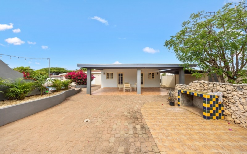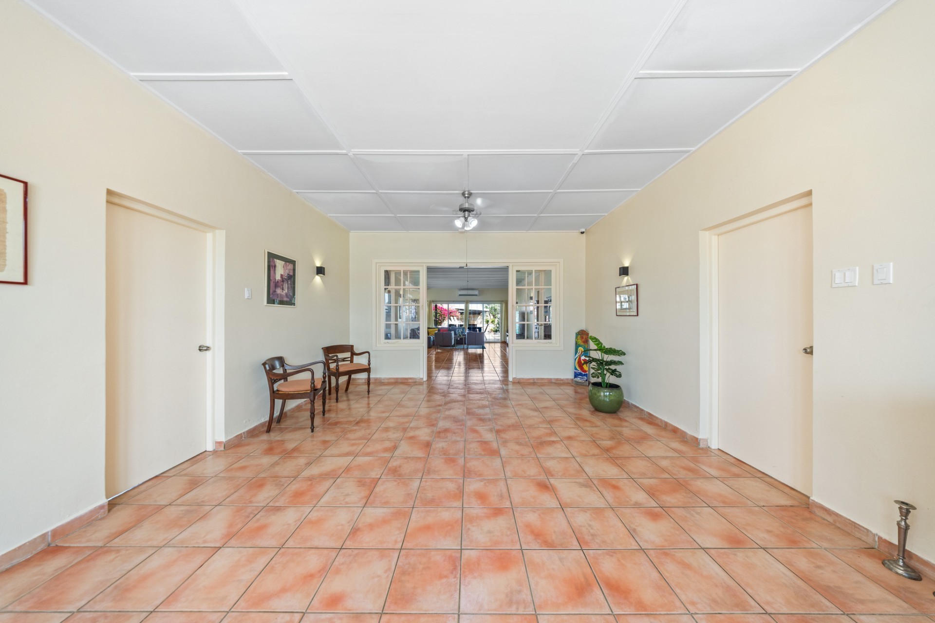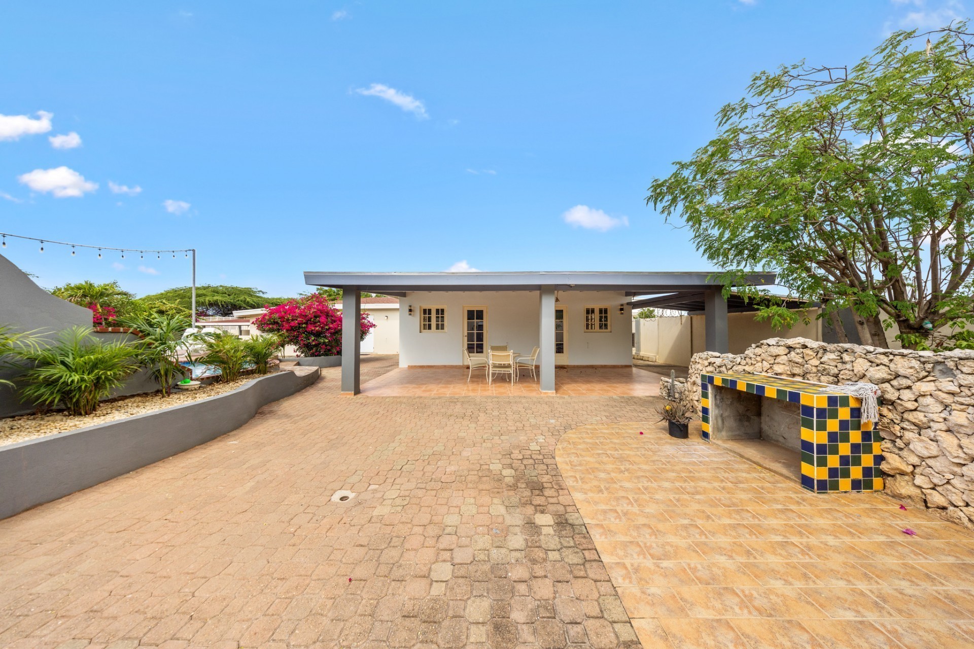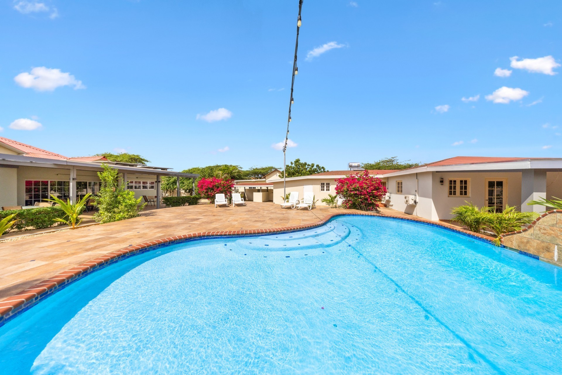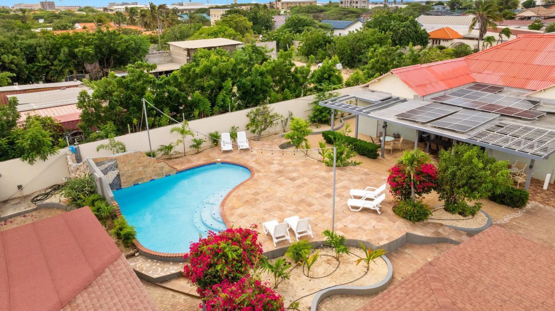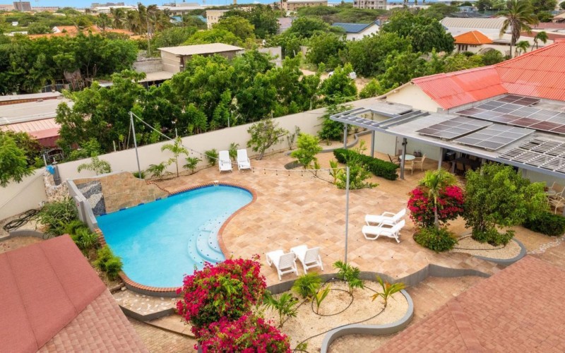 Hidden Oasis in the Heart of Aruba – Expansive Estate with Limitless Potential Welcome to Ierlandstraat 20, a hidden gem perfectly located between Oranjestad and Noord. From the outside, behind the private wall lies a lush and expansive estate sitting on 1,588 m² of full ownership land. Walking distance to the ocean, a major supermarket, and just minutes from Eagle Beach, Palm Beach, and the vibrant downtown area. Despite its central location, this gated property feels like a private retreat. A gated entrance leads to a two-car carport and a lush yard that wraps around the entire home. Inside, you'll find approx. 529 m² of built-up area, spread across a spacious main house and multiple detached units. The main house opens into an expansive entry hall with high ceilings and endless potential. French doors lead to a bright, open living area and a renovated kitchen with bar and ample counter space. From the hall, you’ll find the primary suite with walk-in closet and en suite, plus a second bedroom. The third bedroom—also with walk-in closet and en suite—is privately located off the living area. Step outside to a tropical escape featuring a covered patio, an elevated pool terrace with calming waterfall, and lush greenery throughout. There's an outdoor bathroom, a dedicated BBQ area, and space in the back for further development. At the back of the property, a flexible detached building offers a 1-bedroom apartment with kitchen and bath, plus an adjoining 2-bedroom unit with shared bath. Both have private entrances and can function as one large or two separate rentals. An unfinished unit offers the option to add a 7th bedroom and 6th bathroom. Currently a high-performing Airbnb, this hidden oasis offers unmatched location, privacy, and income potential—perfect as a spacious family home or smart investment. Contact us today to schedule your private (online) showing. 📞 +297-742-0129 📨