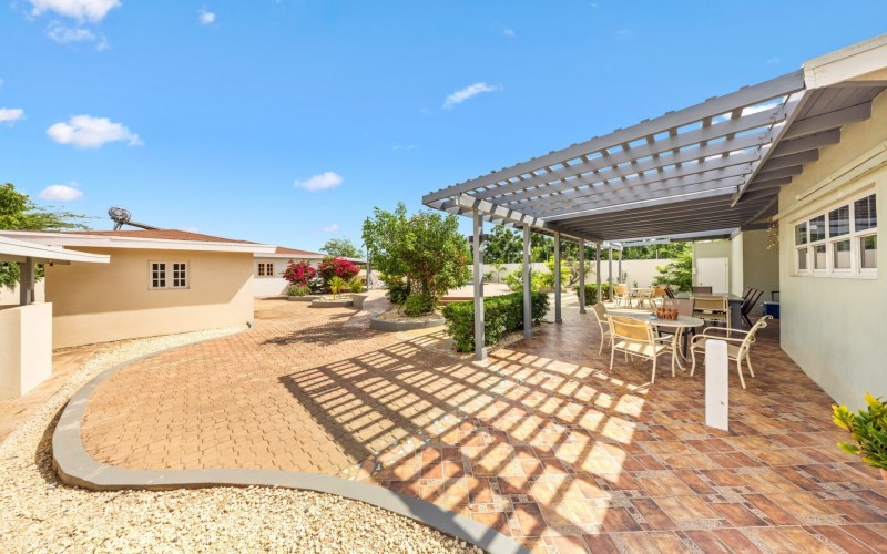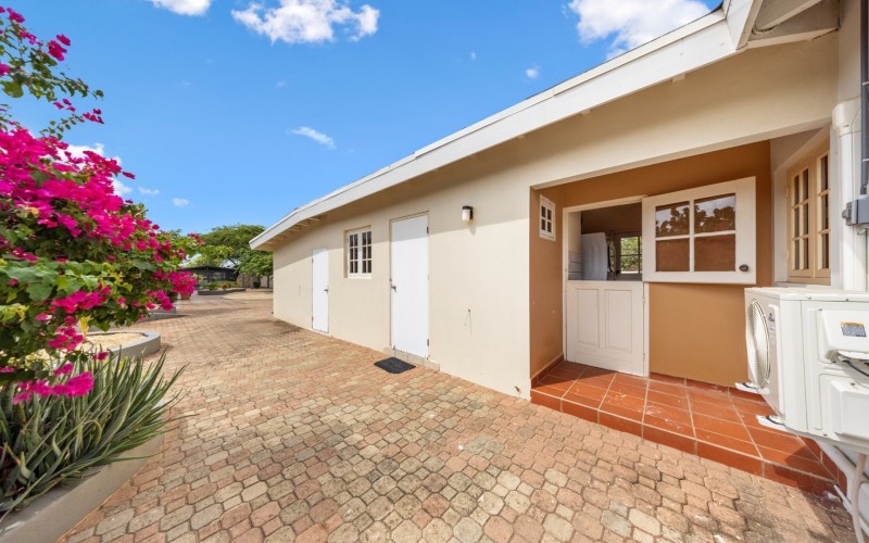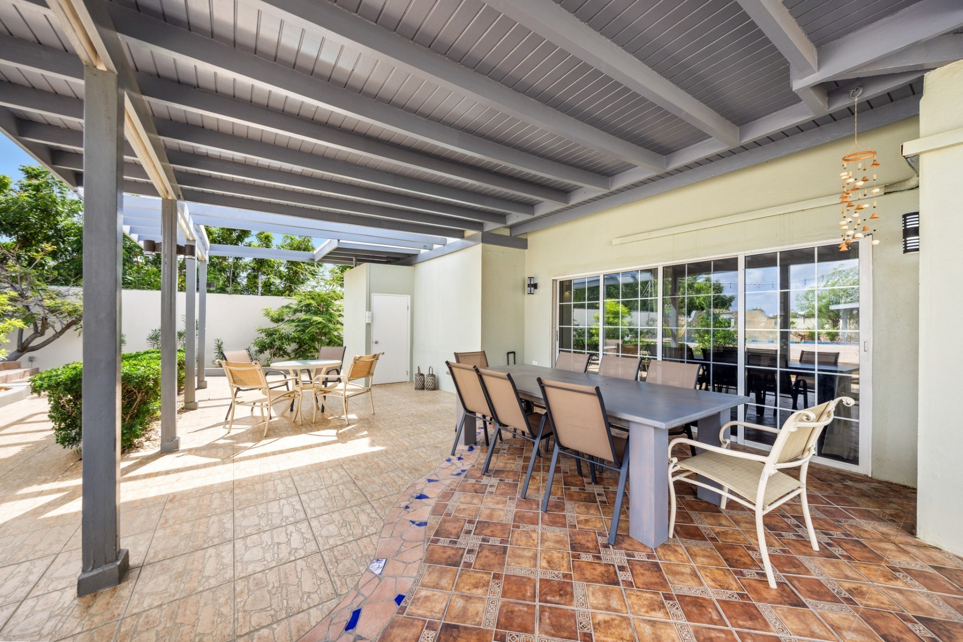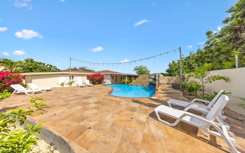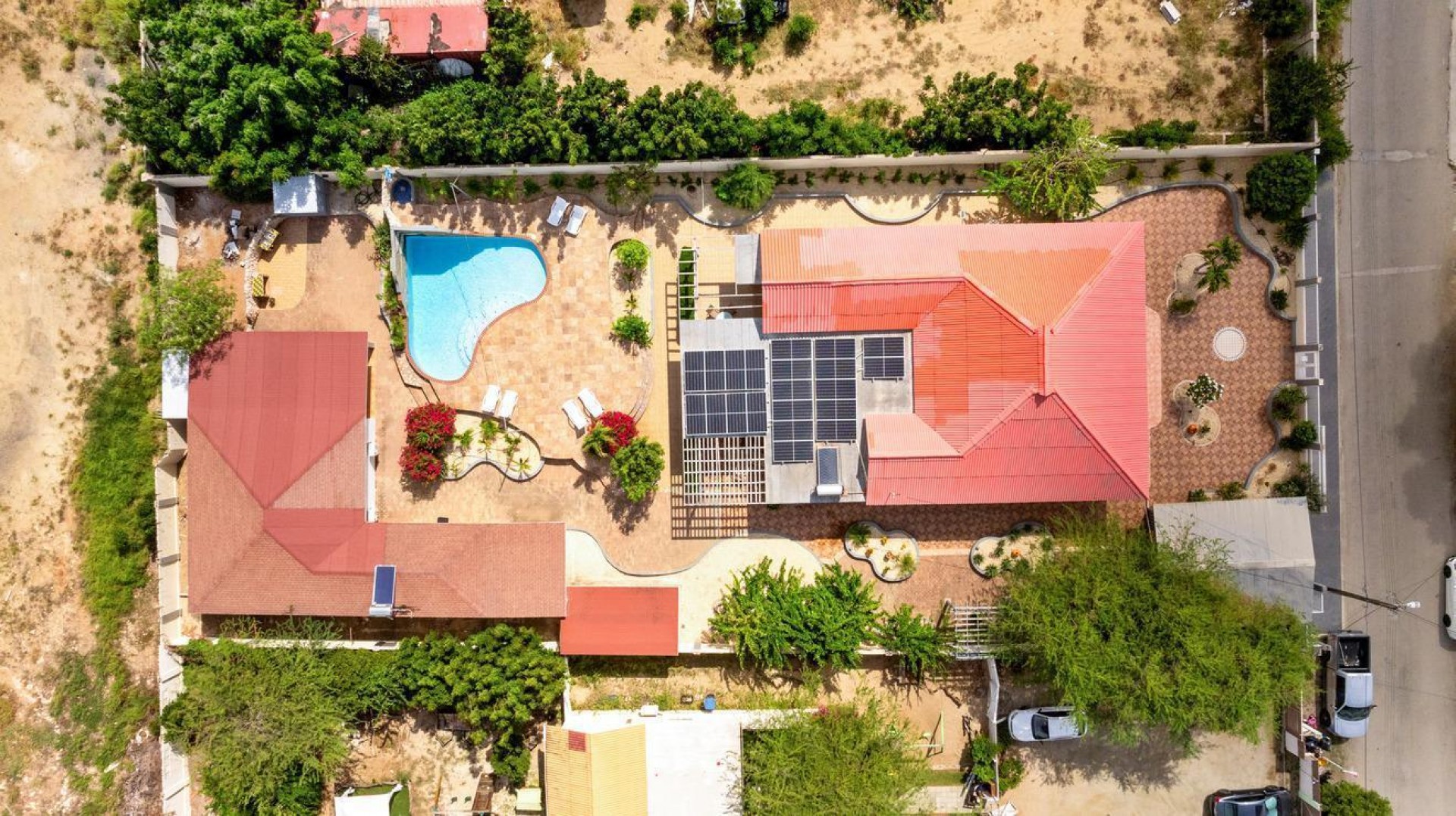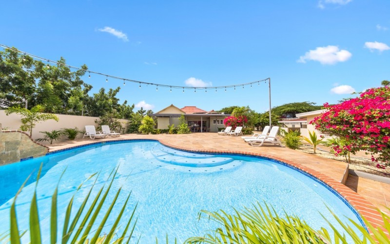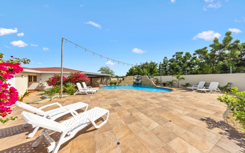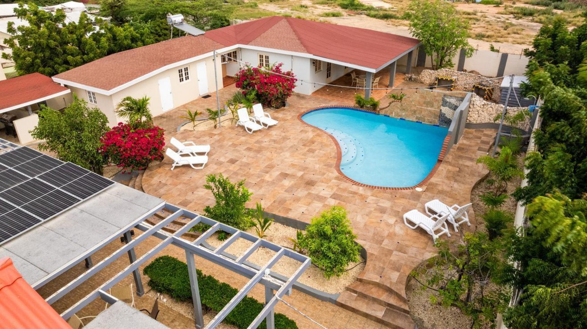 Hidden Oasis in the Heart of Aruba – Expansive Estate with Limitless Potential Welcome to Ierlandstraat 20, a hidden gem perfectly located between Oranjestad and Noord. From the outside, behind the private wall lies a lush and expansive estate sitting on 1,588 m² of full ownership land. Walking distance to the ocean, a major supermarket, and just minutes from Eagle Beach, Palm Beach, and the vibrant downtown area. Despite its central location, this gated property feels like a private retreat. A gated entrance leads to a two-car carport and a lush yard that wraps around the entire home. Inside, you'll find approx. 529 m² of built-up area, spread across a spacious main house and multiple detached units. The main house opens into an expansive entry hall with high ceilings and endless potential. French doors lead to a bright, open living area and a renovated kitchen with bar and ample counter space. From the hall, you’ll find the primary suite with walk-in closet and en suite, plus a second bedroom. The third bedroom—also with walk-in closet and en suite—is privately located off the living area. Step outside to a tropical escape featuring a covered patio, an elevated pool terrace with calming waterfall, and lush greenery throughout. There's an outdoor bathroom, a dedicated BBQ area, and space in the back for further development. At the back of the property, a flexible detached building offers a 1-bedroom apartment with kitchen and bath, plus an adjoining 2-bedroom unit with shared bath. Both have private entrances and can function as one large or two separate rentals. An unfinished unit offers the option to add a 7th bedroom and 6th bathroom. Currently a high-performing Airbnb, this hidden oasis offers unmatched location, privacy, and income potential—perfect as a spacious family home or smart investment. Contact us today to schedule your private (online) showing. 📞 +297-742-0129 📨