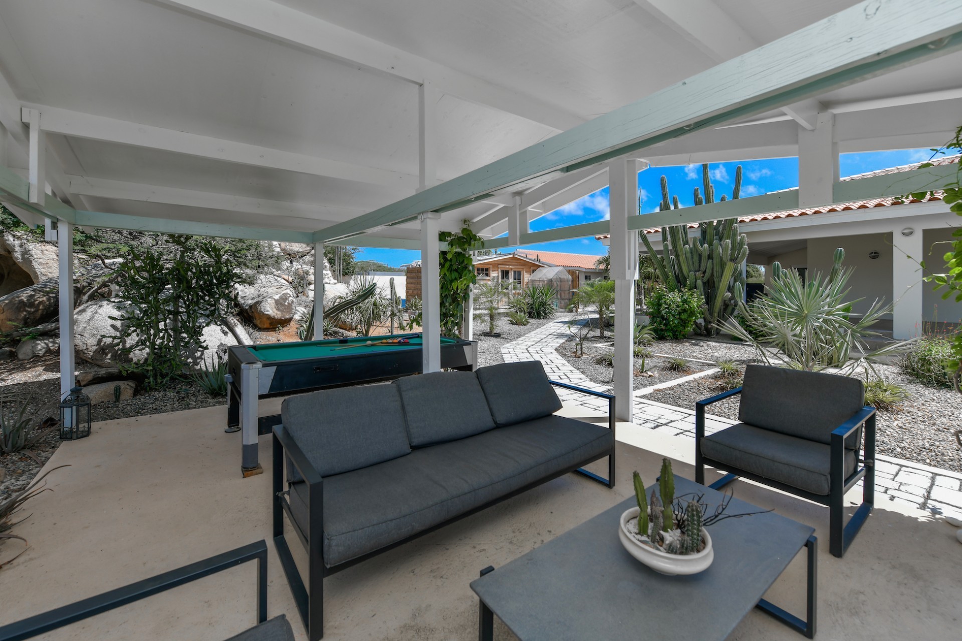 For Sale: Tranquil Estate with Income Opportunities in Matadera, Noord Nestled in the highly sought-after neighborhood of Matadera, Noord, this exceptional property offers the perfect blend of tranquility and income-generating potential. Set on a spacious 3,569m² (38,400 sq ft) lot, the estate provides ample privacy, surrounded by lush tropical gardens that create a serene retreat, all while being conveniently located near the island's key attractions. The estate features a beautifully designed 4-bedroom main residence, offering generous living space and modern comforts. The open-concept layout of the home is complemented by soaring cathedral ceilings, creating a bright and airy atmosphere throughout. An expansive L-shaped porch allows for ultimate relaxation, providing the perfect spot to enjoy the warm Aruban sunshine. For outdoor enjoyment, the property boasts a tropical pool with a beach volleyball and tennis court, ideal for both relaxation and entertainment. In addition to the main house, the property includes four fully furnished apartments, offering excellent rental opportunities. Attached to the main residence is a 1-bedroom apartment, perfect for short-term or long-term tenants. Separate from the house, there are three additional apartments: one 3-bedroom apartment and two 2-bedroom apartments. These apartments offer privacy and comfort, making them ideal for generating a steady income stream. Altogether, the property provides a total of 12 bedrooms — 4 in the main residence and 8 in the apartments — offering ample space for both owners and guests. The estate ensures both privacy and comfort, making it the perfect environment for those seeking a personal retreat or a profitable investment. The expansive grounds are beautifully landscaped, featuring rock gardens, scenic walking paths, and shaded terraces with palapas. The lush tropical garden, filled with palm trees, cacti, and vibrant flowers, attracts local wildlife such as hummingbirds, parakeets, and butterflies. There’s also a large swimming pool surrounded by plenty of lounging space, adding to the tranquil outdoor living experience. Property Highlights: Main Residence: 4 bedrooms, open-concept living areas, cathedral ceilings, expansive porch Income-Producing Apartments: A total of 12 bedrooms (4 in the main residence, 1-bedroom apartment attached, 1 three-bedroom apartment, 2 two-bedroom apartments) Total Built-Up Area: 425m² (4,573 sq ft) Separate Apartment Building: 201m² (2,163 sq ft) Land Area: 3,569m² (38,400 sq ft) Privacy: Fully enclosed grounds with lush tropical gardens This property offers not only a spacious home but also a fantastic investment opportunity with potential for consistent rental income. Whether you're looking for a private retreat or a business opportunity, this estate in Matadera is sure to fulfill your needs. For more information or to schedule a private viewing, please contact Edwin Hekman at +297 592 2506 or [email protected]. Link to Matterport: https://my.matterport.com/show/?m=8znqDvWpDJB Explore Apartment #1 https://my.matterport.com/show/?m=mVTd6yzRk4t Explore Apartment #2 https://my.matterport.com/show/?m=rtSeKhZFD8A