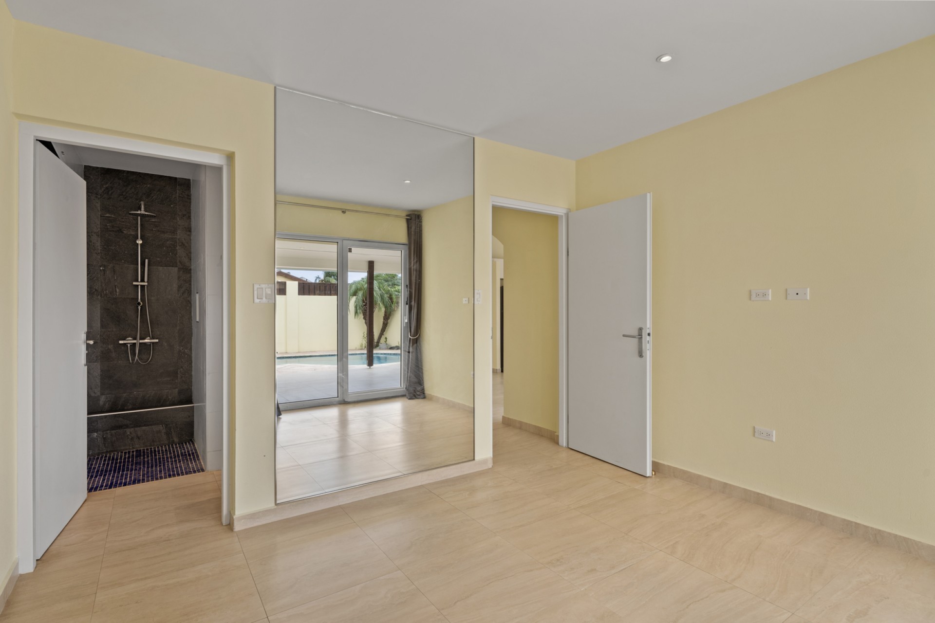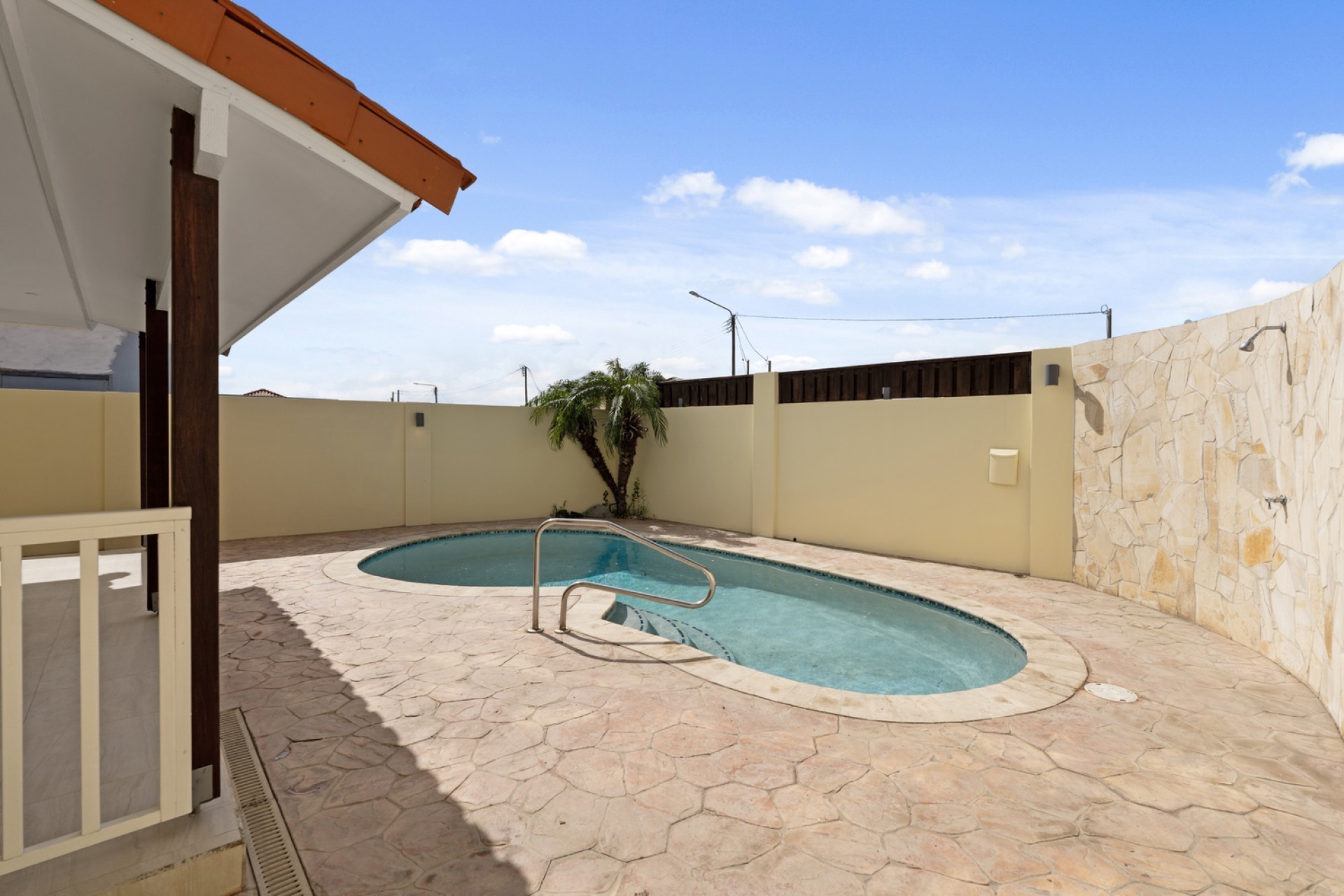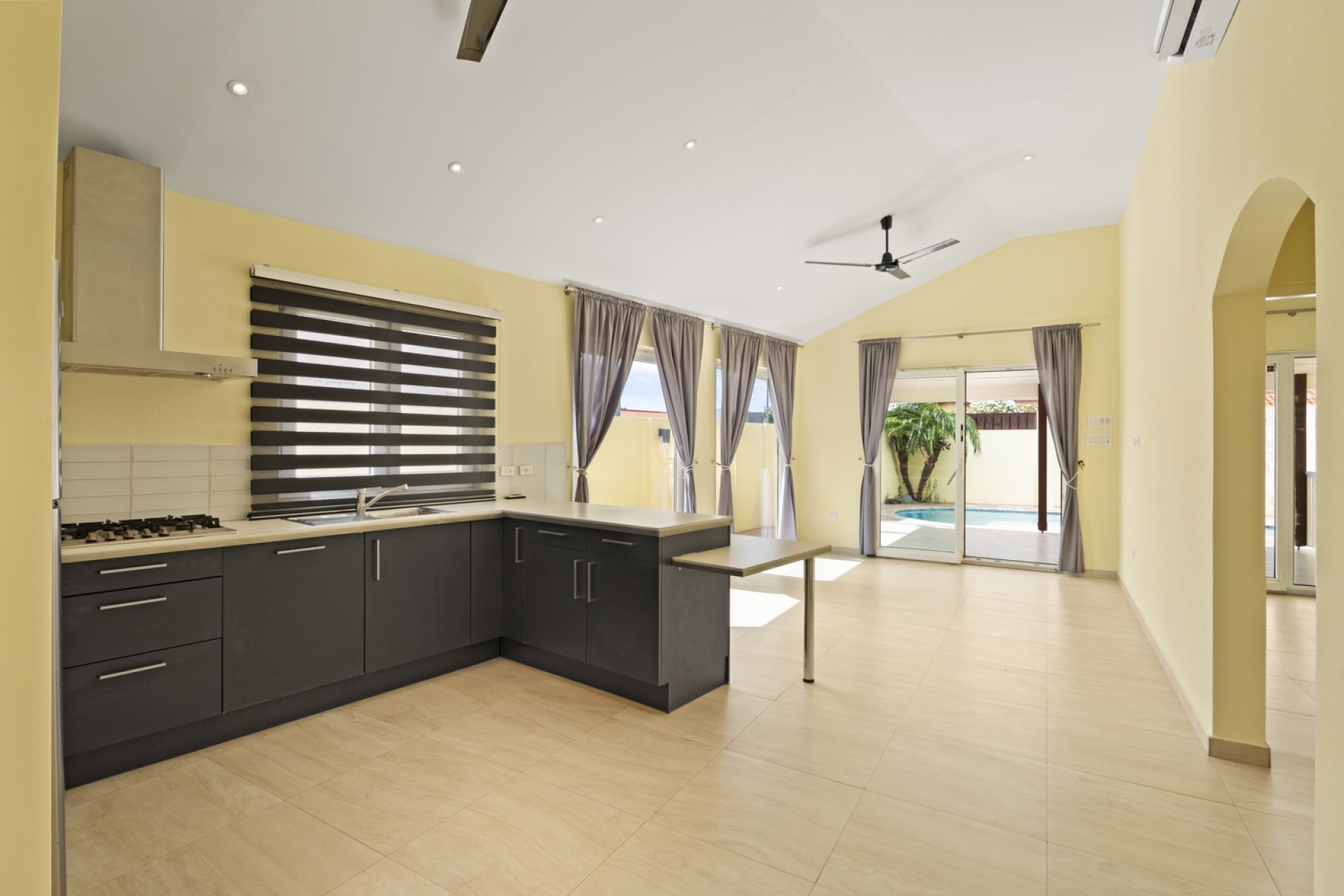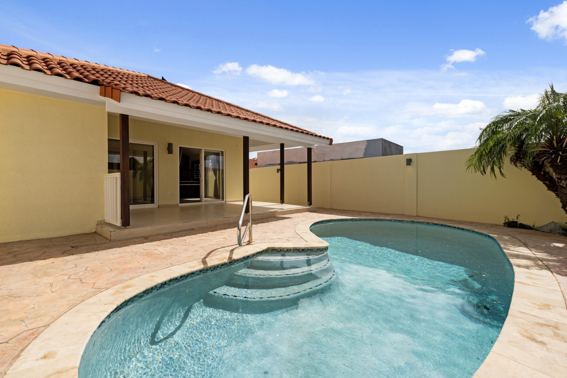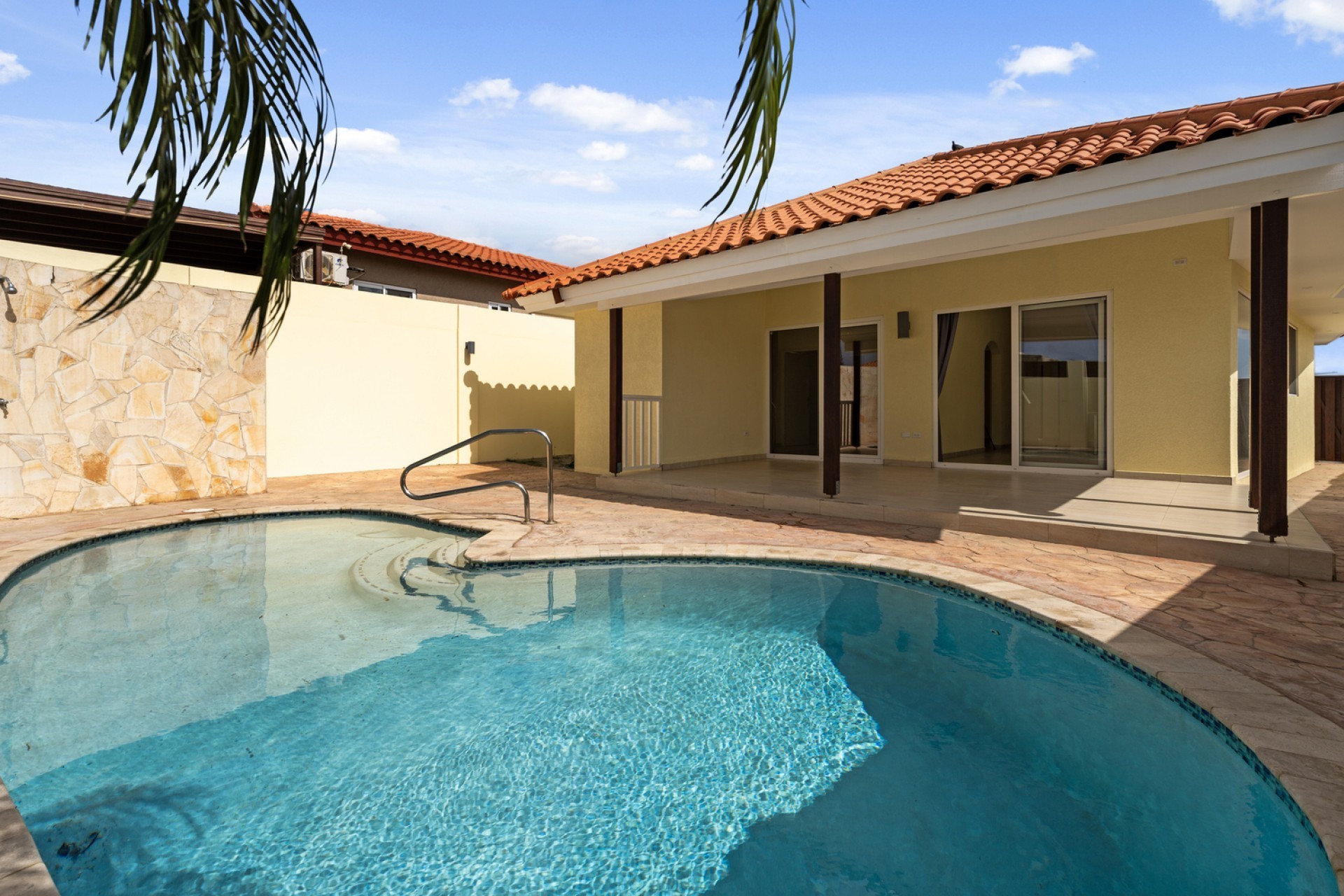 Family Living in Modanza Villa Park – Turn-Key Comfort with Pool Discover the perfect blend of comfort, style, and modern convenience in this move-in-ready family home at Modanza Villa Park. Situated on 326 m² of property land with 132 m² of thoughtfully designed living space, this home enjoys a prime position at the end of a quiet cul-de-sac—offering peace, privacy, and a true family-friendly atmosphere. Step inside and you’re welcomed by a bright, open-concept layout where kitchen, dining, and living areas flow seamlessly together. Large windows fill the home with natural light, while oversized sliding doors invite the outdoors in. From here, your living space extends effortlessly onto the covered porch and backyard oasis. With a sparkling pool, outdoor shower, and shaded lounge areas, every day feels like a private retreat designed for both relaxation and entertaining. This home features 3 bedrooms and 2 bathrooms. The master suite conveniently has its ensuite bathroom, walk-in closet, and direct access to the pool. A second bedroom also boasts a walk-in closet, while the versatile third bedroom is ideal as a guest room, home office, or children’s room. The second bathroom is cleverly arranged with a separate guest toilet and a dedicated shower room, ensuring comfort and convenience for both family and visitors. Practical features add to the home’s appeal: a separate laundry room, hot water throughout, and a fully fenced yard that wraps around the property for added privacy and security. Perfect as a family residence or a turn-key investment, this home in Modanza Villa Park combines modern living with a Caribbean setting in a sought-after neighborhood known for its tranquility, privacy, and family-friendly setting. Ready to move in and start living the island lifestyle? Contact us today to book your private (or virtual) tour. 📞 +297 742 0129 📨