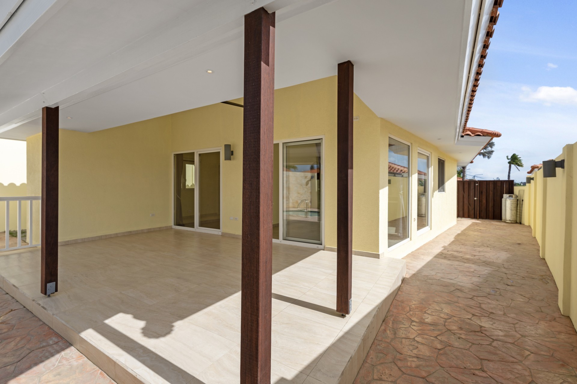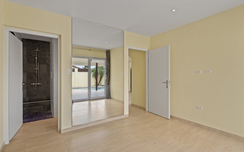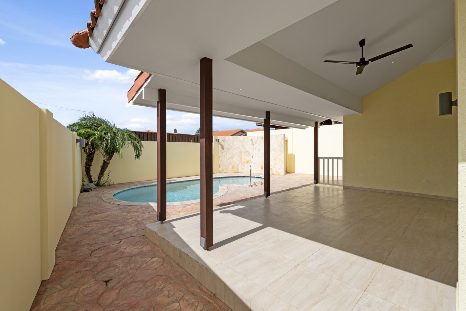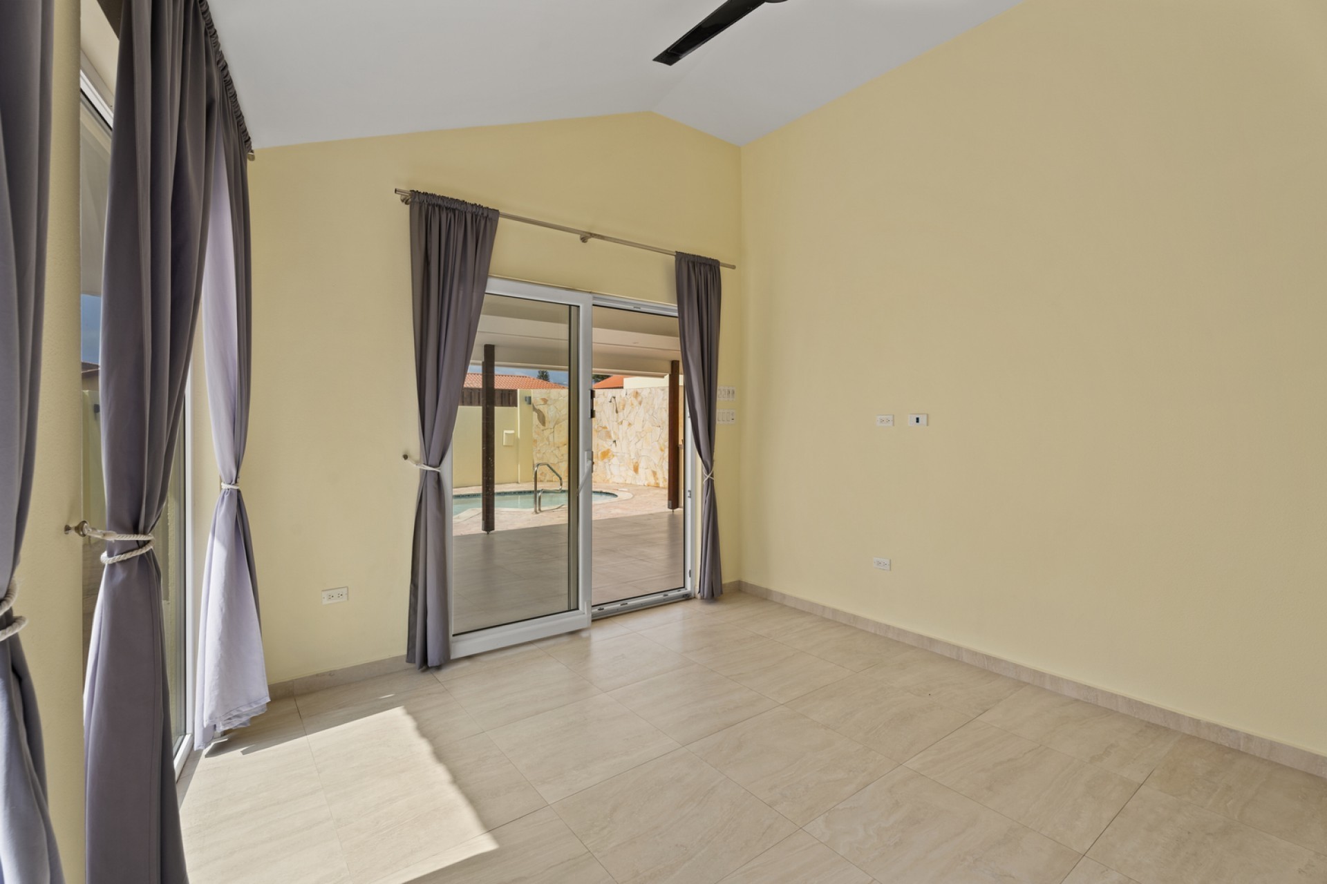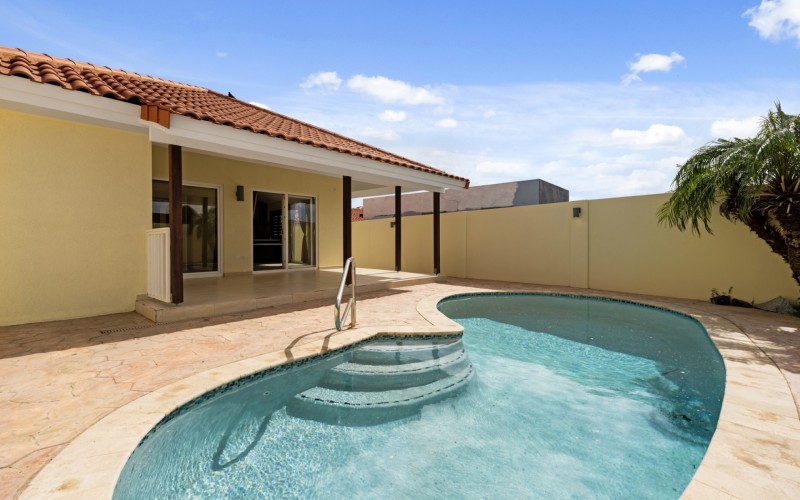Family Living in Modanza Villa Park – Turn-Key Comfort with Pool Discover the perfect blend of comfort, style, and modern convenience in this move-in-ready family home at Modanza Villa Park. Situated on 326 m² of property land with 132 m² of thoughtfully designed living space, this home enjoys a prime position at the end of a quiet cul-de-sac—offering peace, privacy, and a true family-friendly atmosphere. Step inside and you’re welcomed by a bright, open-concept layout where kitchen, dining, and living areas flow seamlessly together. Large windows fill the home with natural light, while oversized sliding doors invite the outdoors in. From here, your living space extends effortlessly onto the covered porch and backyard oasis. With a sparkling pool, outdoor shower, and shaded lounge areas, every day feels like a private retreat designed for both relaxation and entertaining. This home features 3 bedrooms and 2 bathrooms. The master suite conveniently has its ensuite bathroom, walk-in closet, and direct access to the pool. A second bedroom also boasts a walk-in closet, while the versatile third bedroom is ideal as a guest room, home office, or children’s room. The second bathroom is cleverly arranged with a separate guest toilet and a dedicated shower room, ensuring comfort and convenience for both family and visitors. Practical features add to the home’s appeal: a separate laundry room, hot water throughout, and a fully fenced yard that wraps around the property for added privacy and security. Perfect as a family residence or a turn-key investment, this home in Modanza Villa Park combines modern living with a Caribbean setting in a sought-after neighborhood known for its tranquility, privacy, and family-friendly setting. Ready to move in and start living the island lifestyle? Contact us today to book your private (or virtual) tour. 📞 +297 742 0129 📨