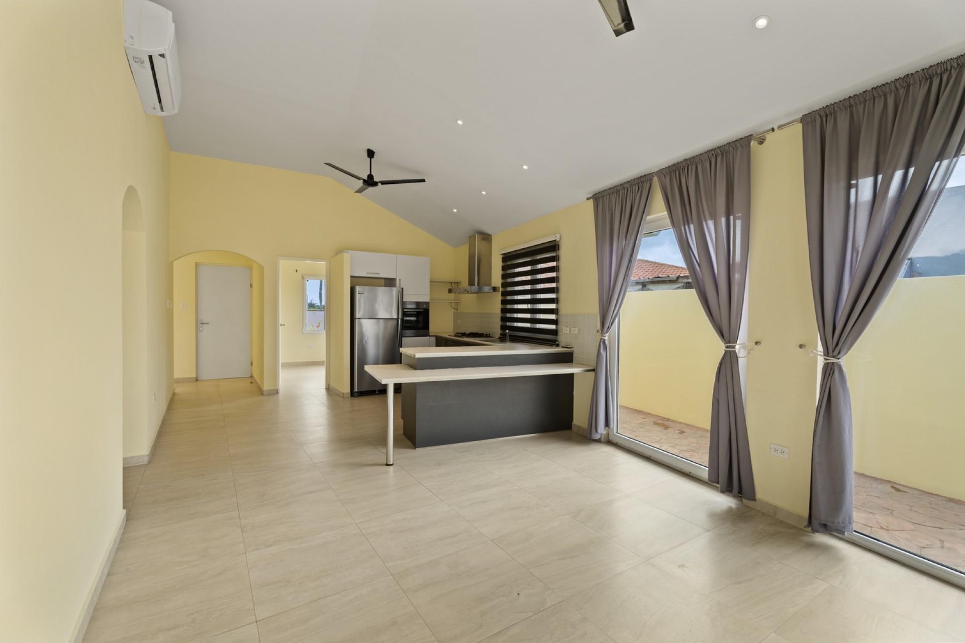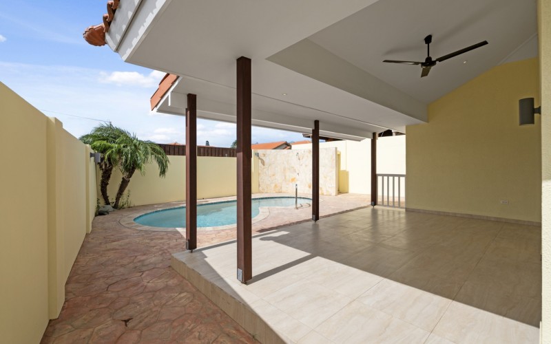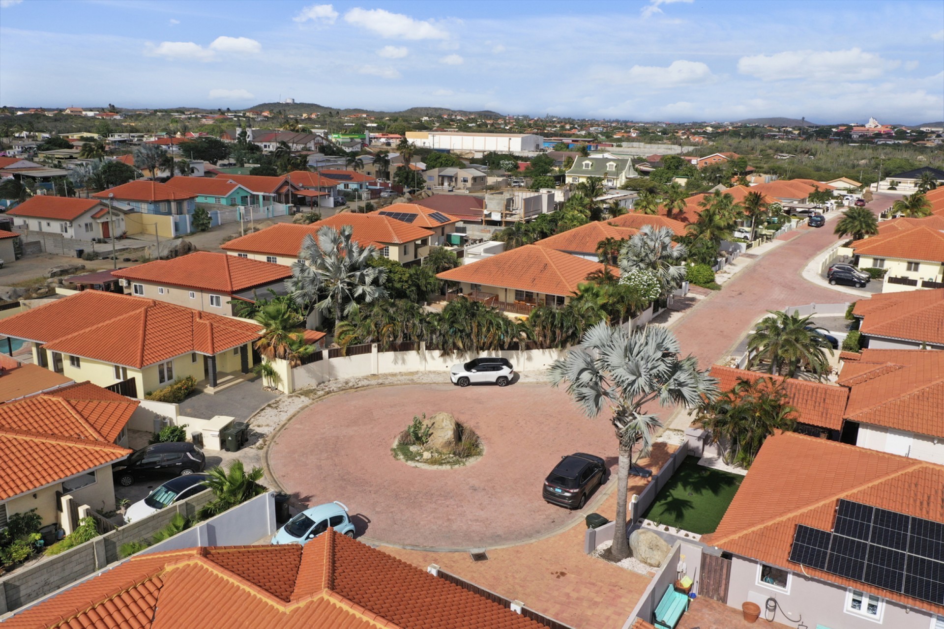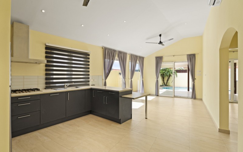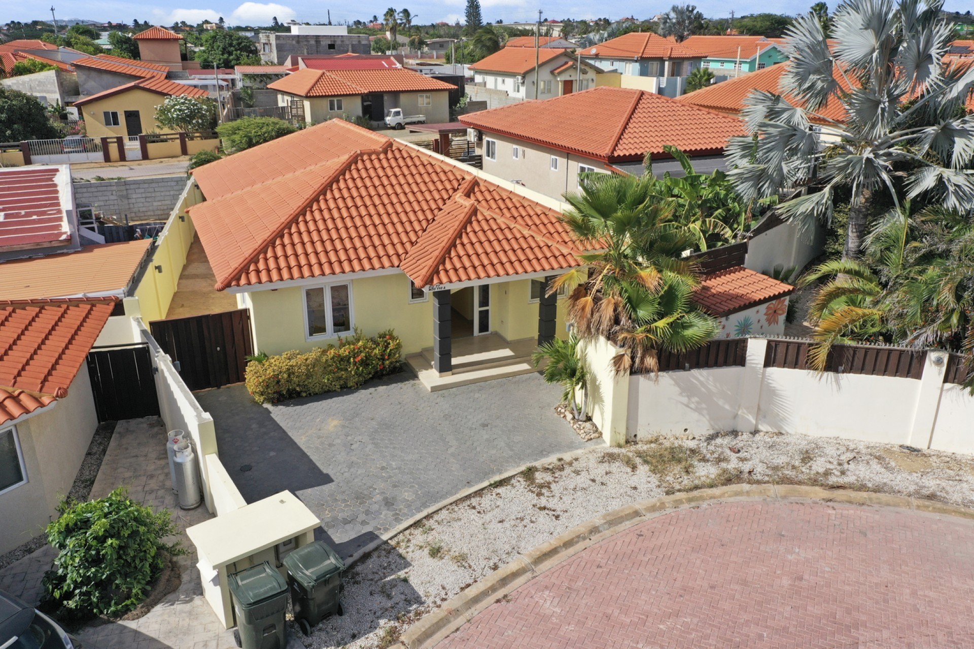 Family Living in Modanza Villa Park – Turn-Key Comfort with Pool Discover the perfect blend of comfort, style, and modern convenience in this move-in-ready family home at Modanza Villa Park. Situated on 326 m² of property land with 132 m² of thoughtfully designed living space, this home enjoys a prime position at the end of a quiet cul-de-sac—offering peace, privacy, and a true family-friendly atmosphere. Step inside and you’re welcomed by a bright, open-concept layout where kitchen, dining, and living areas flow seamlessly together. Large windows fill the home with natural light, while oversized sliding doors invite the outdoors in. From here, your living space extends effortlessly onto the covered porch and backyard oasis. With a sparkling pool, outdoor shower, and shaded lounge areas, every day feels like a private retreat designed for both relaxation and entertaining. This home features 3 bedrooms and 2 bathrooms. The master suite conveniently has its ensuite bathroom, walk-in closet, and direct access to the pool. A second bedroom also boasts a walk-in closet, while the versatile third bedroom is ideal as a guest room, home office, or children’s room. The second bathroom is cleverly arranged with a separate guest toilet and a dedicated shower room, ensuring comfort and convenience for both family and visitors. Practical features add to the home’s appeal: a separate laundry room, hot water throughout, and a fully fenced yard that wraps around the property for added privacy and security. Perfect as a family residence or a turn-key investment, this home in Modanza Villa Park combines modern living with a Caribbean setting in a sought-after neighborhood known for its tranquility, privacy, and family-friendly setting. Ready to move in and start living the island lifestyle? Contact us today to book your private (or virtual) tour. 📞 +297 742 0129 📨