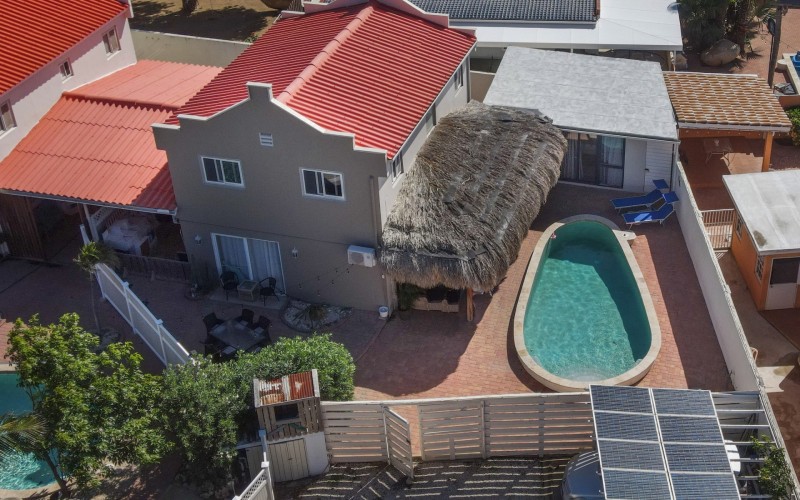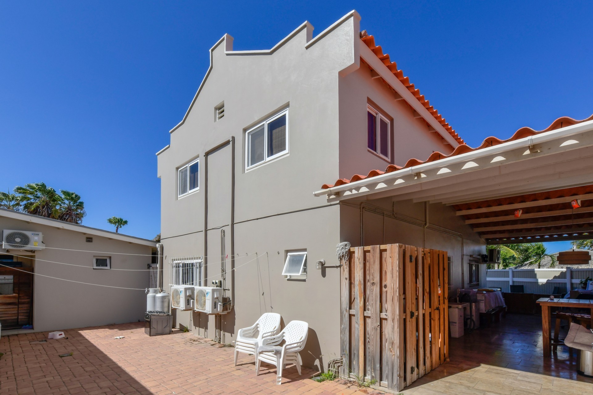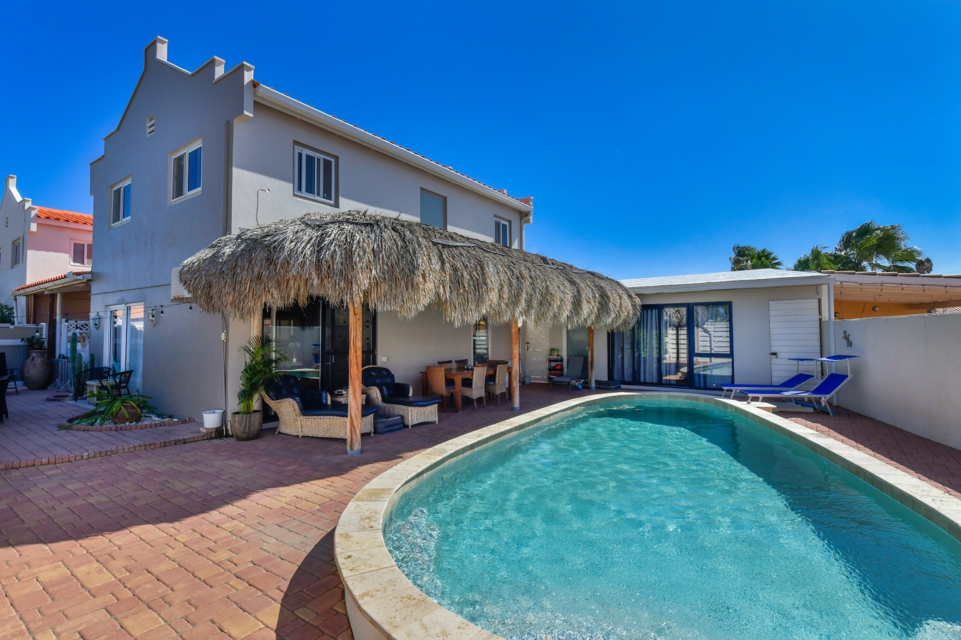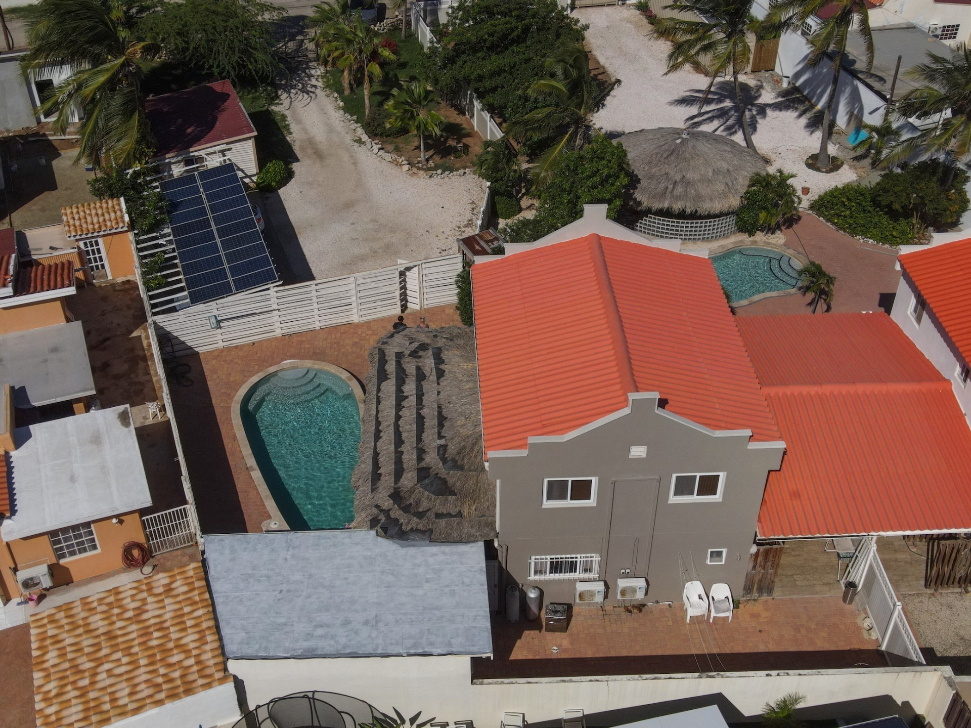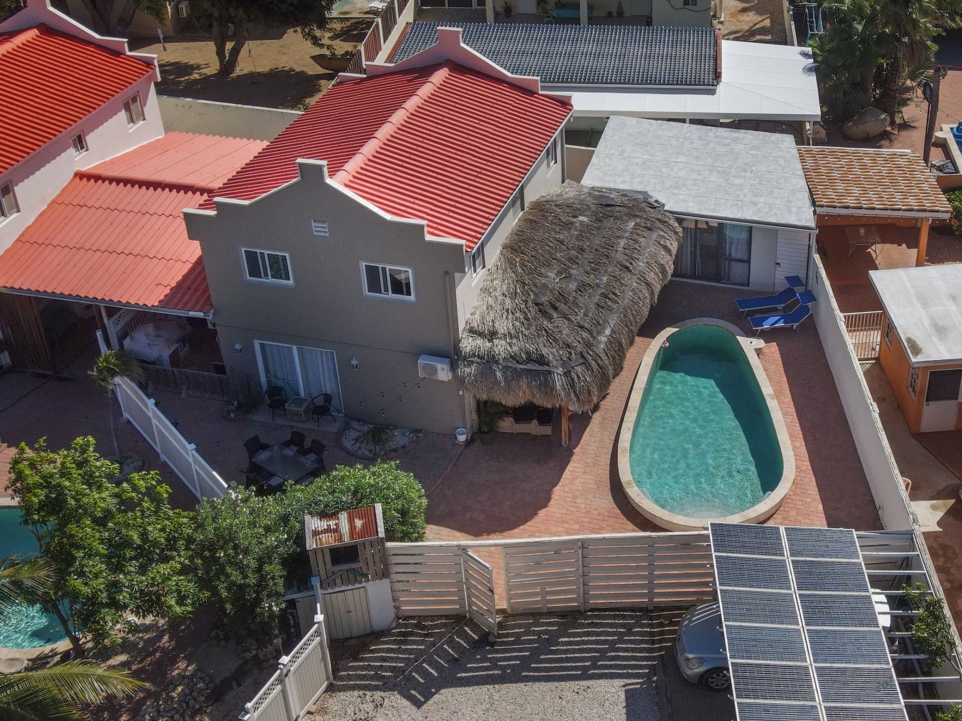 Charming villa with pool and guest apartment, on a spacious lot Welcome to this cozy two-story villa located in the quiet neighborhood of Montana. Set on a generous 882m² lot, the home is just a 5-minute drive from white sand beaches and close to supermarkets – perfect for easy island living. Inside the villa, the ground floor has a bright living room that flows into a half-open kitchen and dining area, perfect for daily life or entertaining. There is also a handy half bathroom near the kitchen. Upstairs, there are three bedrooms and two bathrooms, offering plenty of space and privacy for family or guests. The backyard includes an additional 24m² apartment with an open layout, kitchenette, and bathroom, ideal for guests, as a rental unit, or a home office. The tropical garden features palm trees, a private swimming pool, and a shaded palapa, perfect for relaxing or entertaining. There is ample parking in the front yard and the parking features solar panels. Montana 39G offers comfort, space, and a great location. Key Features: Total of 4 bedrooms & 3.5 bathrooms Property land 882m² Build-up size 198m² Extra 24m² apartment Palapa lounge for outdoor relaxation Contact us today to schedule a viewing and see this wonderful property for yourself! Bibi Louwers +297 5697343 [email protected]