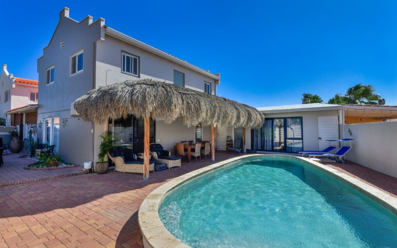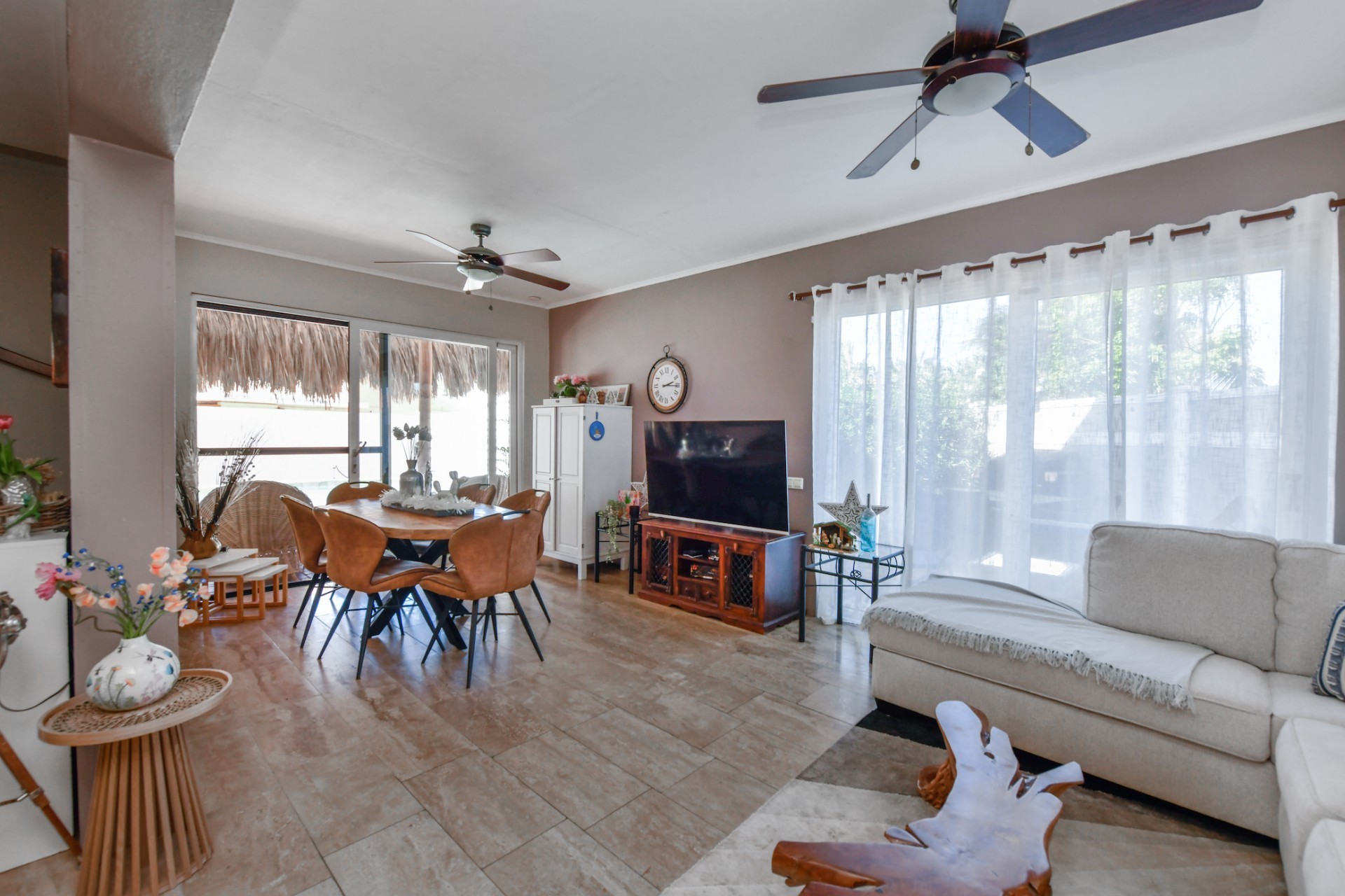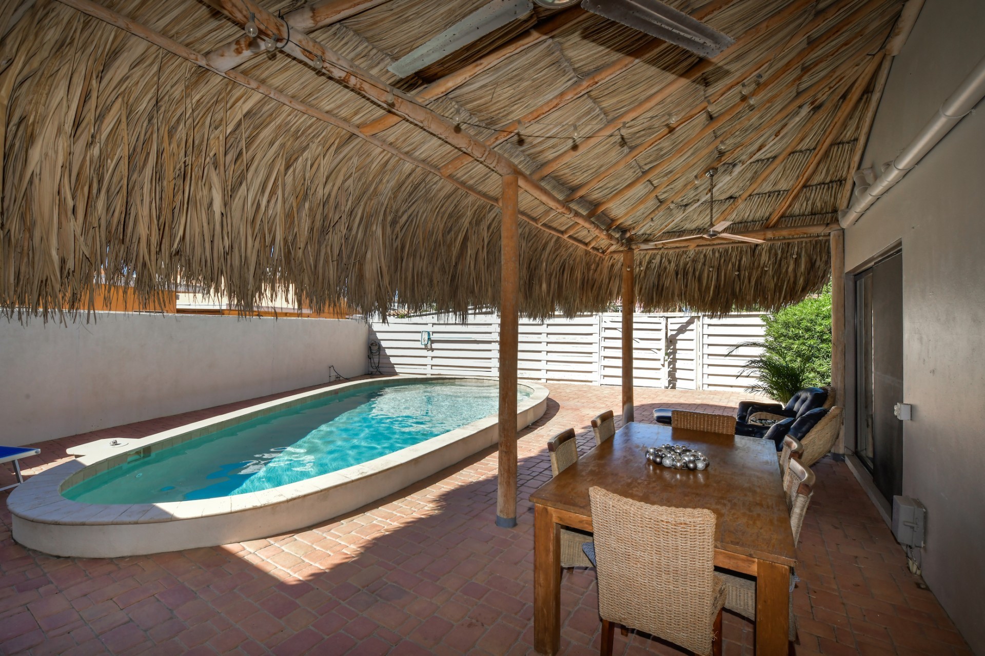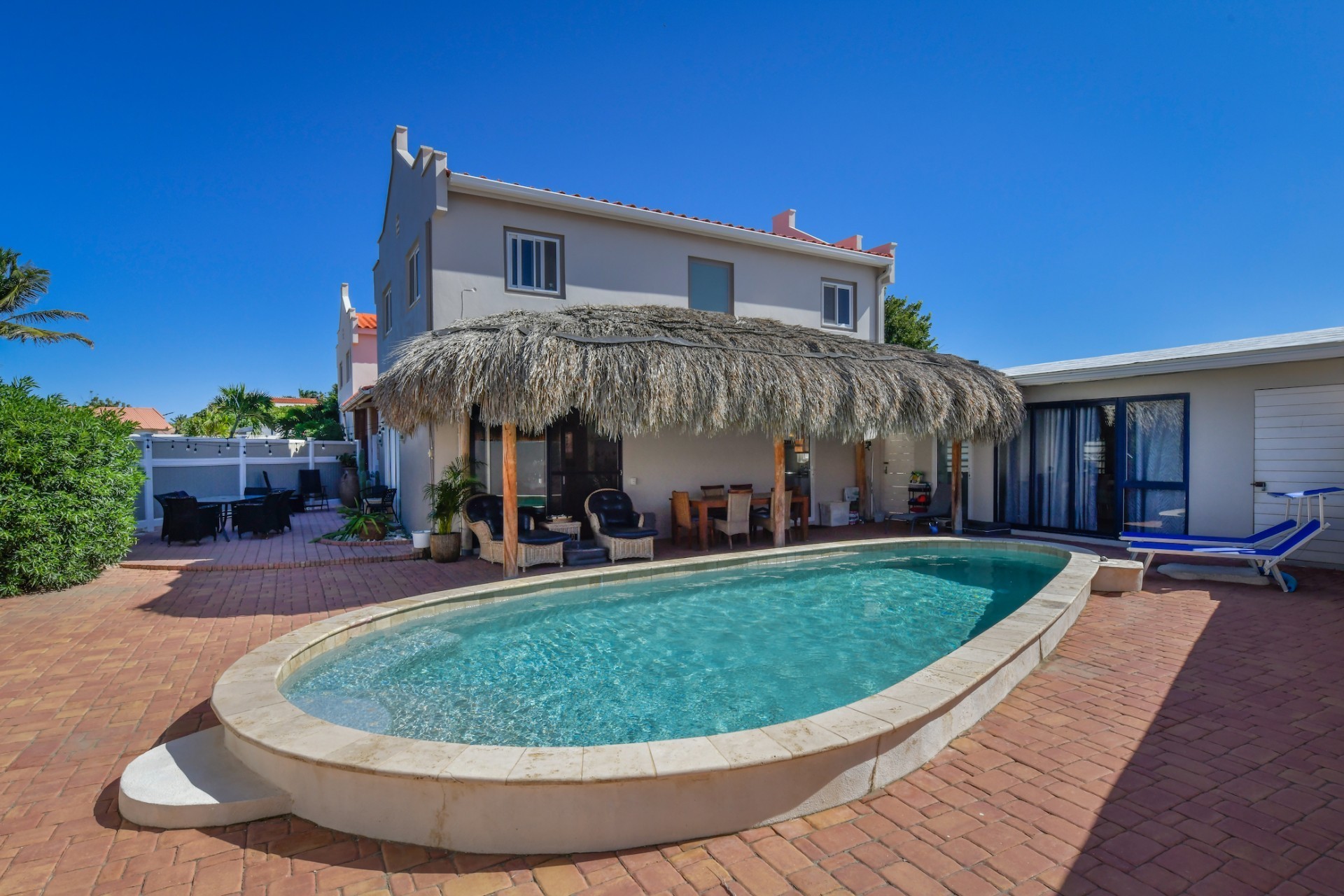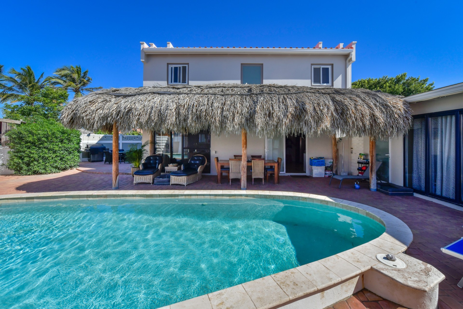 Charming villa with pool and guest apartment, on a spacious lot Welcome to this cozy two-story villa located in the quiet neighborhood of Montana. Set on a generous 882m² lot, the home is just a 5-minute drive from white sand beaches and close to supermarkets – perfect for easy island living. Inside the villa, the ground floor has a bright living room that flows into a half-open kitchen and dining area, perfect for daily life or entertaining. There is also a handy half bathroom near the kitchen. Upstairs, there are three bedrooms and two bathrooms, offering plenty of space and privacy for family or guests. The backyard includes an additional 24m² apartment with an open layout, kitchenette, and bathroom, ideal for guests, as a rental unit, or a home office. The tropical garden features palm trees, a private swimming pool, and a shaded palapa, perfect for relaxing or entertaining. There is ample parking in the front yard and the parking features solar panels. Montana 39G offers comfort, space, and a great location. Key Features: Total of 4 bedrooms & 3.5 bathrooms Property land 882m² Build-up size 198m² Extra 24m² apartment Palapa lounge for outdoor relaxation Contact us today to schedule a viewing and see this wonderful property for yourself! Bibi Louwers +297 5697343 [email protected]