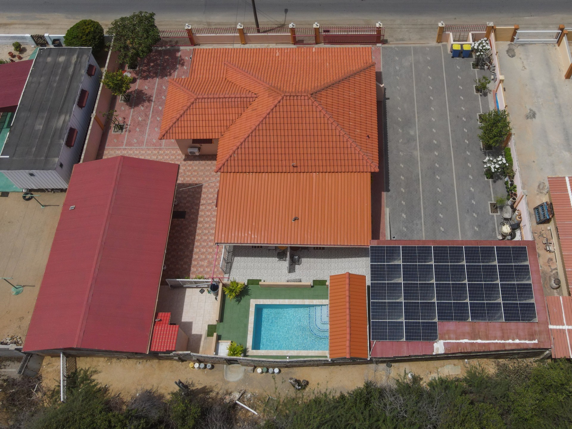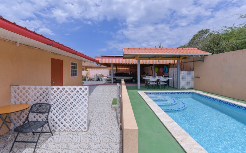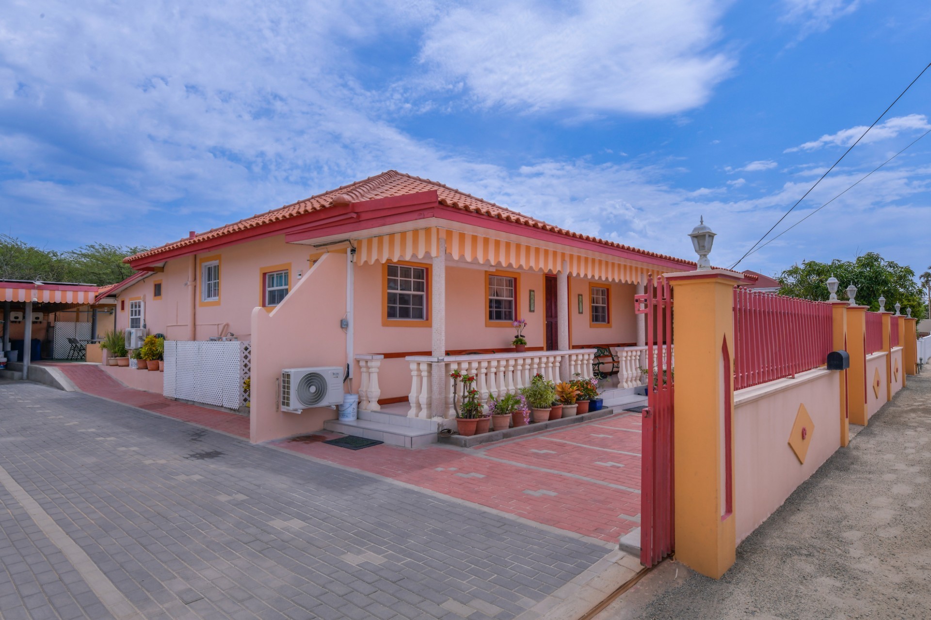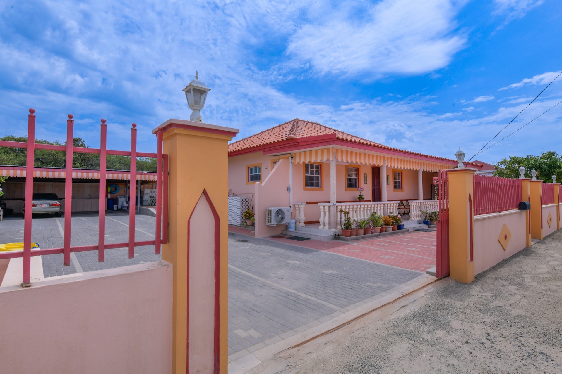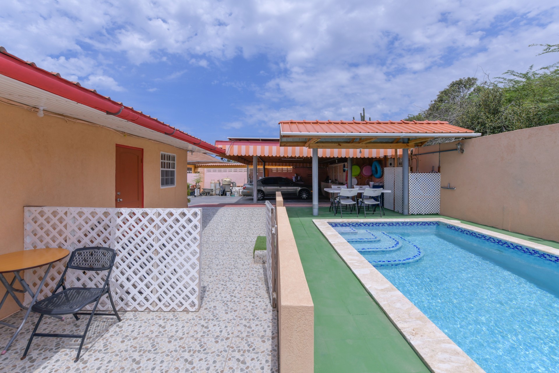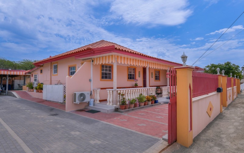 Charming Restored Bungalow with Unique Features in Lago Heights, San Nicolas This beautifully restored and meticulously maintained classic bungalow is located in the peaceful neighborhood of Lago Heights in San Nicolas, just an 8-minute drive from the stunning Baby Beach, one of Aruba’s most pristine and beloved coastal destinations. Situated on a generous 761 m² long lease lot (recently renewed), this spacious home offers three bedrooms and three bathrooms, providing ample space for comfortable family living or a flexible investment opportunity. In addition to the main residence, the property includes two adjacent studio apartments, perfect for accommodating guests or generating rental income. A separate structure currently used as a chapel adds a unique touch—ideal for creative pursuits, meditation, or a home office. Outdoor features include a refreshing swimming pool, two-vehicle carport, and ample covered storage with organized closets. The home is also equipped with solar panels for energy efficiency, a secure front gate, perimeter wall, and a paved entrance and low-maintenance hardscape landscaping. This is a rare opportunity to own a truly distinctive property that blends charm, functionality, and an unbeatable location near Aruba’s top beach.
