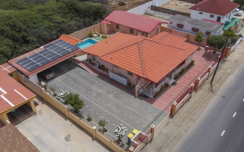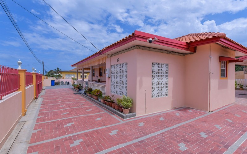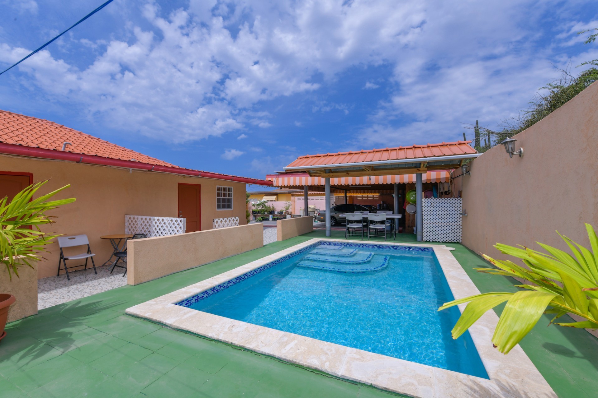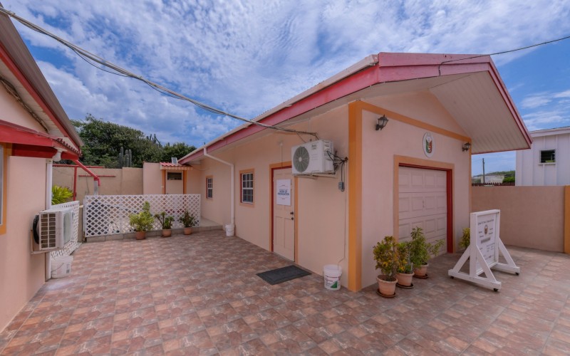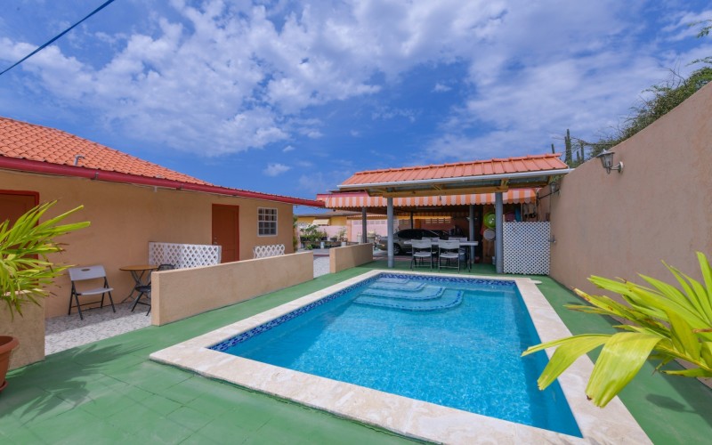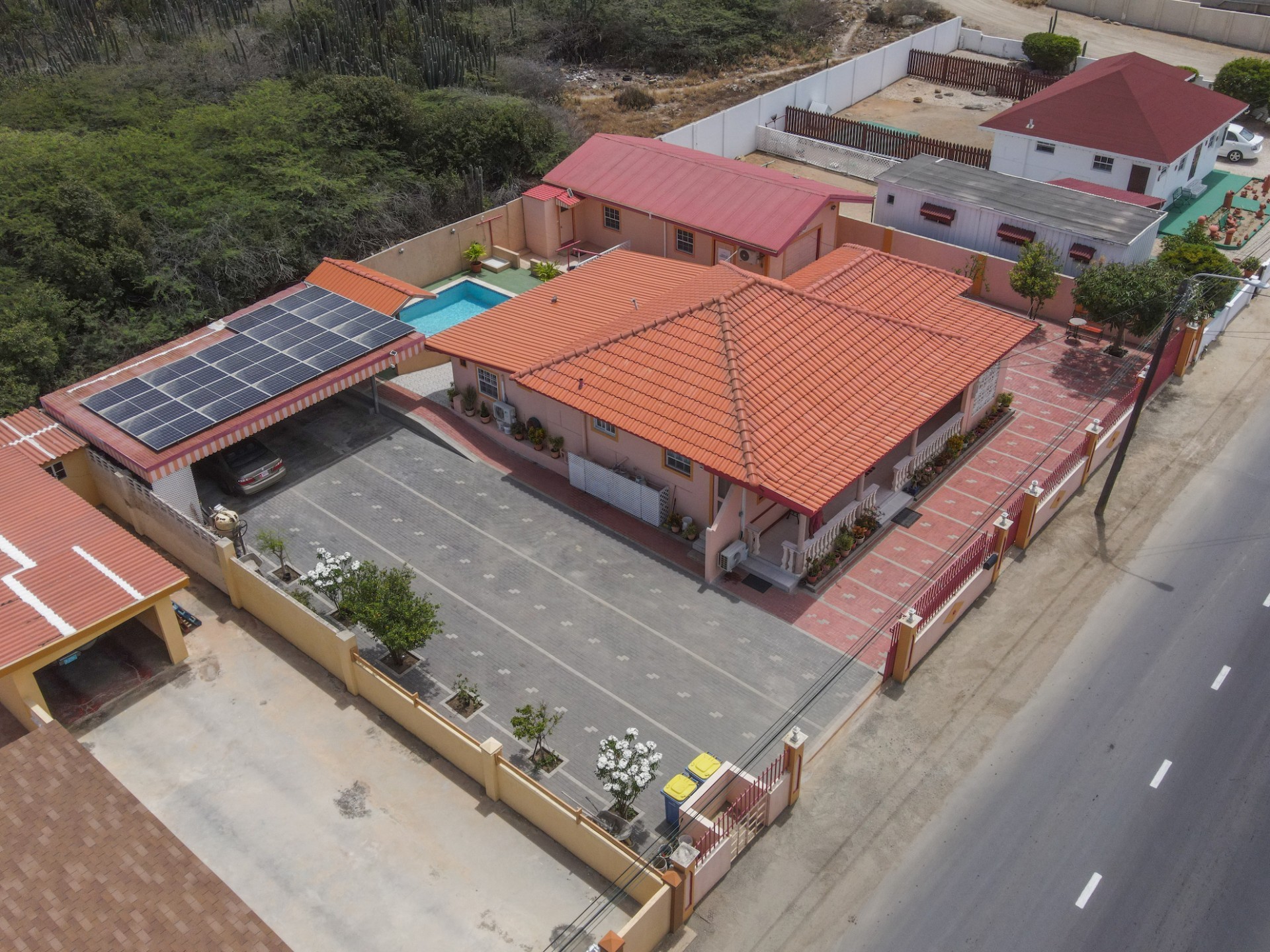 Charming Restored Bungalow with Unique Features in Lago Heights, San Nicolas This beautifully restored and meticulously maintained classic bungalow is located in the peaceful neighborhood of Lago Heights in San Nicolas, just an 8-minute drive from the stunning Baby Beach, one of Aruba’s most pristine and beloved coastal destinations. Situated on a generous 761 m² long lease lot (recently renewed), this spacious home offers three bedrooms and three bathrooms, providing ample space for comfortable family living or a flexible investment opportunity. In addition to the main residence, the property includes two adjacent studio apartments, perfect for accommodating guests or generating rental income. A separate structure currently used as a chapel adds a unique touch—ideal for creative pursuits, meditation, or a home office. Outdoor features include a refreshing swimming pool, two-vehicle carport, and ample covered storage with organized closets. The home is also equipped with solar panels for energy efficiency, a secure front gate, perimeter wall, and a paved entrance and low-maintenance hardscape landscaping. This is a rare opportunity to own a truly distinctive property that blends charm, functionality, and an unbeatable location near Aruba’s top beach.