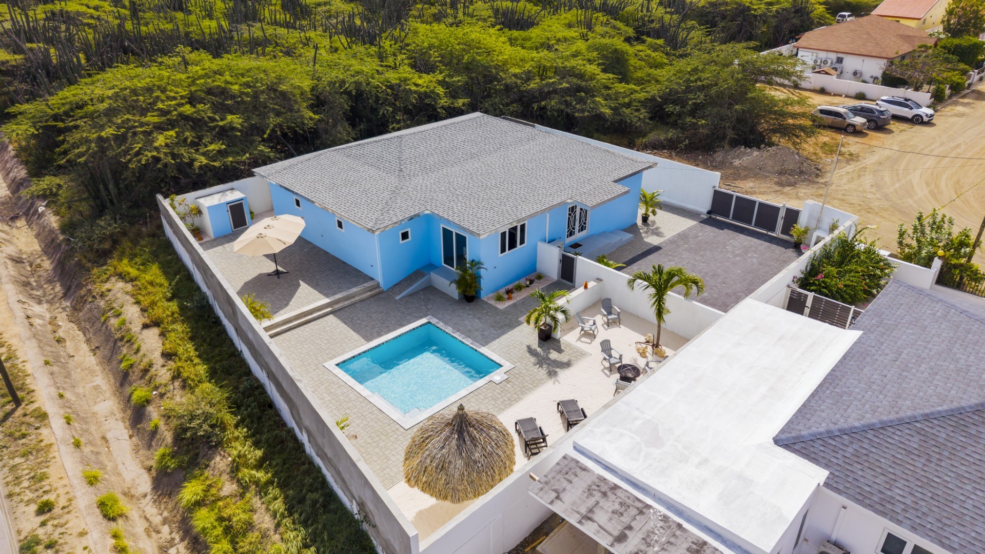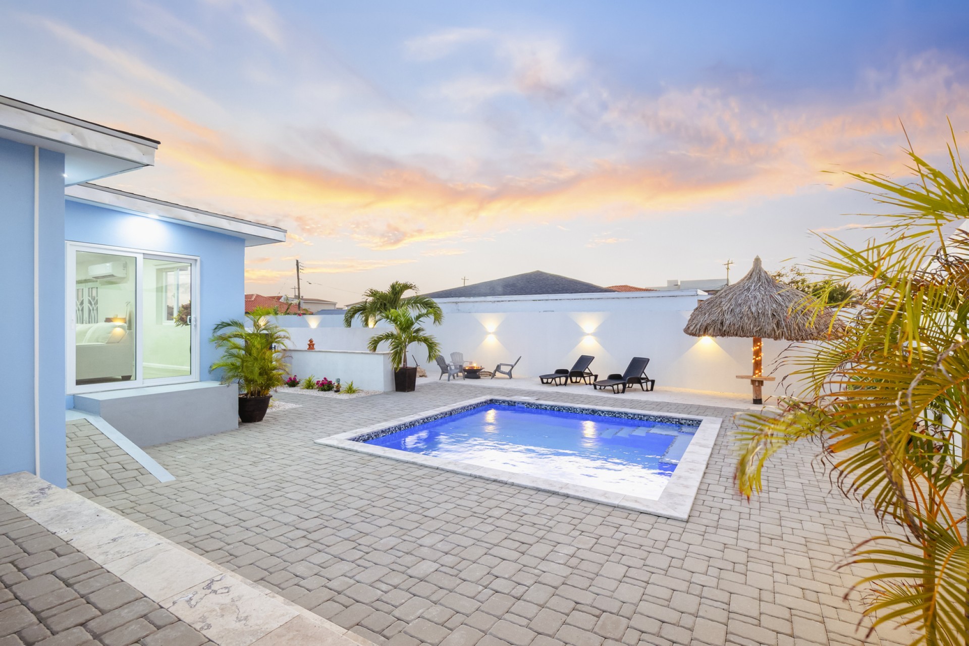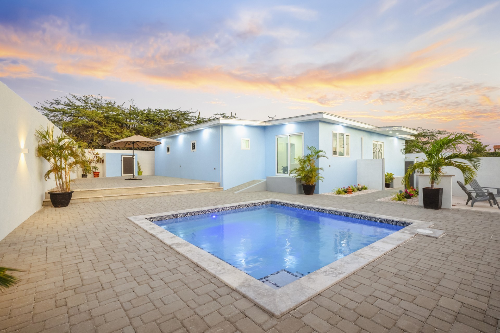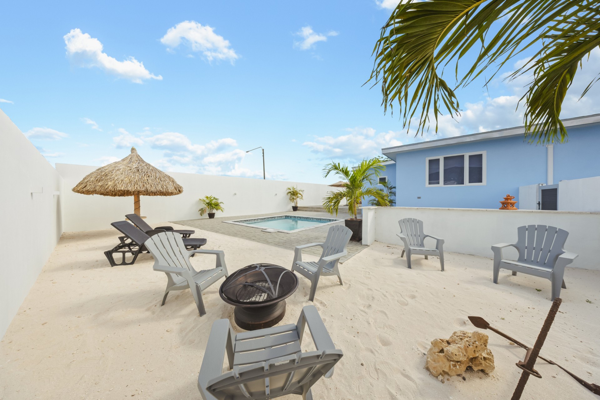 Tropical Luxury in Noord – Fully Renovated 4-Bedroom Villa Near Eagle Beach Tucked away in a quiet cul-de-sac in Noord, just 1 mile from Eagle Beach, this completely renovated villa delivers the perfect blend of privacy, modern comfort, and island lifestyle. Sitting on 607 m² of full-ownership land, fully gated and move-in ready, this home is designed to impress from the moment you arrive. A generous private driveway leads you into your own oasis. Step into a beautifully landscaped tropical garden featuring your private beach-style lounge with palapa, a cozy fire pit for evenings under the stars, and multiple relaxation areas—all centered around a sparkling pool. The expansive backyard still offers ample space to bring your own vision to life, whether that’s a pergola with dining for large gatherings or a custom outdoor lounge designed for effortless entertaining. Inside feels like a brand-new home. The open-concept layout centers around a sleek kitchen with a large island, abundant storage, and modern appliances, flowing seamlessly into a bright living area with sliding doors to the garden—creating effortless indoor-outdoor living. All four bedrooms have their own en-suite bathrooms, finished in a clean, contemporary style. Two featuring soaking tubs and walk-in showers, and two with spacious walk-in showers. A dedicated laundry room with washer and dryer adds everyday convenience, while a beautifully finished half bathroom completes the home’s thoughtful layout. Whether you’re searching for a luxury vacation home or a high-potential investment, this turnkey villa checks every box. All brand new, fully renovated, and minutes from Aruba’s most famous beach. Homes like this don’t stay on the market long. Contact us today for more info, or to schedule your private viewing. 📞 +297 742 0129 📨