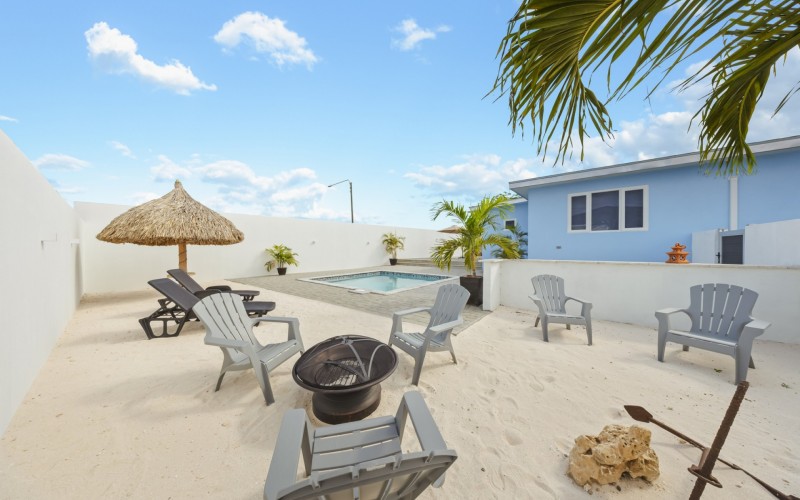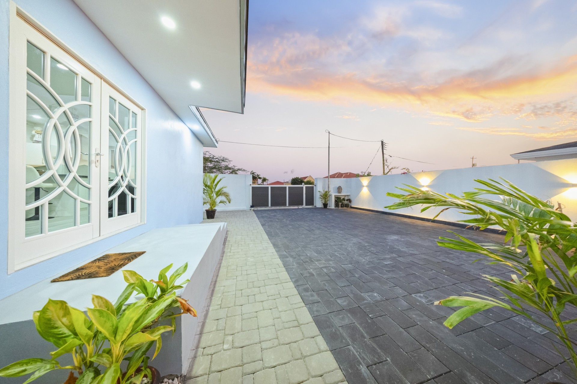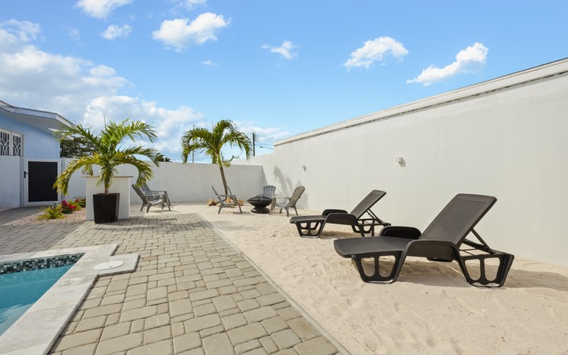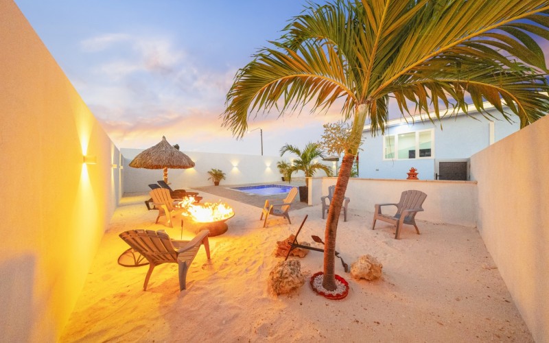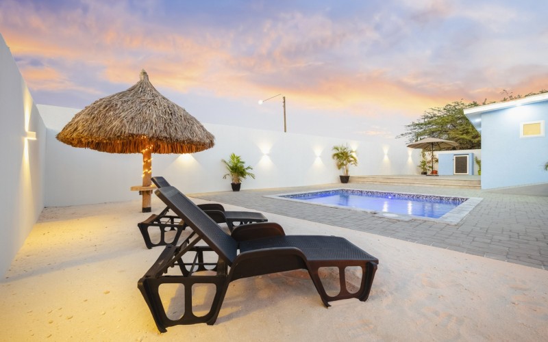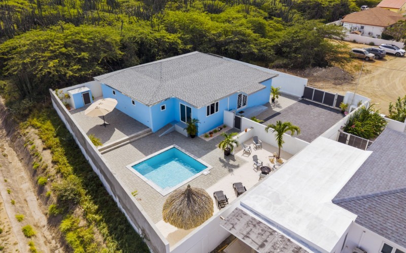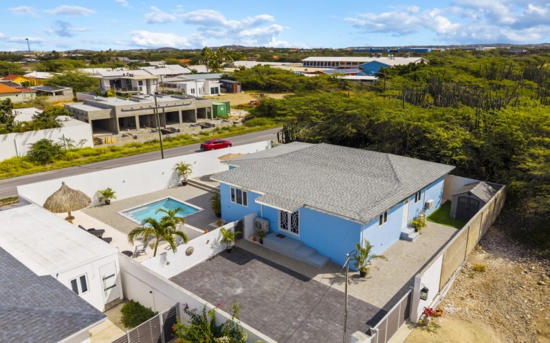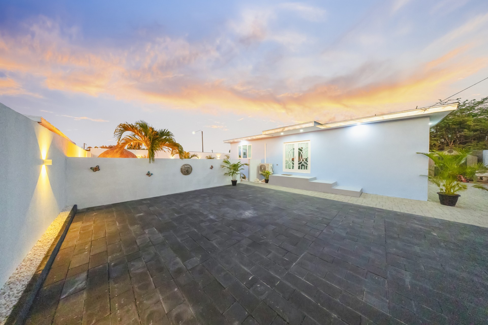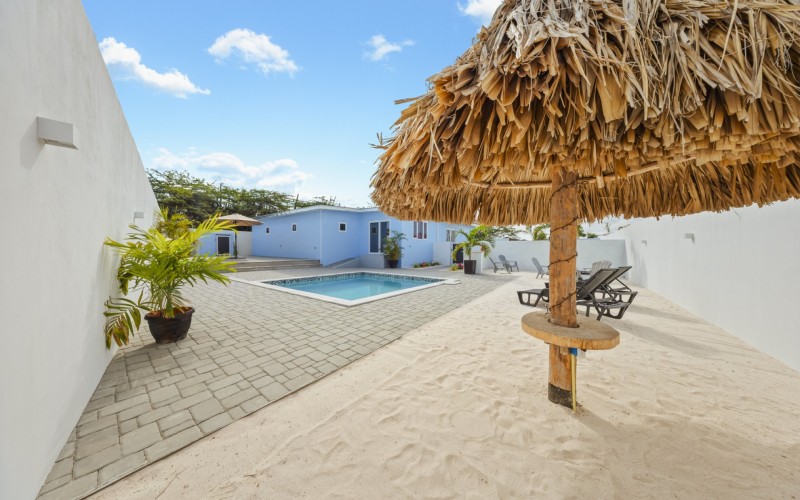 Tropical Luxury in Noord – Fully Renovated 4-Bedroom Villa Near Eagle Beach Tucked away in a quiet cul-de-sac in Noord, just 1 mile from Eagle Beach, this completely renovated villa delivers the perfect blend of privacy, modern comfort, and island lifestyle. Sitting on 607 m² of full-ownership land, fully gated and move-in ready, this home is designed to impress from the moment you arrive. A generous private driveway leads you into your own oasis. Step into a beautifully landscaped tropical garden featuring your private beach-style lounge with palapa, a cozy fire pit for evenings under the stars, and multiple relaxation areas—all centered around a sparkling pool. The expansive backyard still offers ample space to bring your own vision to life, whether that’s a pergola with dining for large gatherings or a custom outdoor lounge designed for effortless entertaining. Inside feels like a brand-new home. The open-concept layout centers around a sleek kitchen with a large island, abundant storage, and modern appliances, flowing seamlessly into a bright living area with sliding doors to the garden—creating effortless indoor-outdoor living. All four bedrooms have their own en-suite bathrooms, finished in a clean, contemporary style. Two featuring soaking tubs and walk-in showers, and two with spacious walk-in showers. A dedicated laundry room with washer and dryer adds everyday convenience, while a beautifully finished half bathroom completes the home’s thoughtful layout. Whether you’re searching for a luxury vacation home or a high-potential investment, this turnkey villa checks every box. All brand new, fully renovated, and minutes from Aruba’s most famous beach. Homes like this don’t stay on the market long. Contact us today for more info, or to schedule your private viewing. 📞 +297 742 0129 📨