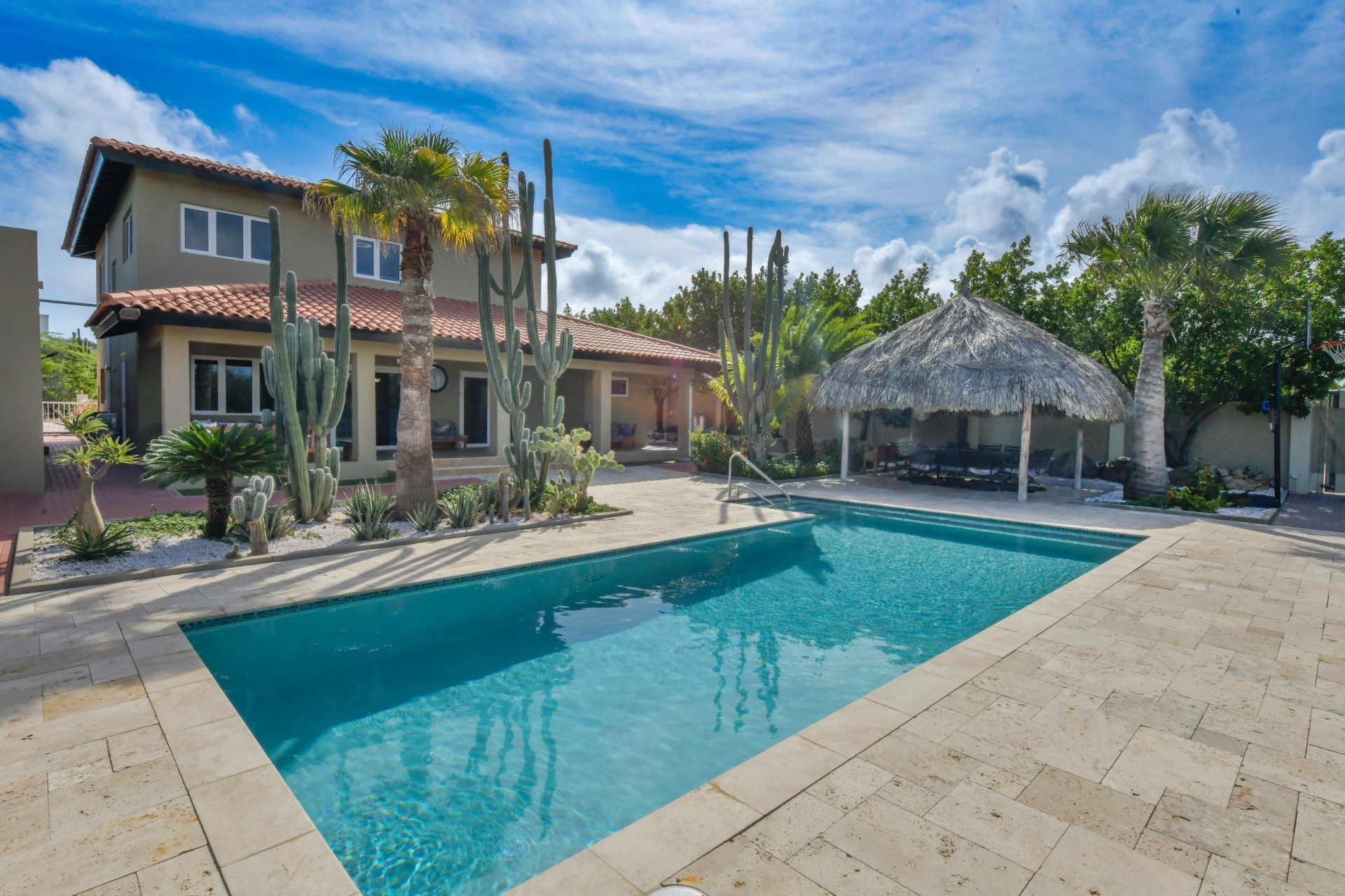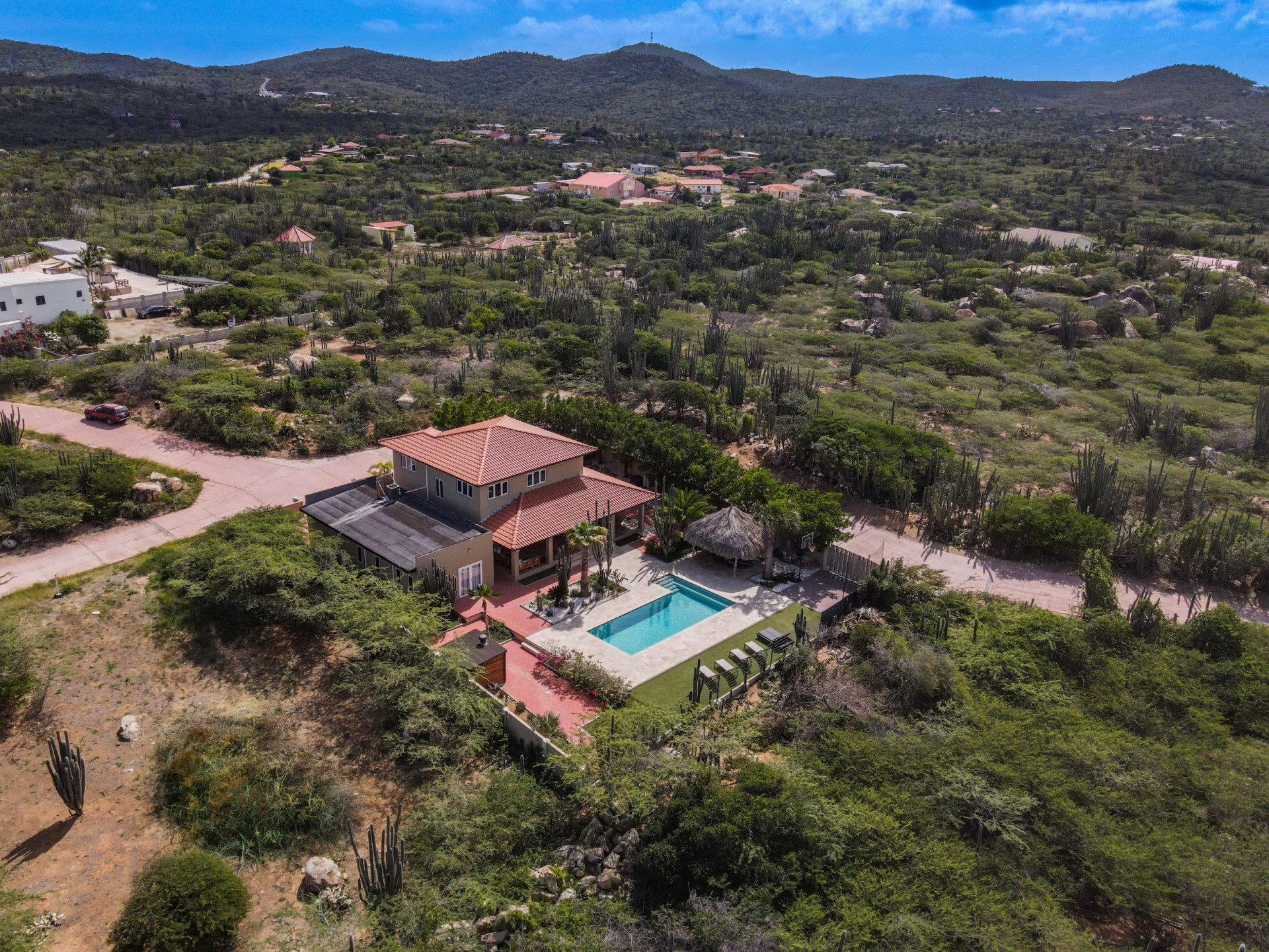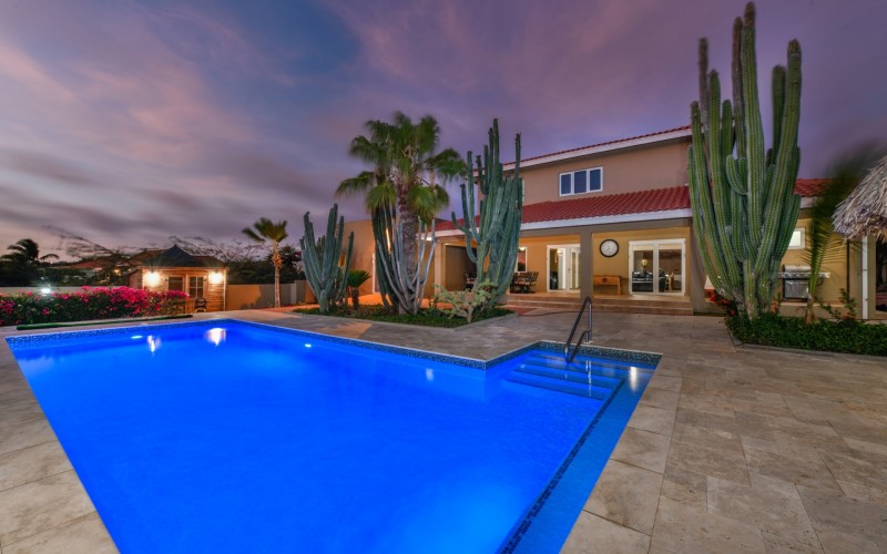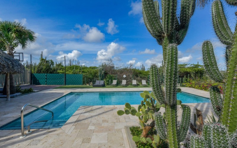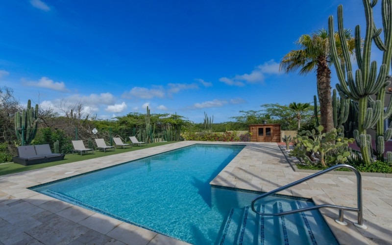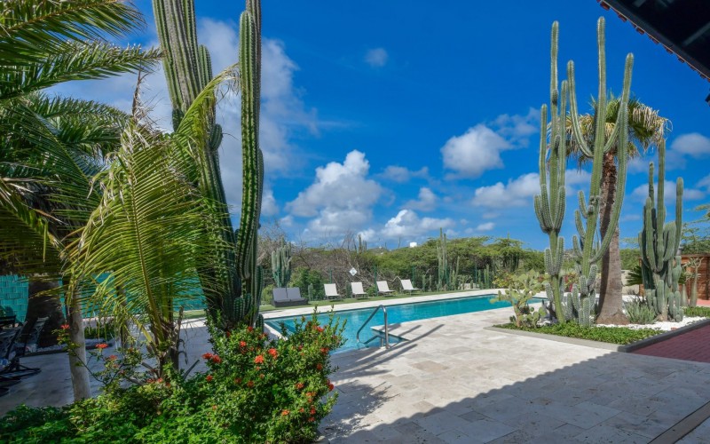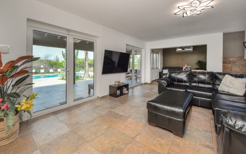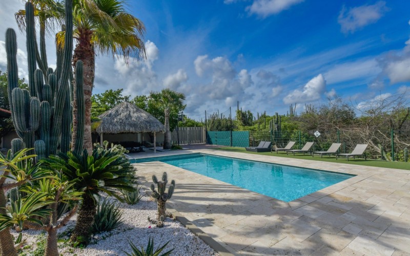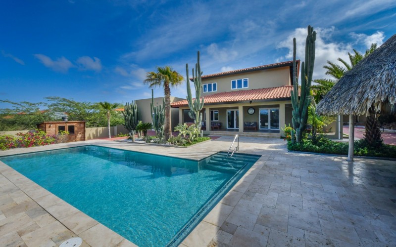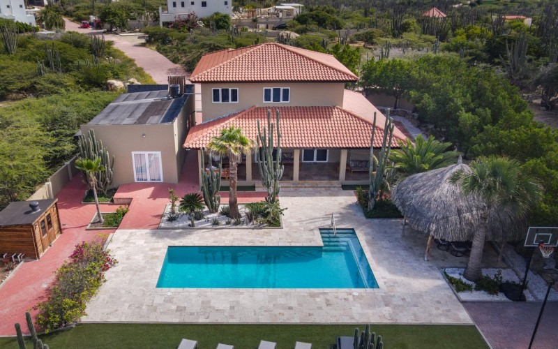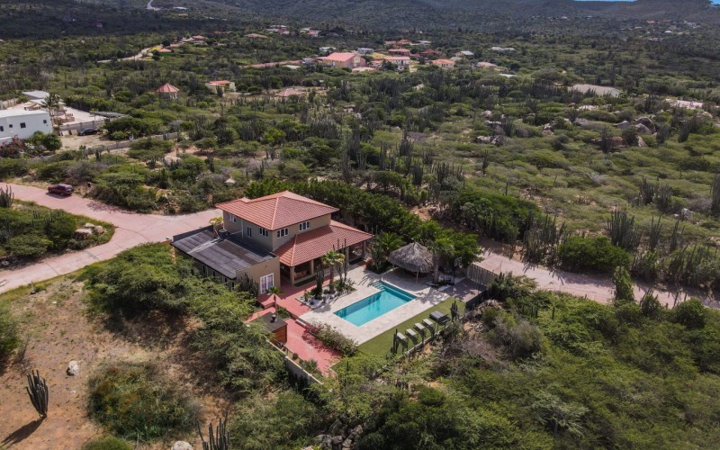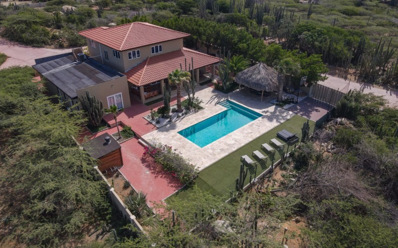 Stunning 5-Bedroom Villa with Pool + Apartment, and Expansive Garden in Santa Cruz Discover an exceptional property nestled in the tranquil, natural surroundings of Santa Cruz. This impressive villa sits on a generous 1,110 m² plot of property land, offering approximately 276m² of luxurious living space designed for comfort, privacy, and sophisticated living, with stunning views throughout the villa. The residence features 6 spacious bedrooms and 4.5 bathrooms, providing ample space for family, guests, and entertaining. The layout seamlessly balances openness with intimacy, creating an inviting atmosphere for both family life and social gatherings. On the ground floor, you will find a spacious living room, a half-open dining room, and kitchen. This level also includes two bedrooms, one full en-suite bathroom, and a guest toilet. Upstairs, the three bedrooms offer exceptional views, space, and comfort. A spacious one-bedroom apartment further enhances the villa, providing private accommodation ideal for guests, rental purposes, or use as a home office. Outside, the property is a true oasis, featuring a beautifully landscaped garden surrounding a swimming pool. The extensive grounds offer plenty of space to enjoy the peaceful, natural environment of Santa Cruz. This is a rare opportunity to own a luxurious home in a great residential area that combines generous indoor and outdoor spaces, a stunning garden, and a serene, nature-filled location—perfect for those seeking privacy, elegance, and an exceptional lifestyle. Key Features Total of 6 bedrooms & 4.5 bathrooms Property land: 1.110 m² Estimated build up size: 276 m² Spacious one bedroom apartment Palapa lounge and Swimming Pool for outdoor relaxation Contact us today to schedule a viewing and see this beautiful property for yourself! Bibi Louwers 📞 +297 569 7343 📧