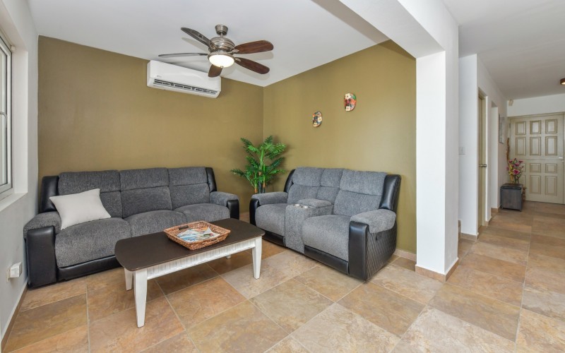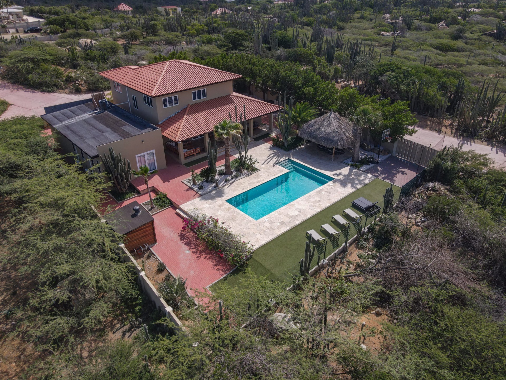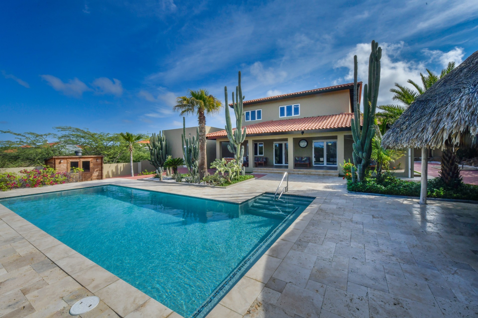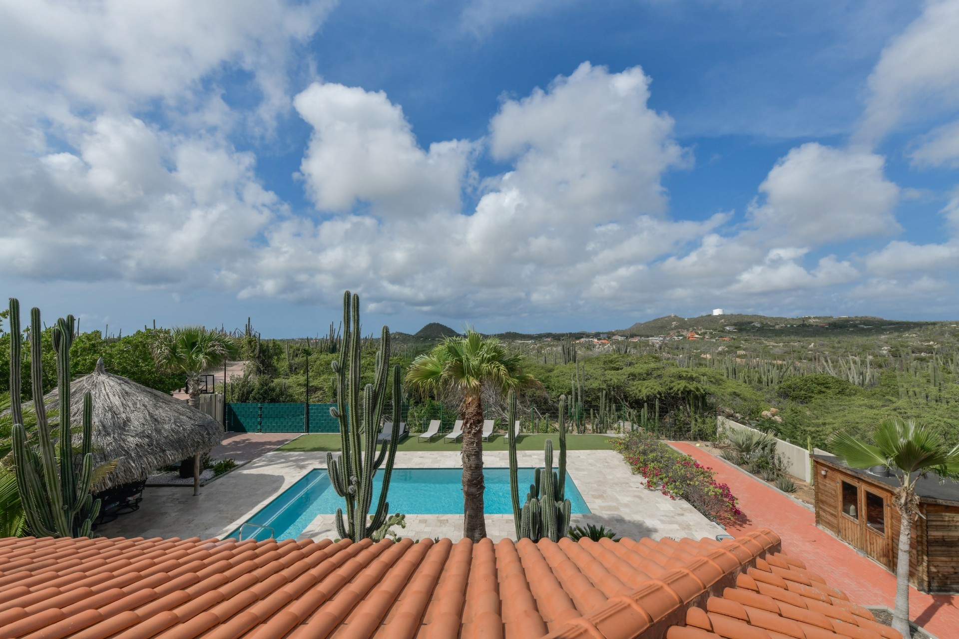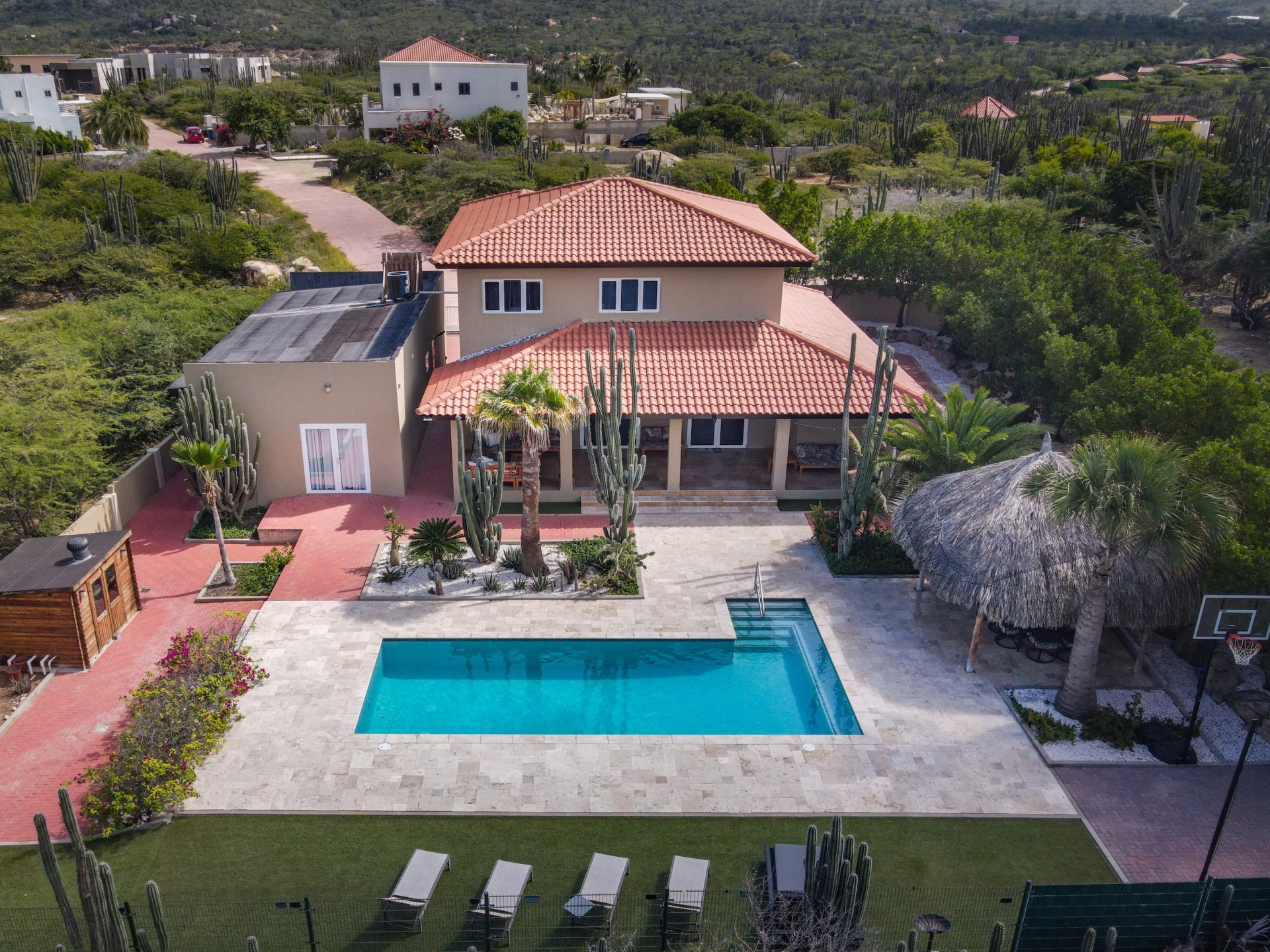 Stunning 5-Bedroom Villa with Pool + Apartment, and Expansive Garden in Santa Cruz Discover an exceptional property nestled in the tranquil, natural surroundings of Santa Cruz. This impressive villa sits on a generous 1,110 m² plot of property land, offering approximately 276m² of luxurious living space designed for comfort, privacy, and sophisticated living, with stunning views throughout the villa. The residence features 6 spacious bedrooms and 4.5 bathrooms, providing ample space for family, guests, and entertaining. The layout seamlessly balances openness with intimacy, creating an inviting atmosphere for both family life and social gatherings. On the ground floor, you will find a spacious living room, a half-open dining room, and kitchen. This level also includes two bedrooms, one full en-suite bathroom, and a guest toilet. Upstairs, the three bedrooms offer exceptional views, space, and comfort. A spacious one-bedroom apartment further enhances the villa, providing private accommodation ideal for guests, rental purposes, or use as a home office. Outside, the property is a true oasis, featuring a beautifully landscaped garden surrounding a swimming pool. The extensive grounds offer plenty of space to enjoy the peaceful, natural environment of Santa Cruz. This is a rare opportunity to own a luxurious home in a great residential area that combines generous indoor and outdoor spaces, a stunning garden, and a serene, nature-filled location—perfect for those seeking privacy, elegance, and an exceptional lifestyle. Key Features Total of 6 bedrooms & 4.5 bathrooms Property land: 1.110 m² Estimated build up size: 276 m² Spacious one bedroom apartment Palapa lounge and Swimming Pool for outdoor relaxation Contact us today to schedule a viewing and see this beautiful property for yourself! Bibi Louwers 📞 +297 569 7343 📧