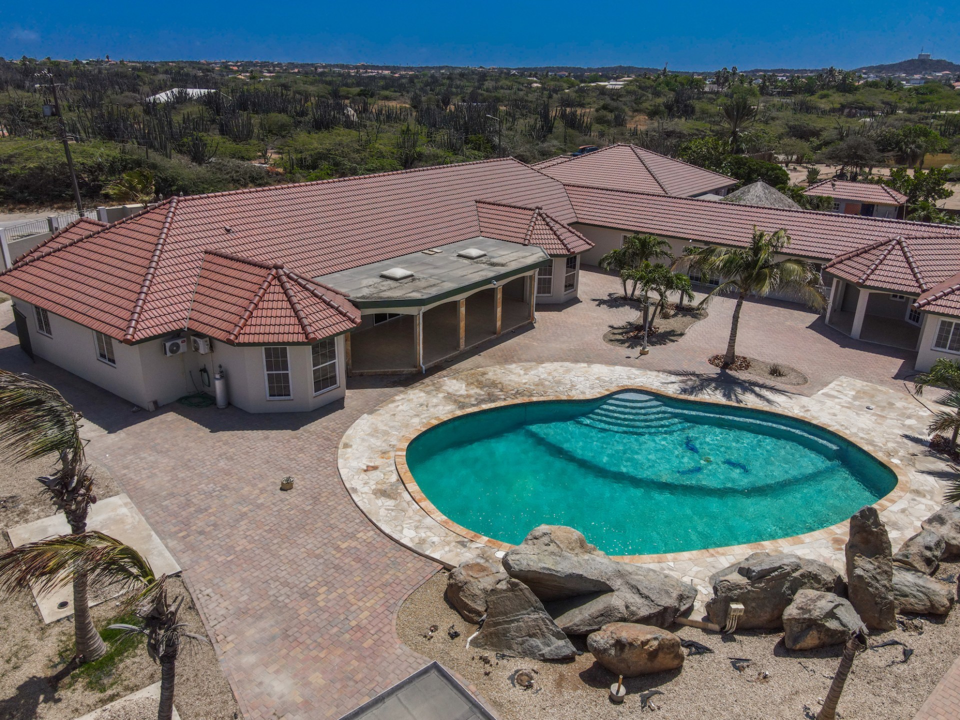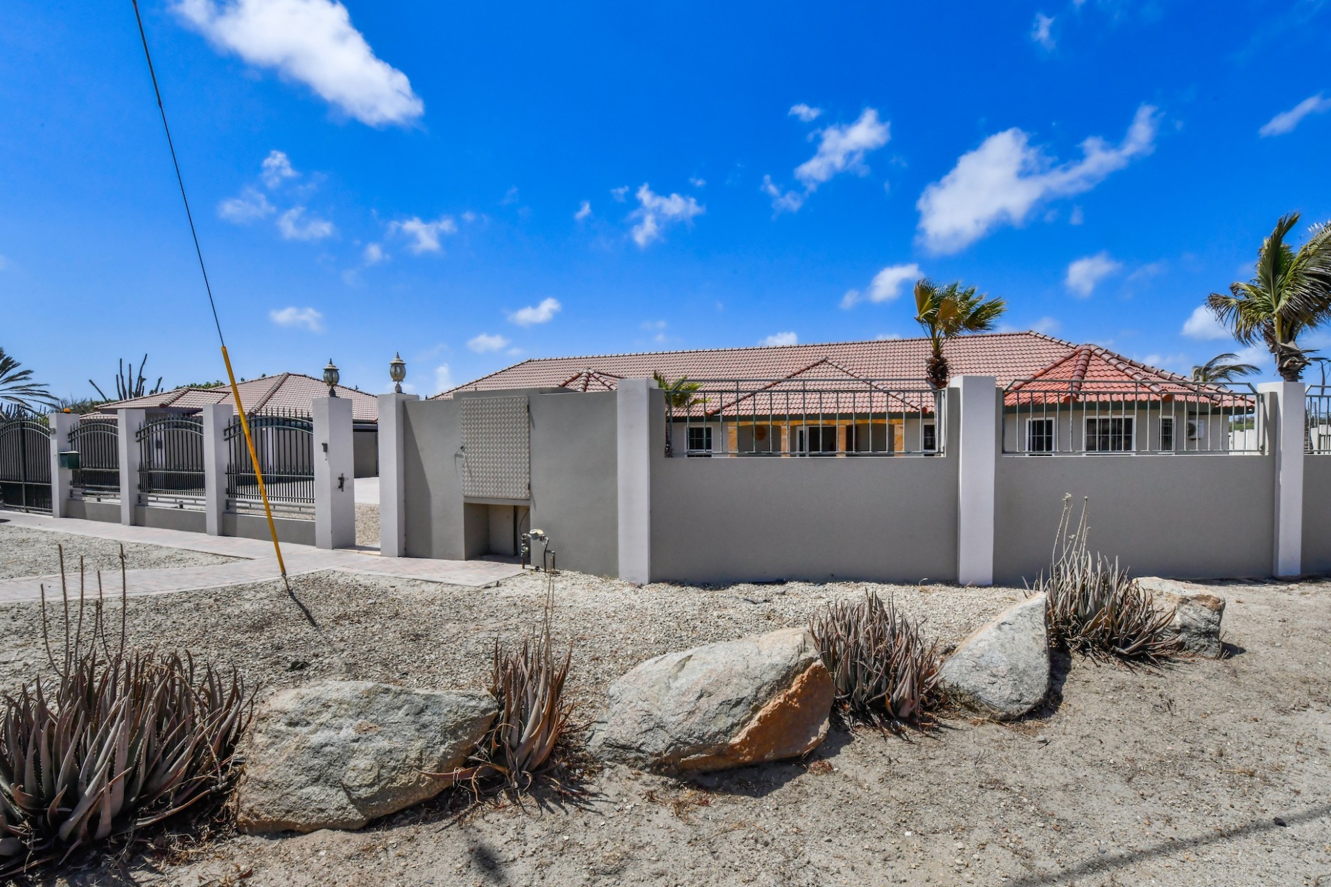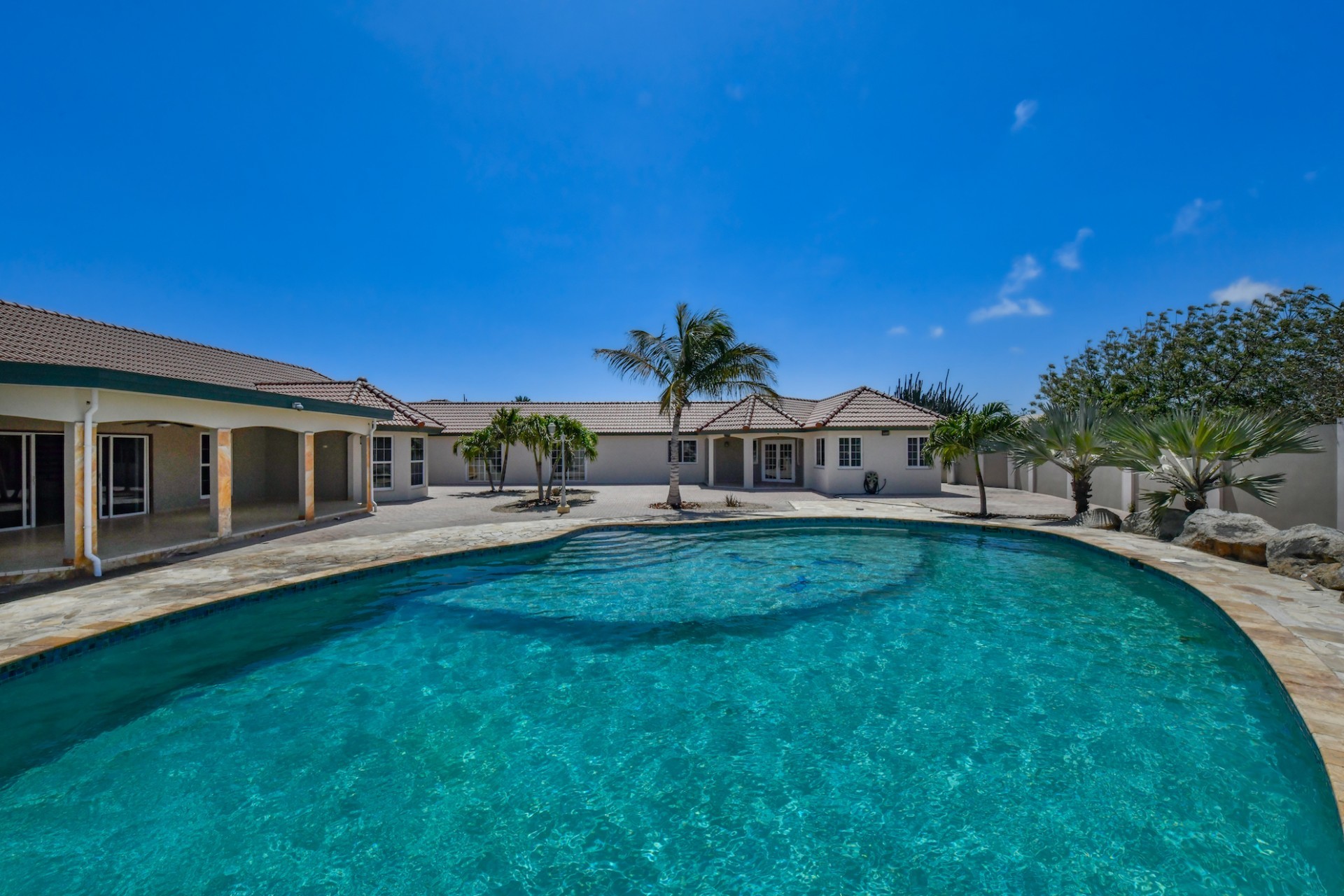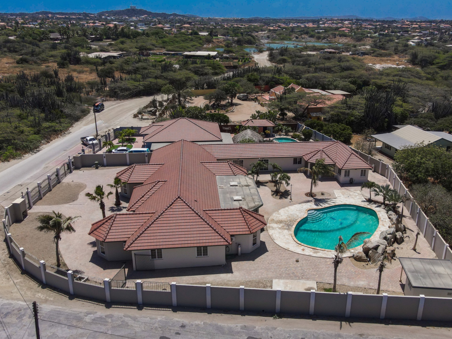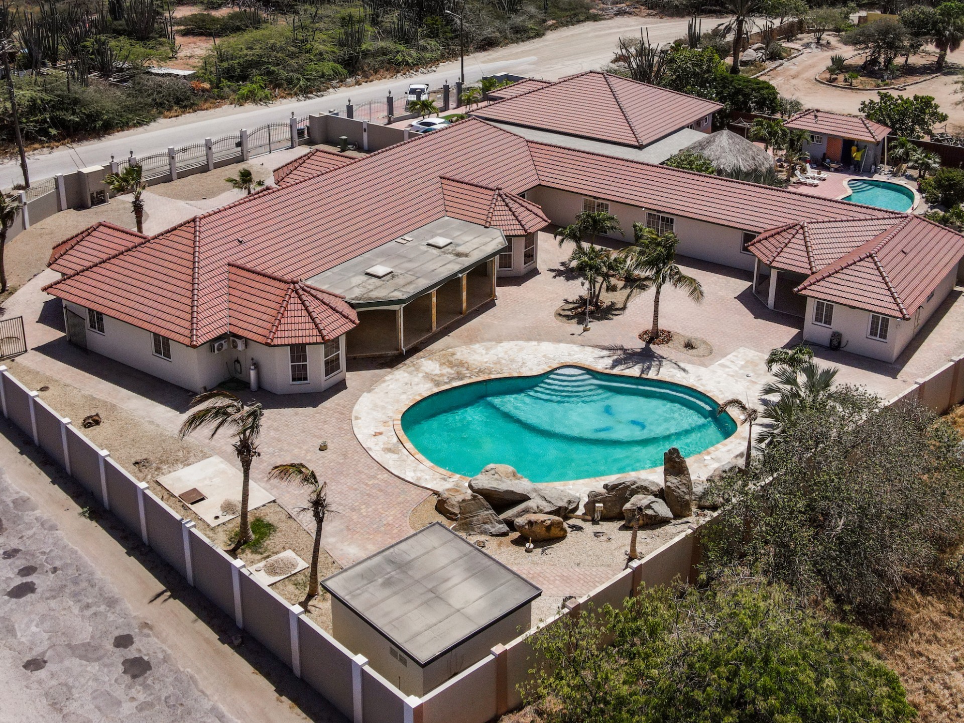 This spacious villa is a gem, the large swimming pool is the eye catcher of this beautiful property. The main house has 5 spacious bedrooms and 2.5 bathrooms. There is a separate guest house with 2 bedrooms and a bathroom. In the yard you will find an extra bathroom. The house is very centrally located in Seroe Janchi, North Aruba. The main house has an open floor plan, with a large fully equipped kitchen. On both sides of the living room you will find bedrooms. A spiral staircase takes you to a separate room where you have a beautiful view over the living room. Outside there is a covered patio with a lovely large swimming pool. A large garage connects the guest house with the main house. In the guest house you will find 2 bedrooms and 1 bathroom. On top of all this there is a storage room of 41m2 that can easily converted in a big office space. This beautiful property is build on 1464m2 property land with a build size of 562m2. Property highlights - 7 bedrooms - 3,5 bathrooms - very large pool - centrally located - guest house - 1464m2 property land - 562m2 build up size (338m2 house, 63m2 garage, 41 storage, 101m2 guest house) For more information or to schedule a viewing please contact Bibi Louwers: +297 569 7343 or [email protected]