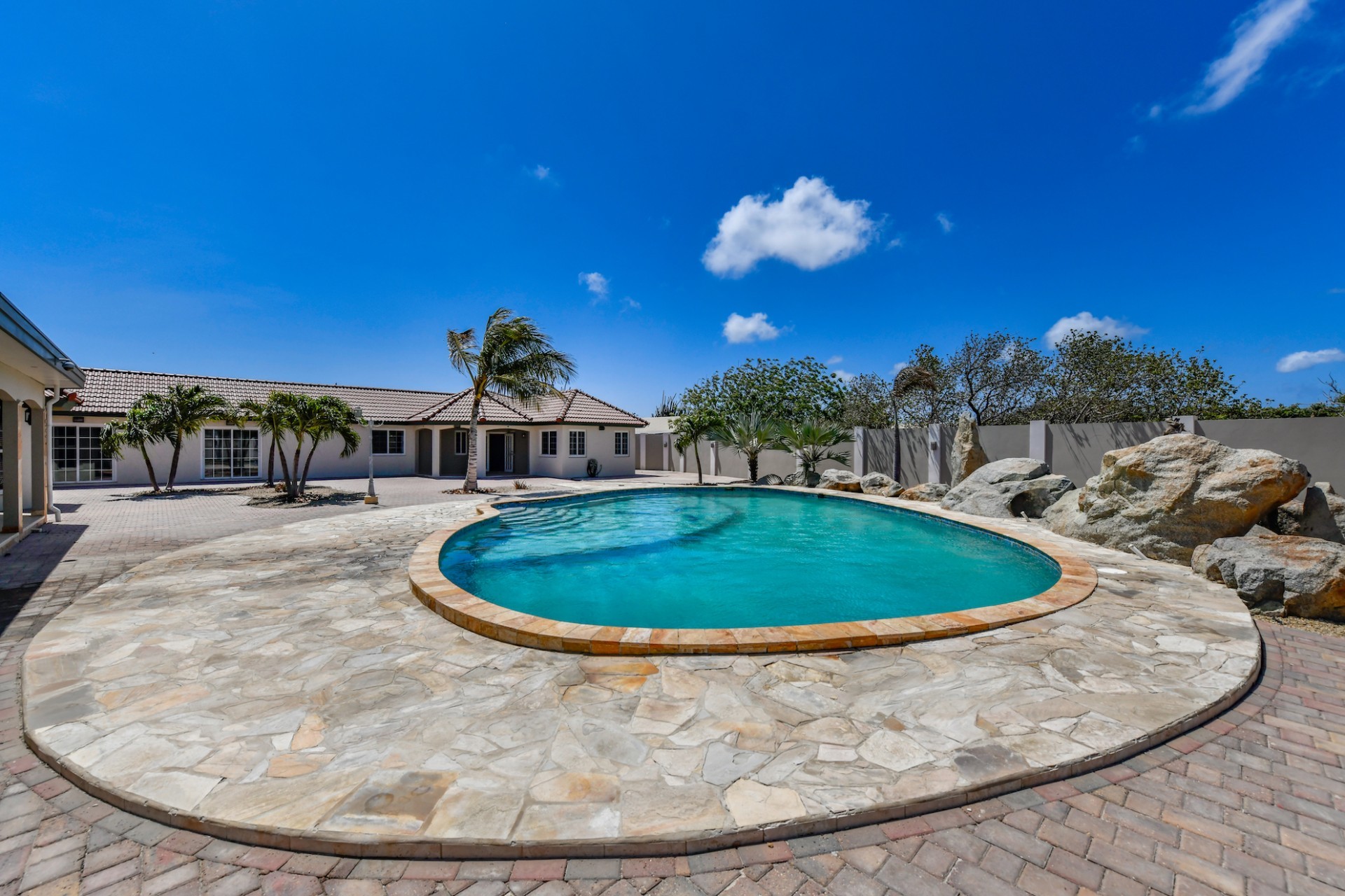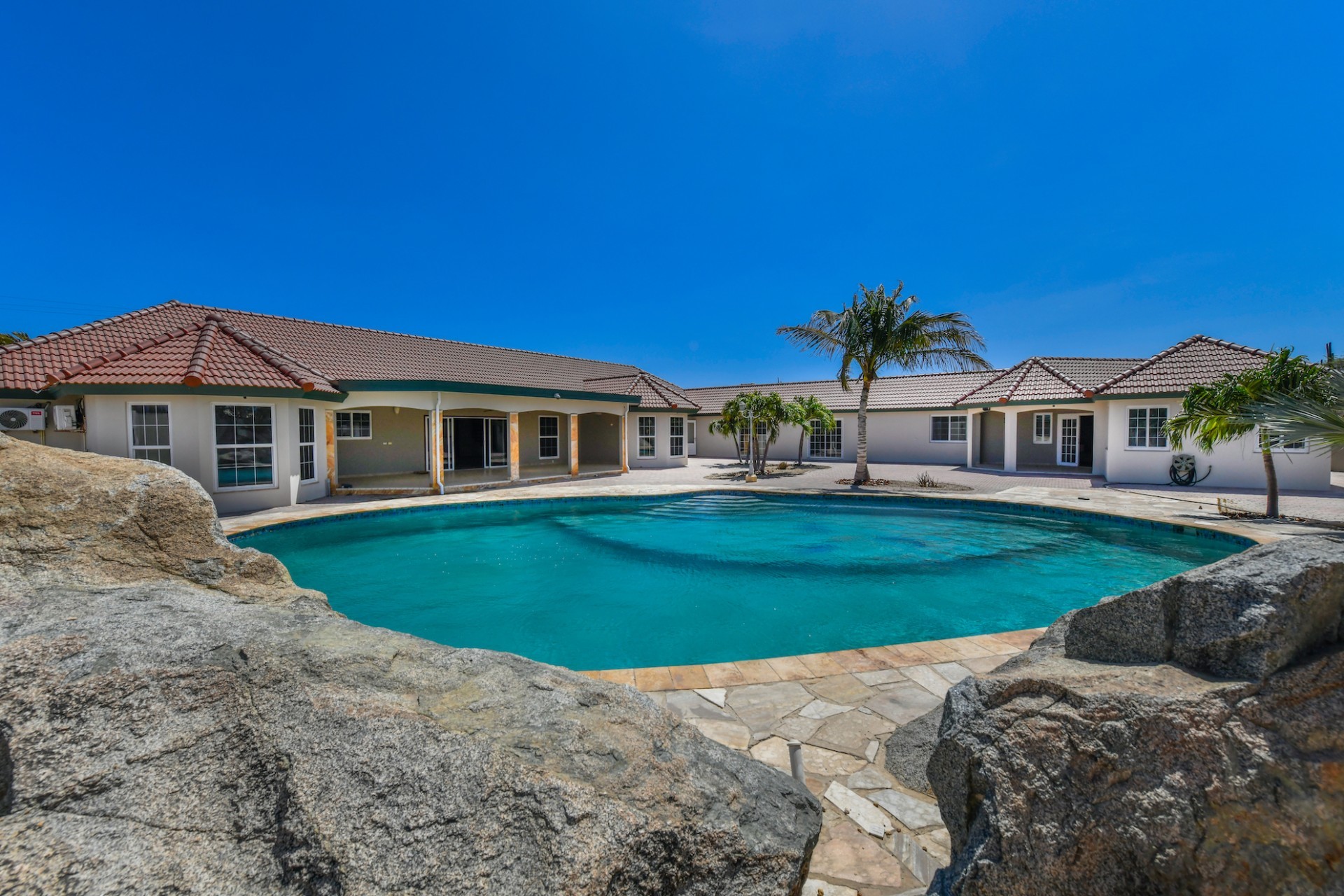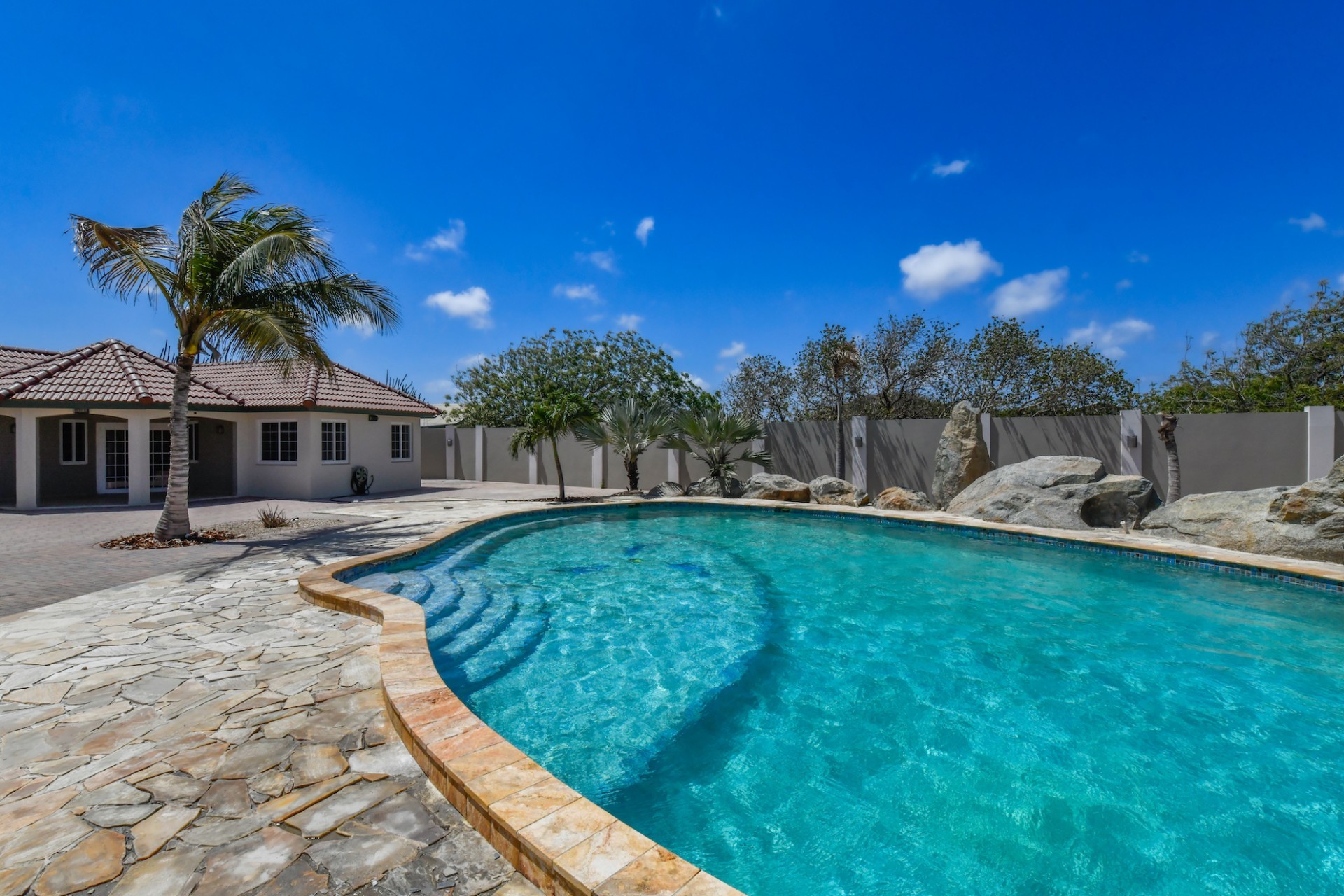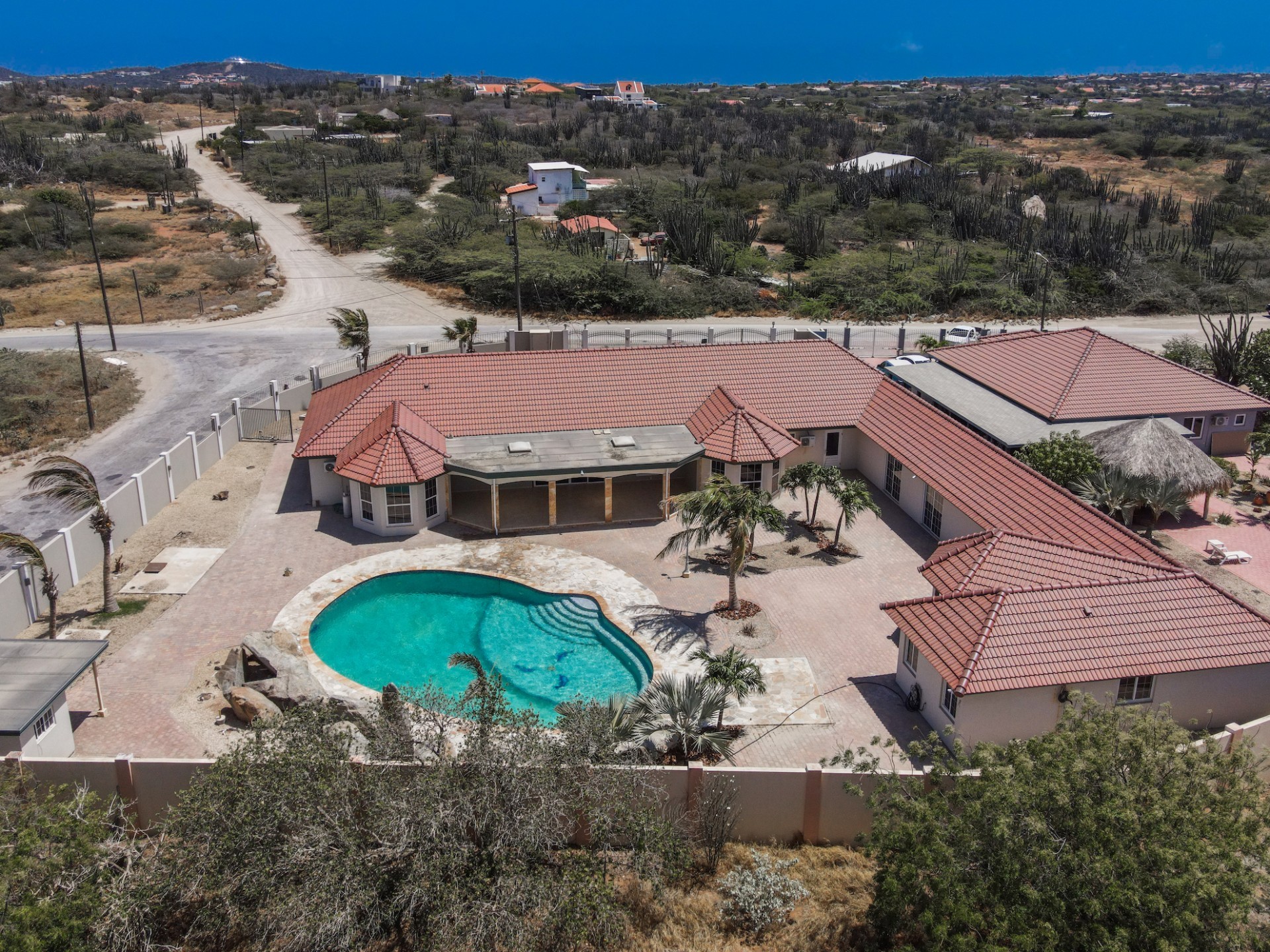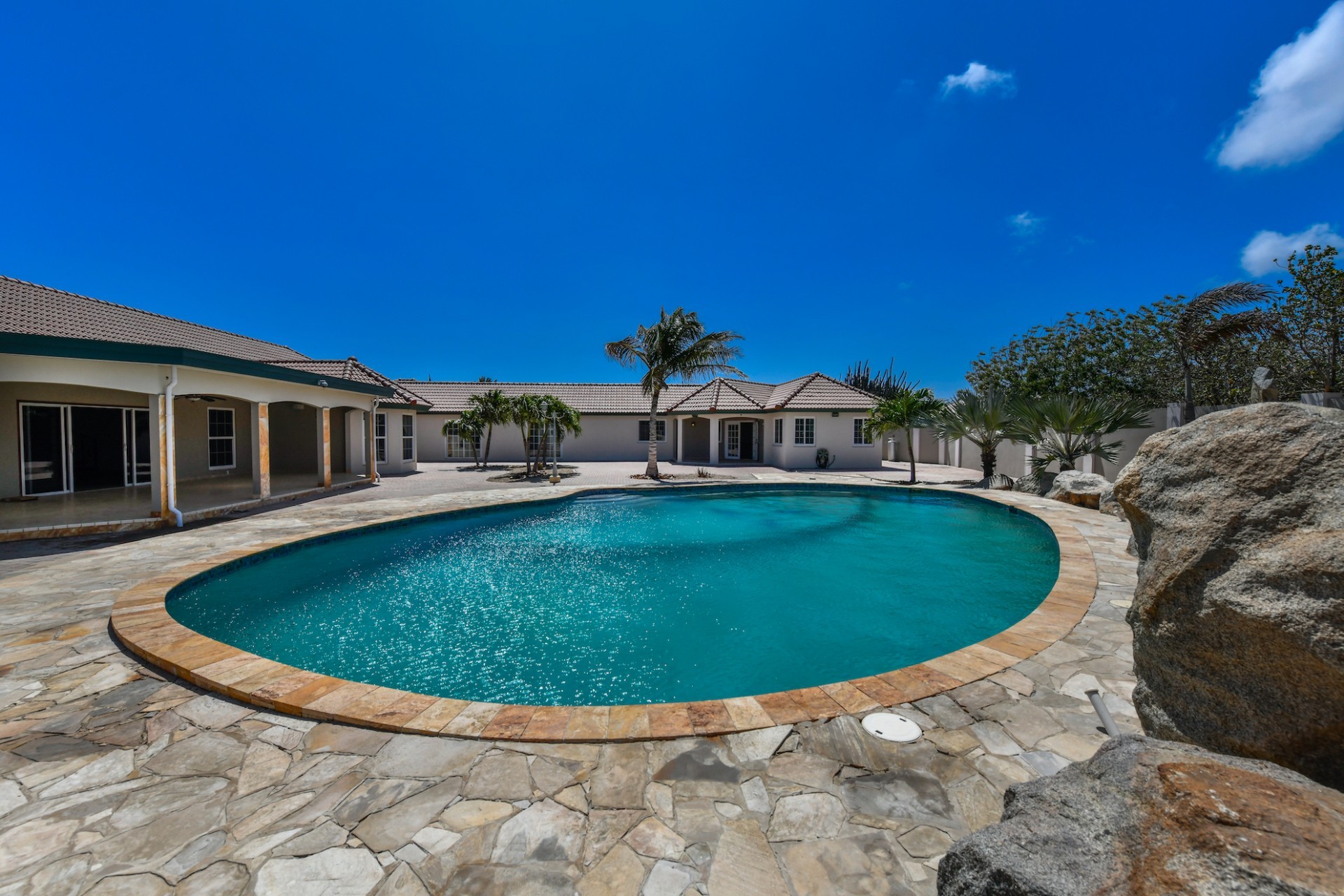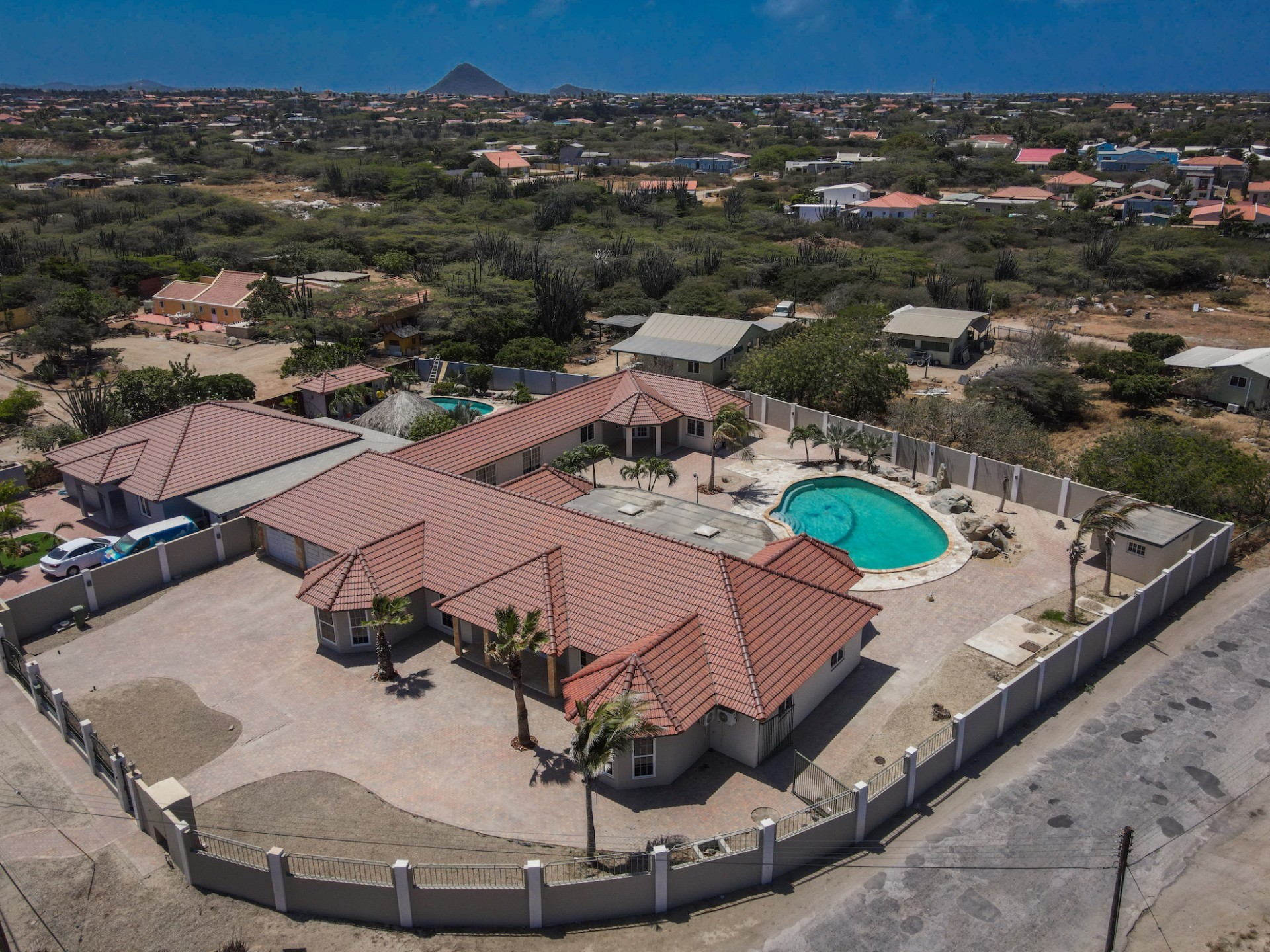 This spacious villa is a gem, the large swimming pool is the eye catcher of this beautiful property. The main house has 5 spacious bedrooms and 2.5 bathrooms. There is a separate guest house with 2 bedrooms and a bathroom. In the yard you will find an extra bathroom. The house is very centrally located in Seroe Janchi, North Aruba. The main house has an open floor plan, with a large fully equipped kitchen. On both sides of the living room you will find bedrooms. A spiral staircase takes you to a separate room where you have a beautiful view over the living room. Outside there is a covered patio with a lovely large swimming pool. A large garage connects the guest house with the main house. In the guest house you will find 2 bedrooms and 1 bathroom. On top of all this there is a storage room of 41m2 that can easily converted in a big office space. This beautiful property is build on 1464m2 property land with a build size of 562m2. Property highlights - 7 bedrooms - 3,5 bathrooms - very large pool - centrally located - guest house - 1464m2 property land - 562m2 build up size (338m2 house, 63m2 garage, 41 storage, 101m2 guest house) For more information or to schedule a viewing please contact Bibi Louwers: +297 569 7343 or [email protected]