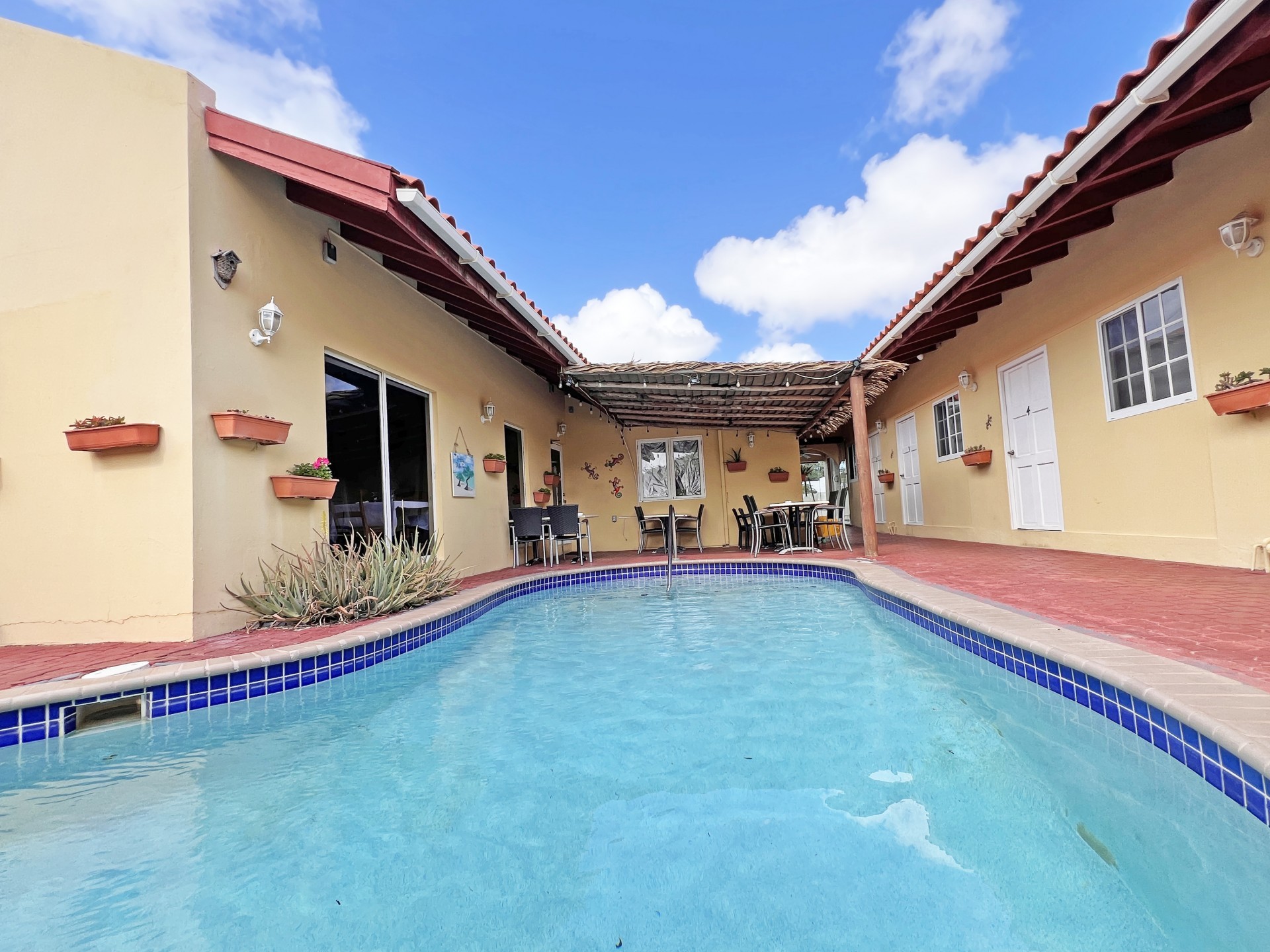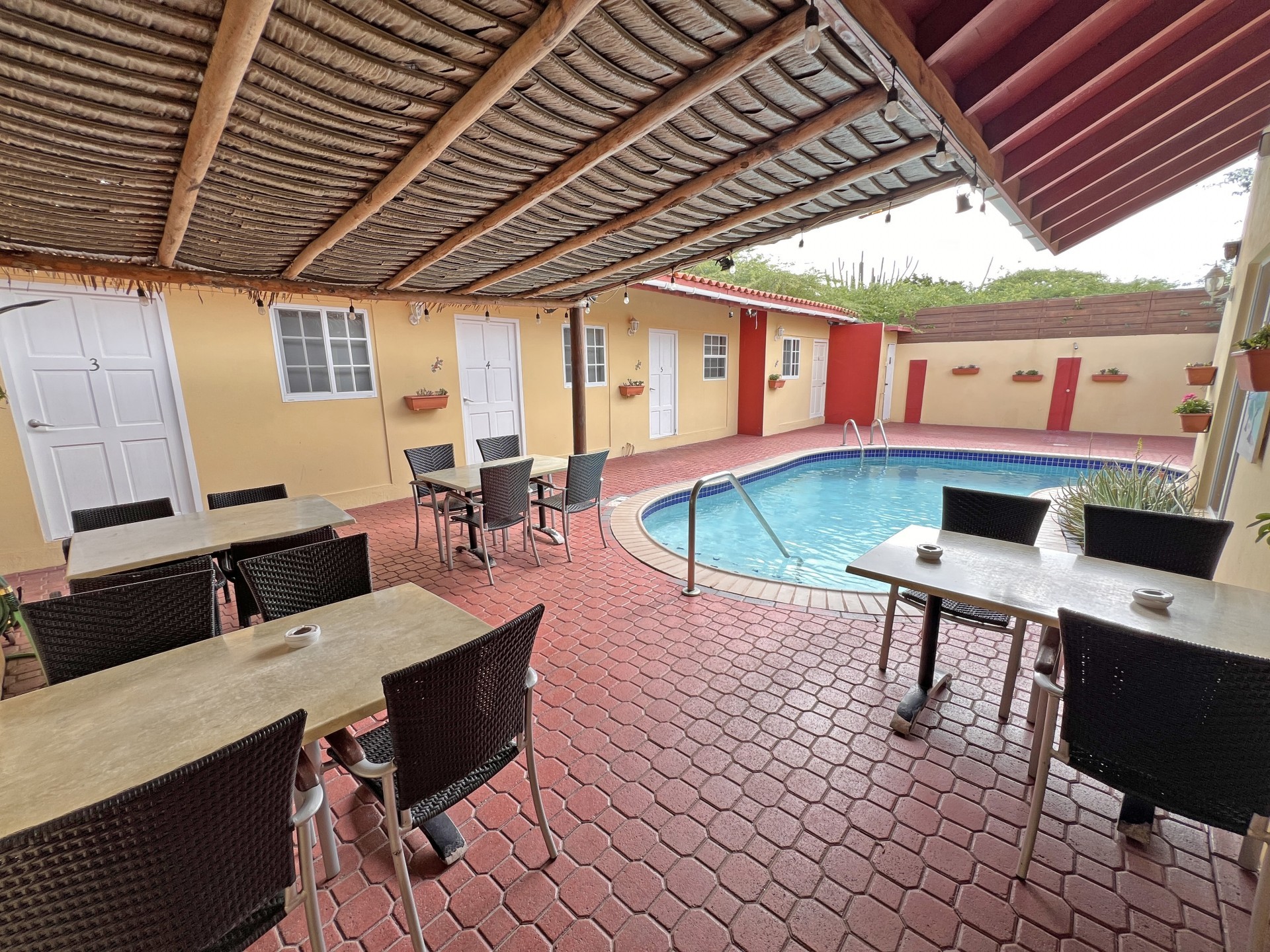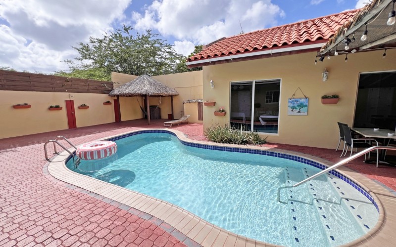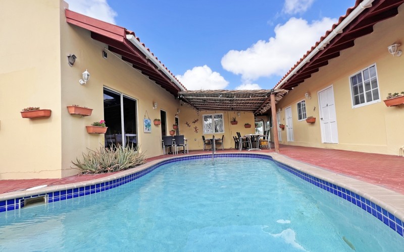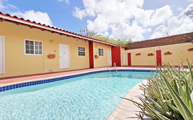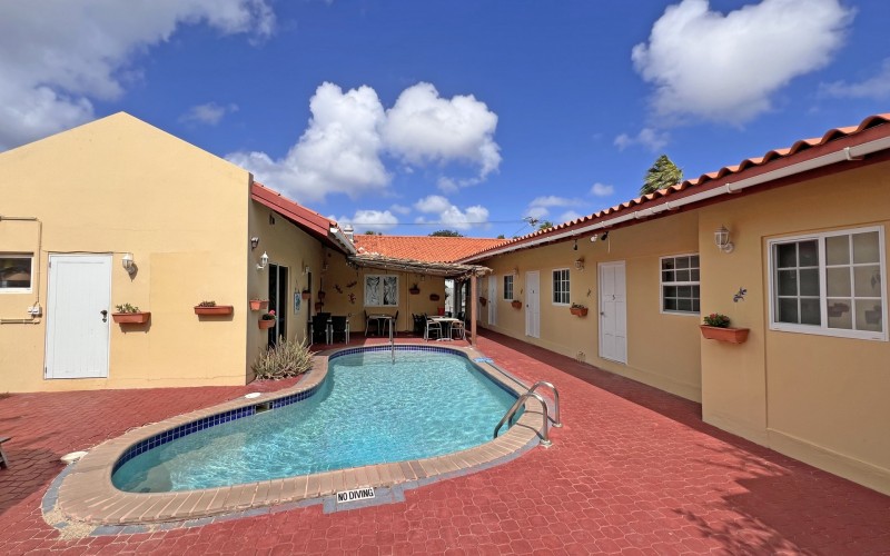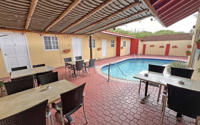 Rental Investment Near Aruba’s Top Beaches in Town This short-term rental investment opportunity is ideally located just minutes from one of Aruba’s most popular beaches and close to the airport, making it highly attractive to vacationers seeking convenience, accessibility, and proximity to major attractions. The location supports strong year-round tourist demand, a key driver for high occupancy and competitive nightly rates. Situated on 735 m² of land, this multi-unit property offers significant upside for investors willing to execute a light renovation and furniture upgrade. While the property is operational, it requires a facelift and updated furnishings, allowing a new owner to reposition the asset, increase nightly rates, and maximize returns. 'Generated renderings also added in the photo album for visuals and inspiration' Current configuration includes: • 9 rental units • 3 one-bedroom apartments • 6 studio units • 9 on-site parking spaces • Restaurant and dining area, offering potential for an additional revenue stream or guest amenity (kitchen equipment not included) • Large swimming pool with ample surrounding deck space, ideal for guest relaxation and social use • Outdoor bathroom facility for pool and common-area convenience • Gazebo and BBQ area, enhancing the guest experience and increasing booking appeal • Dedicated storage area for maintenance and operational needs • Terrace areas suitable for lounging and entertaining Flexible Layout With Strong Upside Potential Investors have two clear value-add strategies: 1. Reconfigure the property into 6 larger units, each featuring 2 bedrooms and 1 bathroom, targeting families and higher-spending tourist groups with increased nightly rates; or 2. Maintain the existing 9-unit layout, refresh interiors, optimize furnishings, and implement professional short-term rental management to drive higher occupancy and ADR. With the right upgrades and management strategy, this property has the potential to significantly improve average daily rates, guest reviews, and overall cash flow. Supported by Aruba’s resilient tourism market and limited availability of well-located multi-unit vacation rental properties, this asset represents a compelling value-add opportunity for investors seeking scalable short-term rental income and long-term appreciation. In walking distance from Surfside Beach and a couple blocks away from he best restaurants of Oranjestad like Barefoot, Reflections Beach & Pinchos. For information, viewings and to present it's full potential please contact Cado de Lannoy 📧