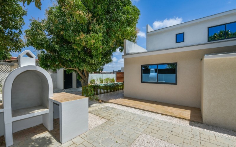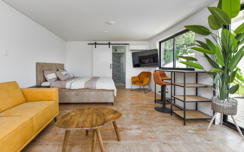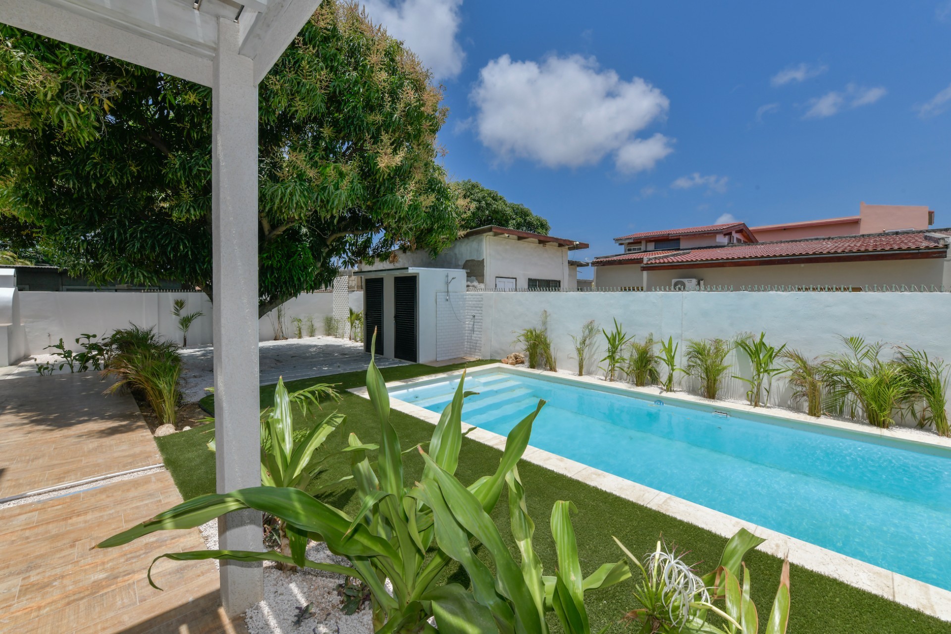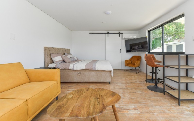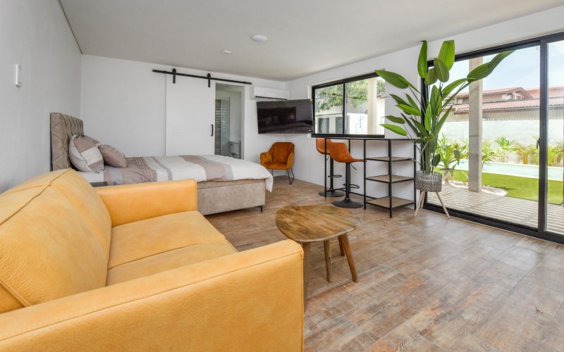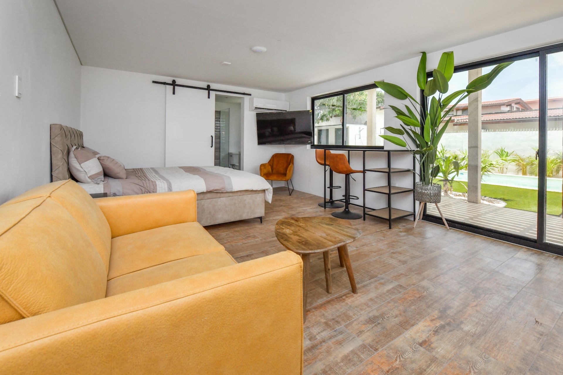 Spacious Studio Apartment, unit 2 Located on a 727m² property, this beautiful and well constructed complex features a main building with 10 high-end studio apartments and 1 two bedroom apartment. Apartment 2, situated on the ground floor, is a 59m² studio with a practical layout. Inside, you will find a premium quality European kitchen complete with all appliances, all bedroom and living room furniture and light fixtures and a private Grof by Kohler luxury bathroom. The apartment includes a 23.5m² well positioned outdoor terrace, positioned at the front of the building, providing a comfortable and relaxing outdoor space. The building is constructed with solid concrete blocks and columns, ensuring durability. The walls are finished with A1 plaster and paint. The apartment has a modern European and refined look, featuring wooden sliding doors and black aluminum-framed double glass isolated windows. The flooring is covered with high-quality Brazilian ceramic tiles, adding to the overall elegance. A split-unit air conditioner efficiently cools the entire apartment. The communal garden offers various well-designed amenities, including all outdoor furniture, swimming pool and pool deck and a barbecue area with pergola. Additionally, the outdoor space features a communal washer and dryer, extra seating areas, walkways, garden lighting, and lush greenery with plants and trees, creating a relaxing atmosphere. The apartment is located on a spacious paved road in center Oranjestad: Rudolf Arendsstraat 42. Just a few minutes' drive from the cruiseterminal, beaches and and restaurants. It's all conveniently nearby, making this an ideal place to live or enjoy a holiday in your second home. Key Features: 1 studio apartment Property land Close proximity to Oranjestad Spacious build-up area: 59m² including 23.5m2 outside terrace Community amenities include pool, BBQ area and sitting areas Low monthly HOA fee Turn key, including all premium European kitchen, furniture and appliances Don’t miss out on this unique opportunity! Contact us today to learn more or schedule a visit! Bibi Louwers +2975697343